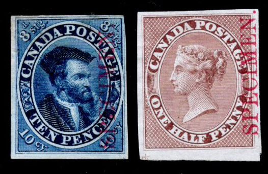 10d and ½d Pence Issues, with Unitrade #s 7Pi (on India paper in colour of issue, with vertical SPECIMEN overprint in carmine, with very light staining on back and just cut into at top, fine) and 8TCiii (on India paper in deep rose, with vertical