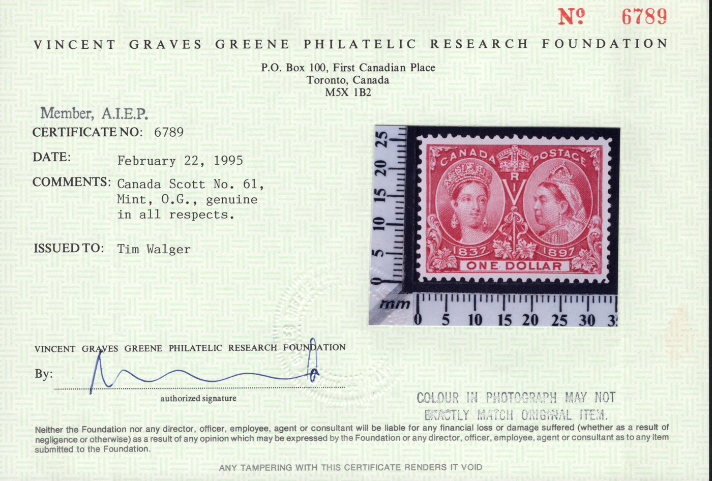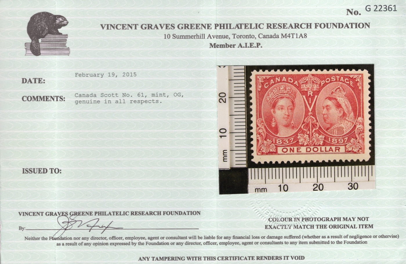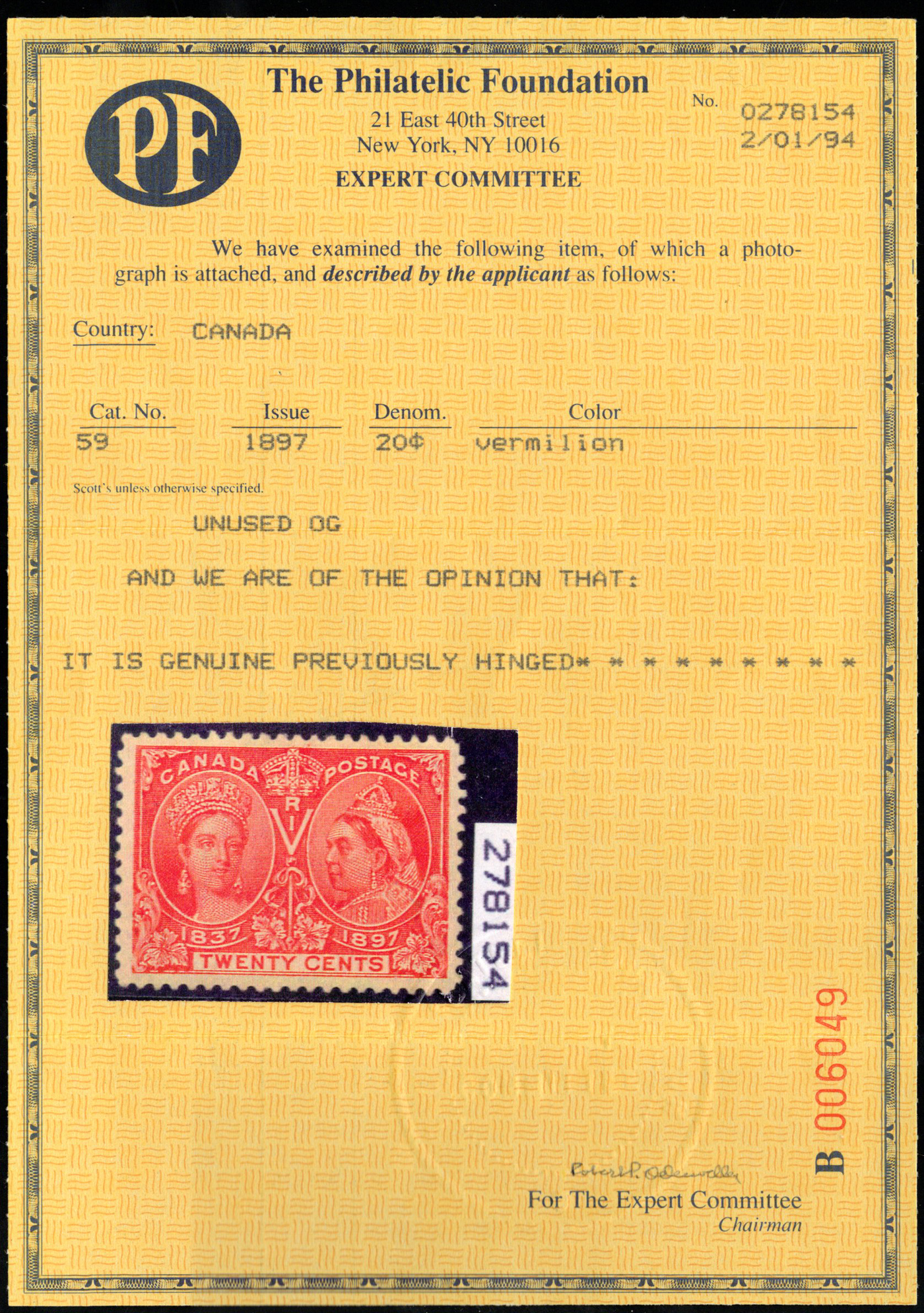 Jubilee, mint lightly hinged, with deep rich colour a well centered and very fine stamp. Accompanied by a 1995 Greene Foundation certificate. (Scan 1)
