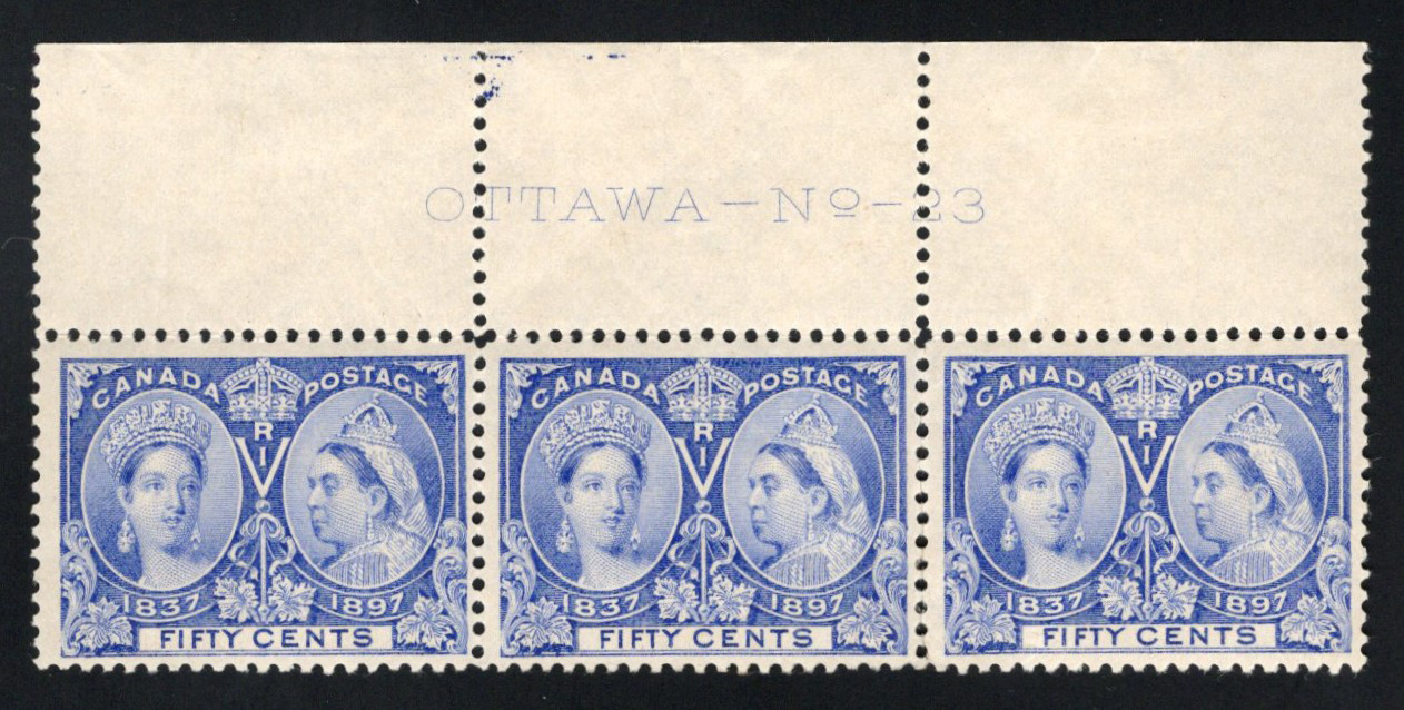 Ultramarine Jubilee, a mint plate strip of 3, with full and centered plate 23 inscription in margin. The left stamp is never hinged, other two hinged, overall fine. Catalogue value is for 3 singles only, and does not include a premium for the
