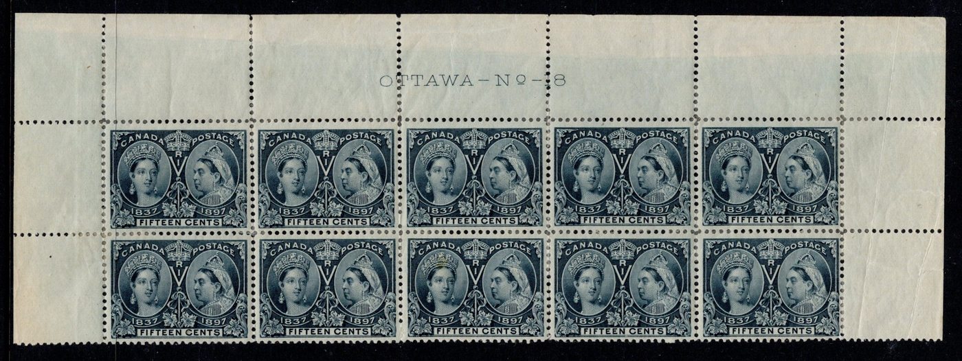 Jubilee, a mint plate block of 10, with full plate 18 inscription in top margin. All stamps are hinged to rejoin some separation, overall fine-very fine. Catalogue value is for 10 singles only, and does not include a premium for the scarce plate