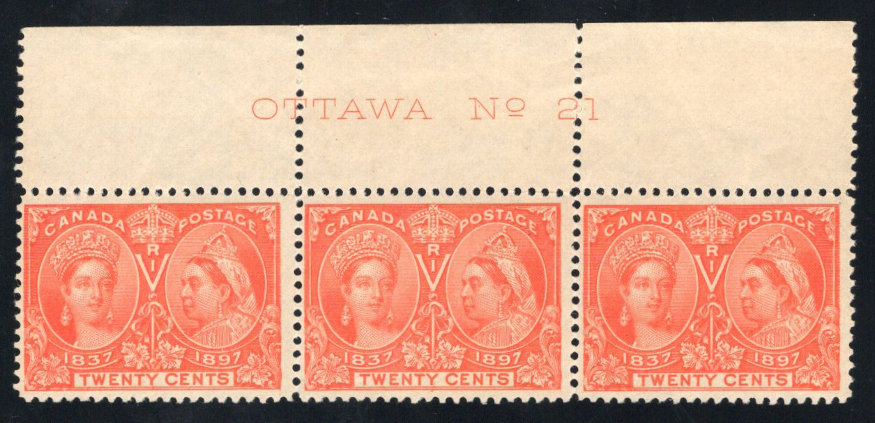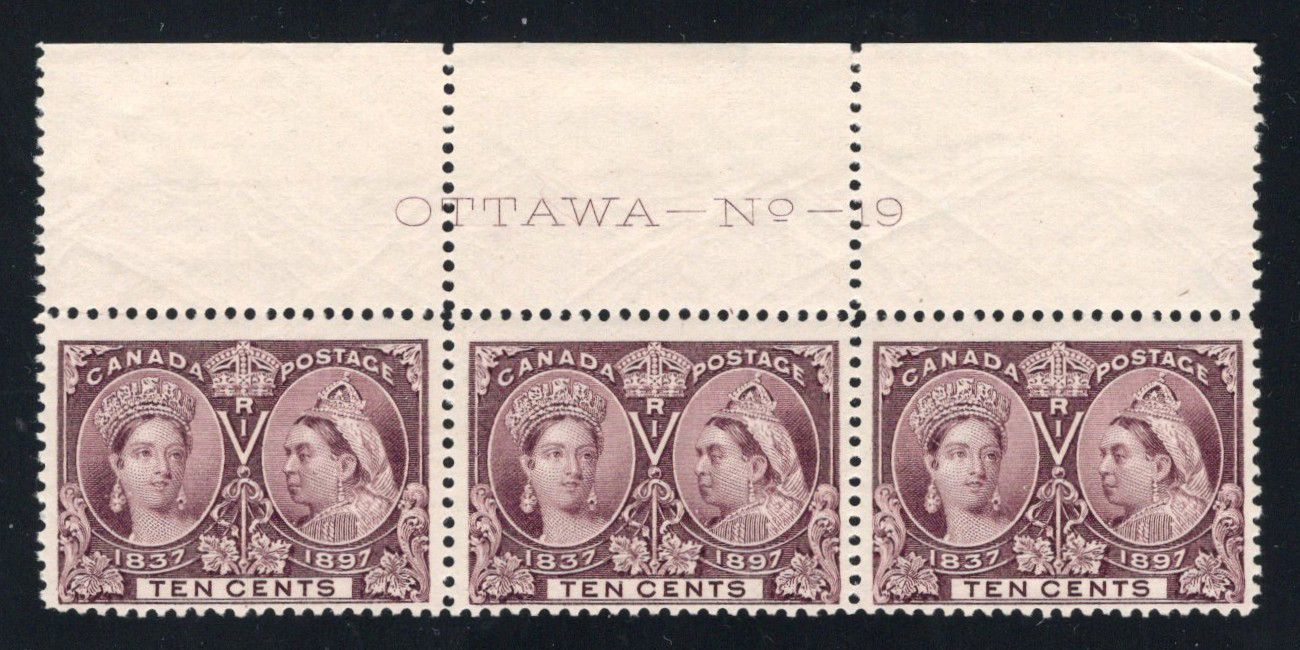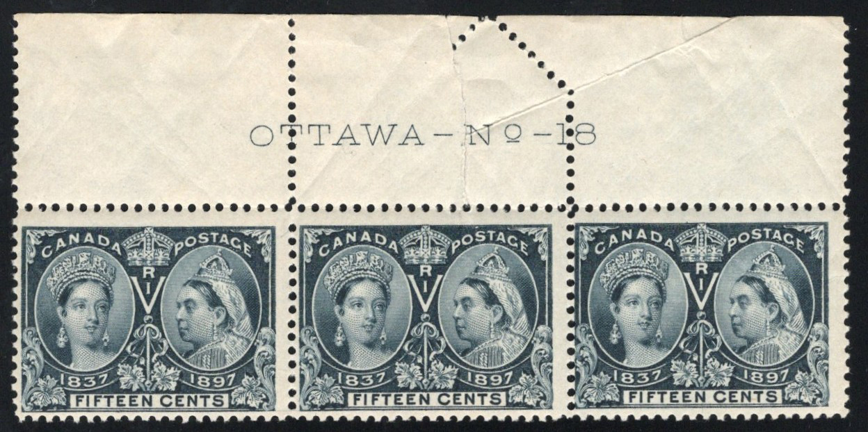 Jubilee, with Pre-Perforation Fold, a mint plate strip of 3, with full and centered plate 18 inscription in margin. The top margin was folded before the perforation process, resulting in a mis-perforation. All three stamps are never hinged and