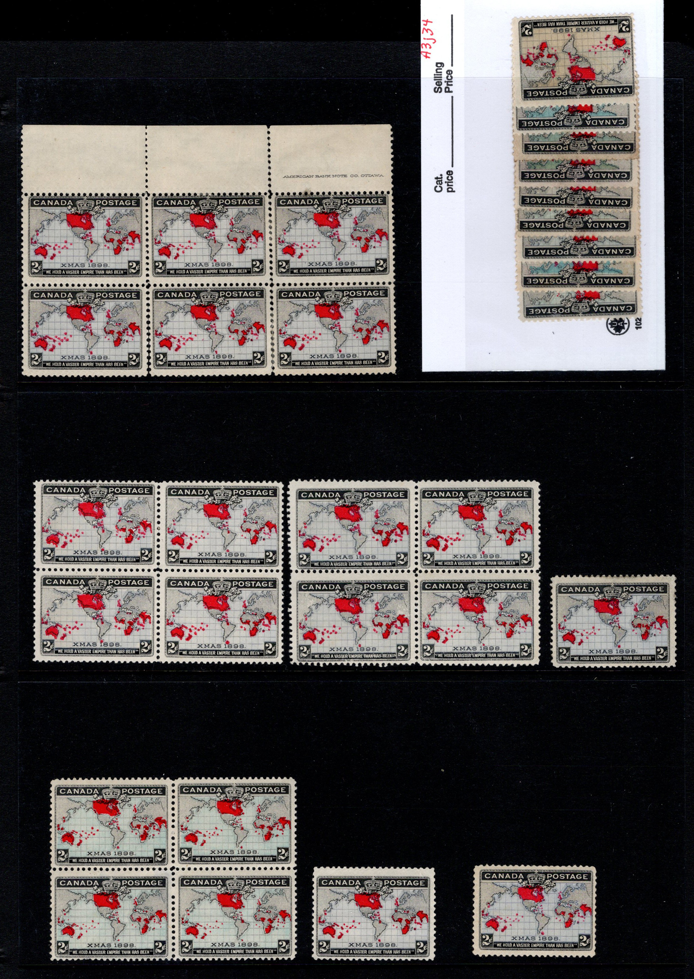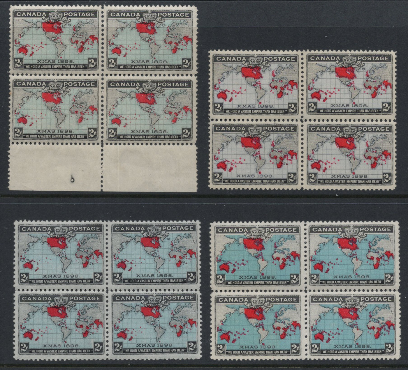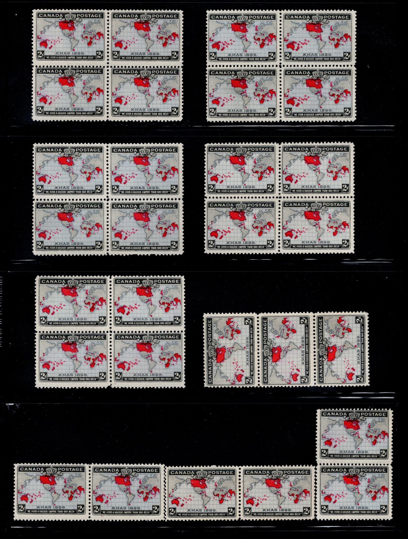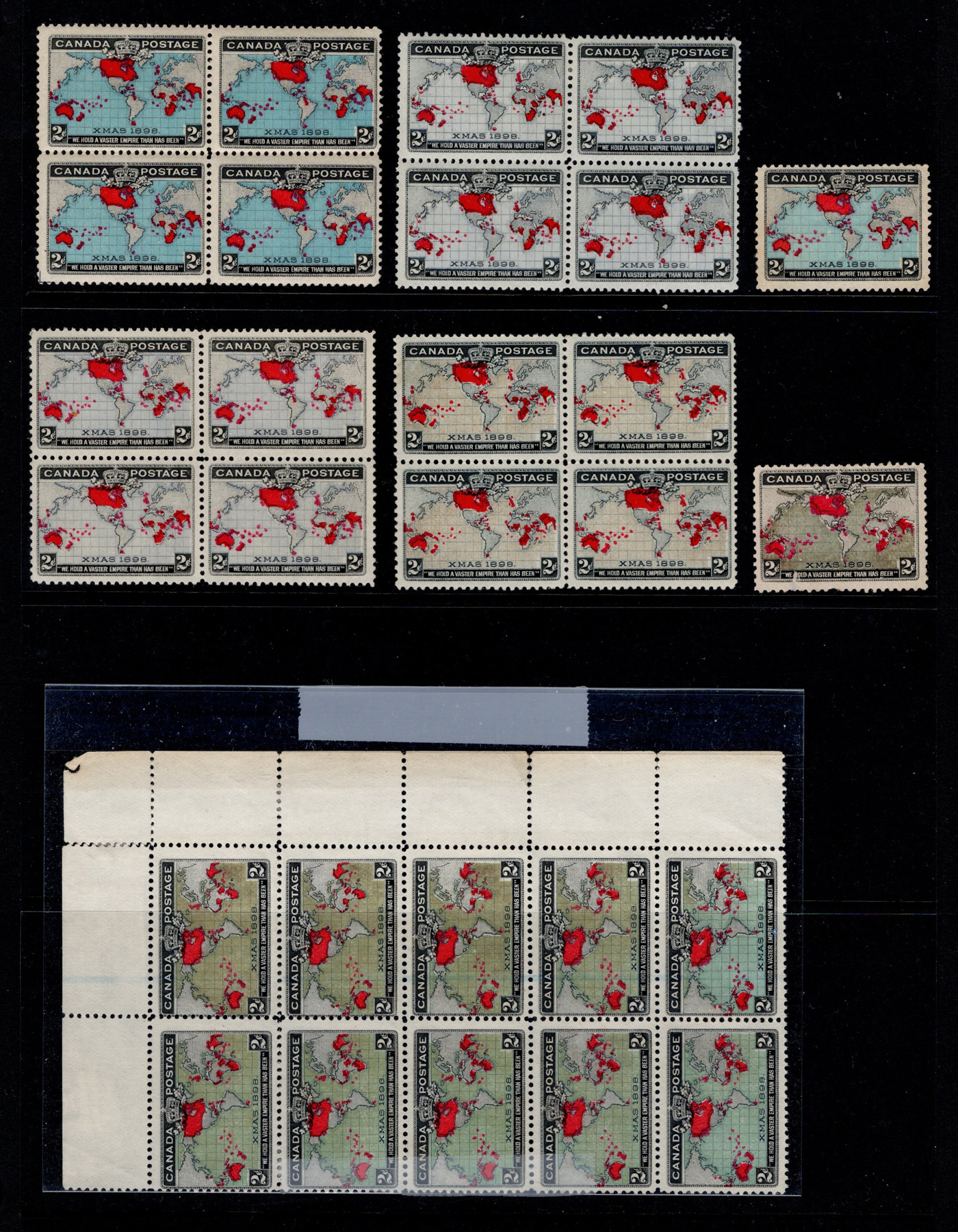 265 ng 85 image1898 2c Black, Lavender and Carmine Map, a group of 29 unused (no gum) stamps in 5 blocks of four, 3 pairs and one strip of three. There are a few separations here and there, still a nice group with many very fine centered stamps.