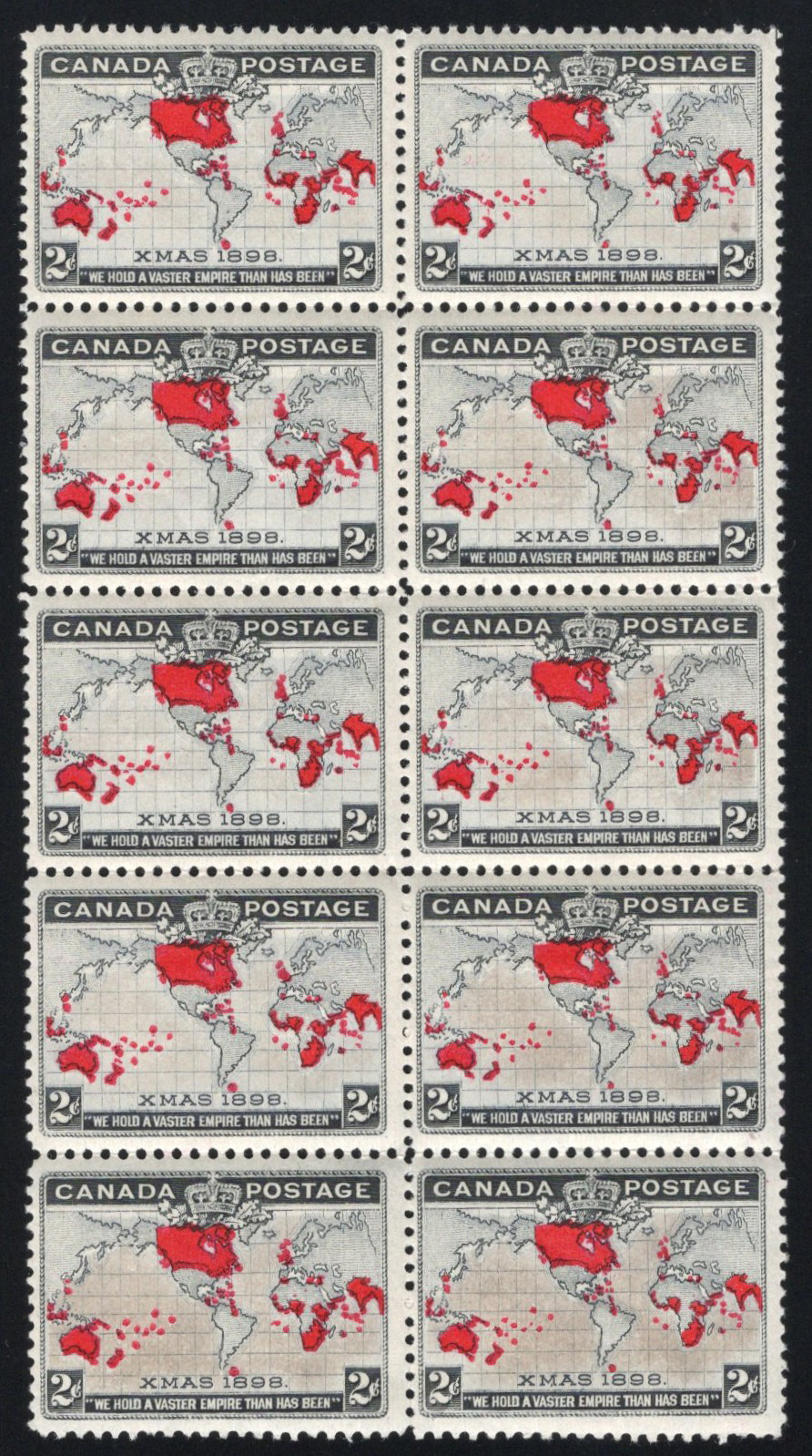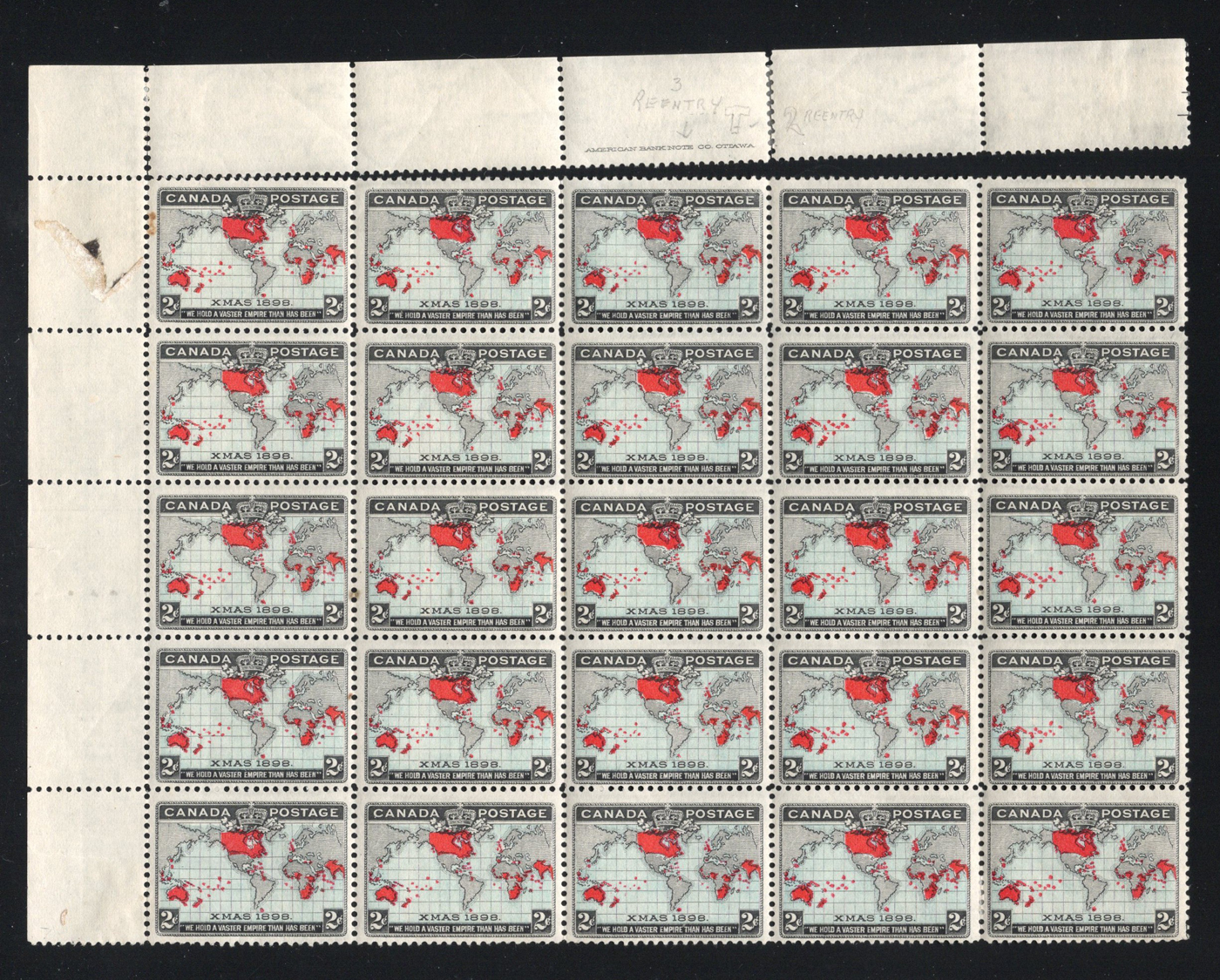 264 nh 85 image1898 2c Black, Lavender and Carmine Map, a mint never hinged block of 10, a few stamps have minor gum bends, still very fine. Also a mint never hinged upper left corner block of 25, with sheet selvedge showing a plate imprint above the third stamp, also a pencil notation about there being a re-entry. Separation of top selvedge (barely holding on), and stain affecting one stamp, still fine overall. (Scan 1) (Scan 2) (All Scans)