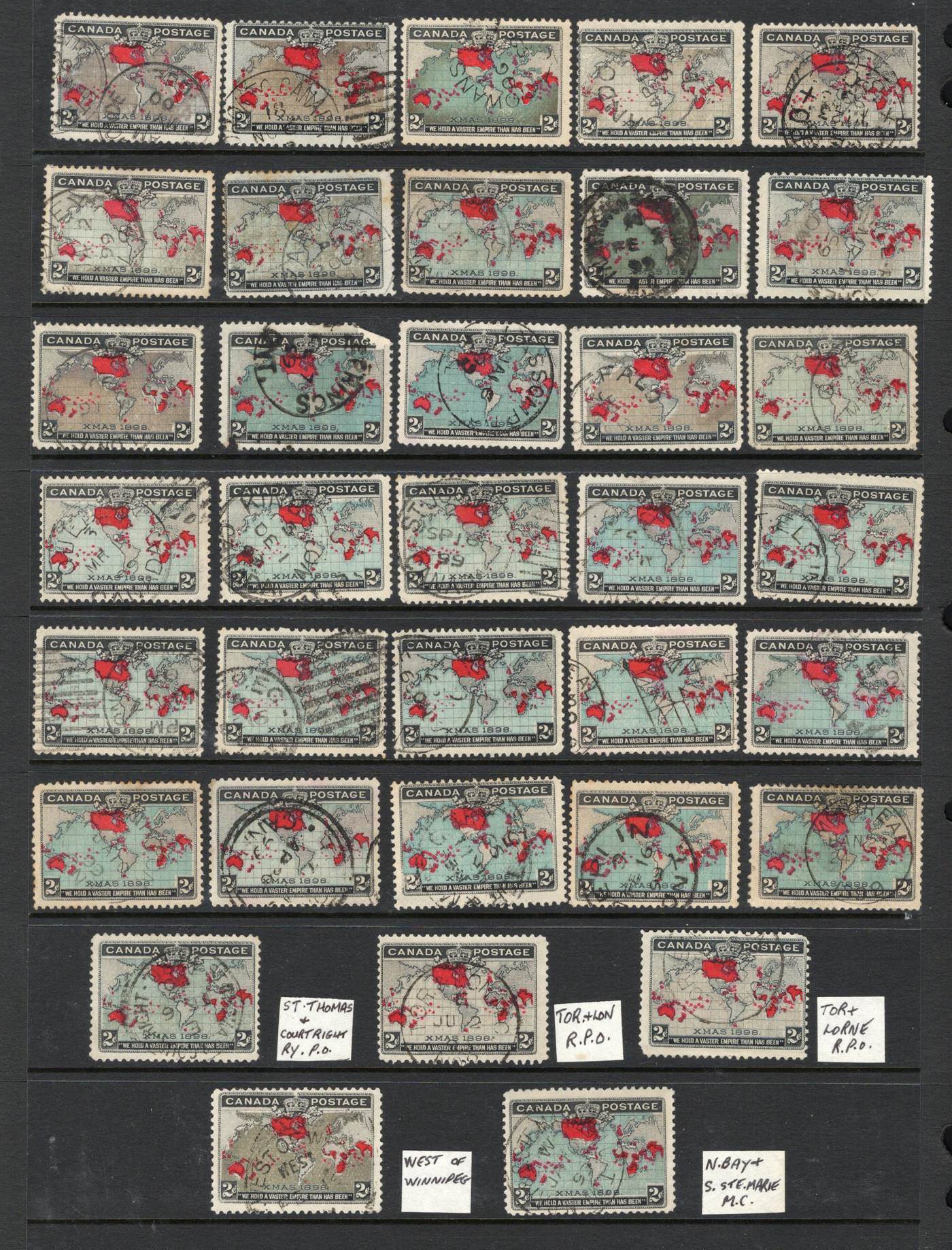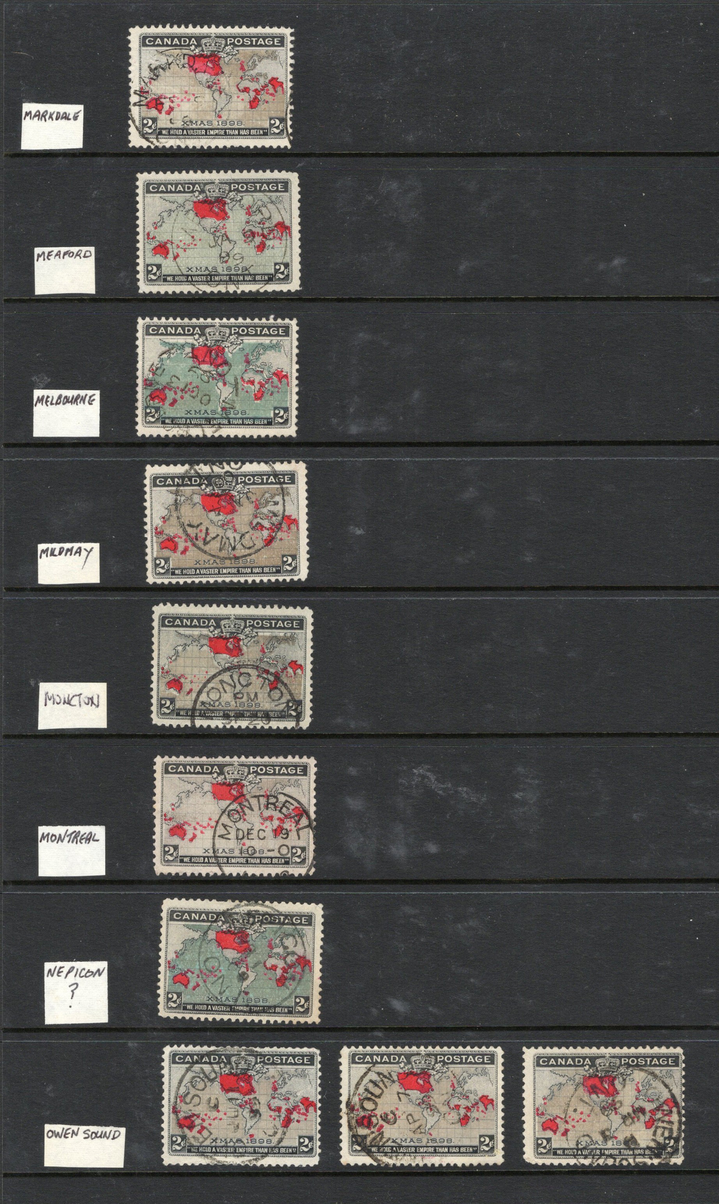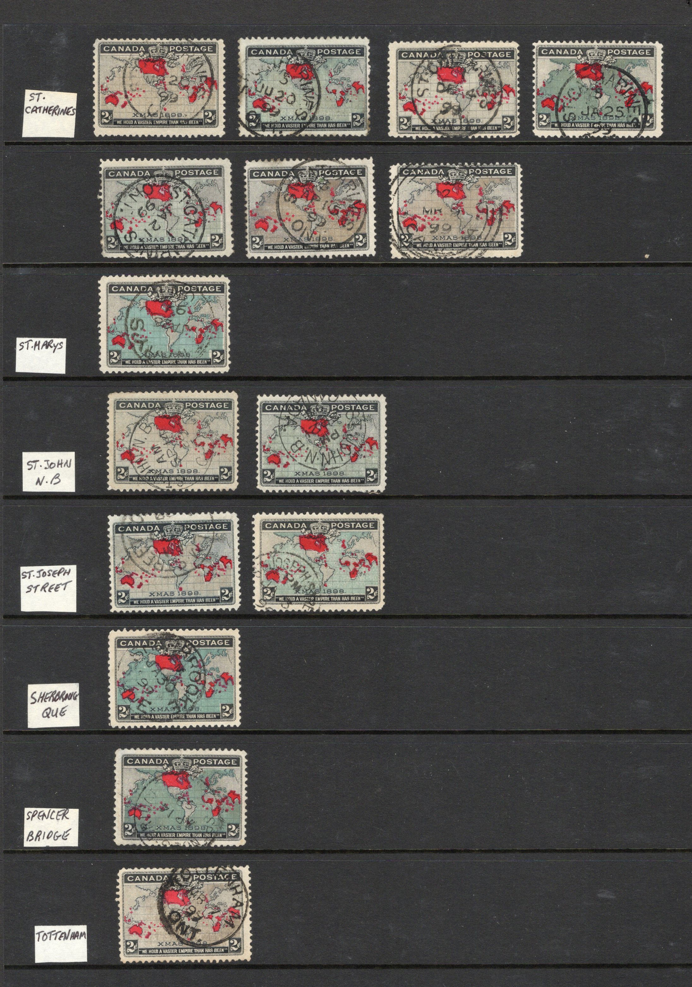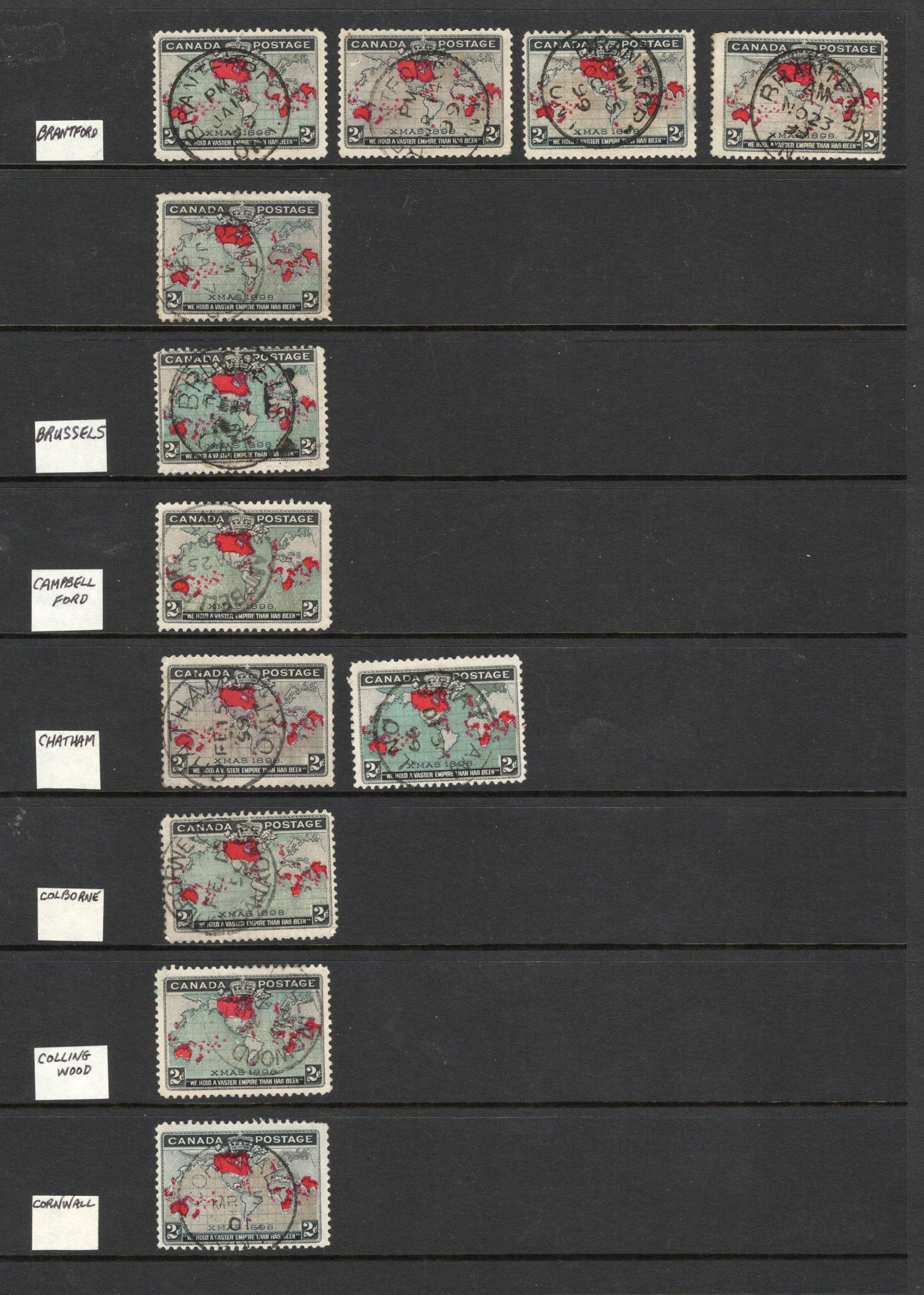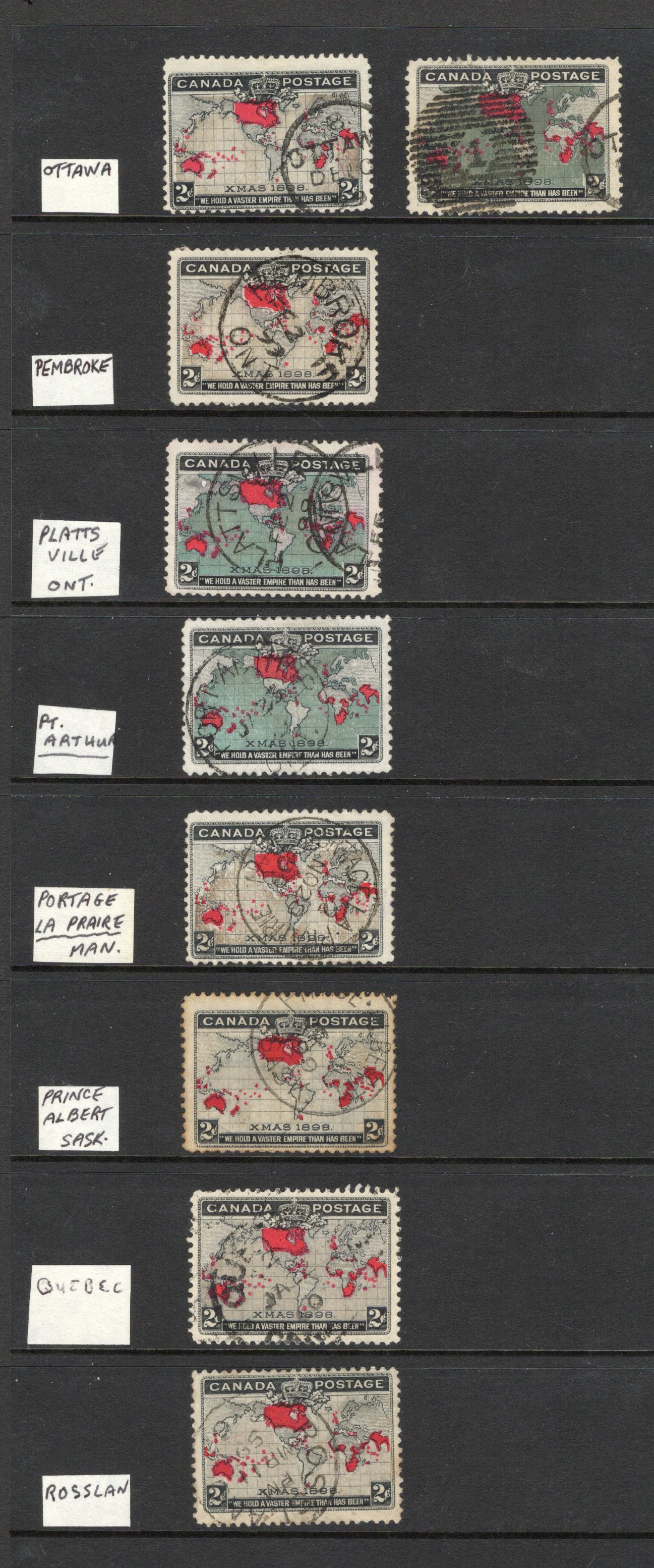 268 O 85, 86 imageCollection of 1898 2c Maps with C.D.S. Town Postmarks, with 114 stamps, all neatly displayed on 8 black stock pages, sorted alphabetically by town name from across the country, and includes some R.P.O. strikes. About 75 of the stamps are socked on the nose and fully dated, so a great lot for the postmark collector or Map student as well. Overall fine to very fine. (Scan 1) (Scan 2) (Scan 3) (Scan 4) (Scan 5) (Scan 6) (Scan 7) (Scan 8) (All Scans)