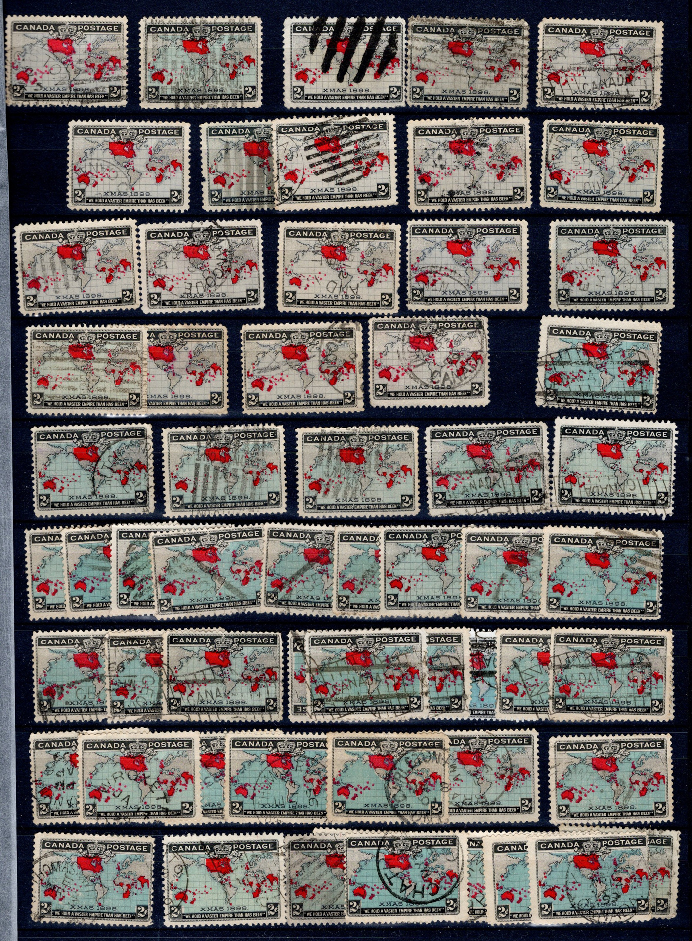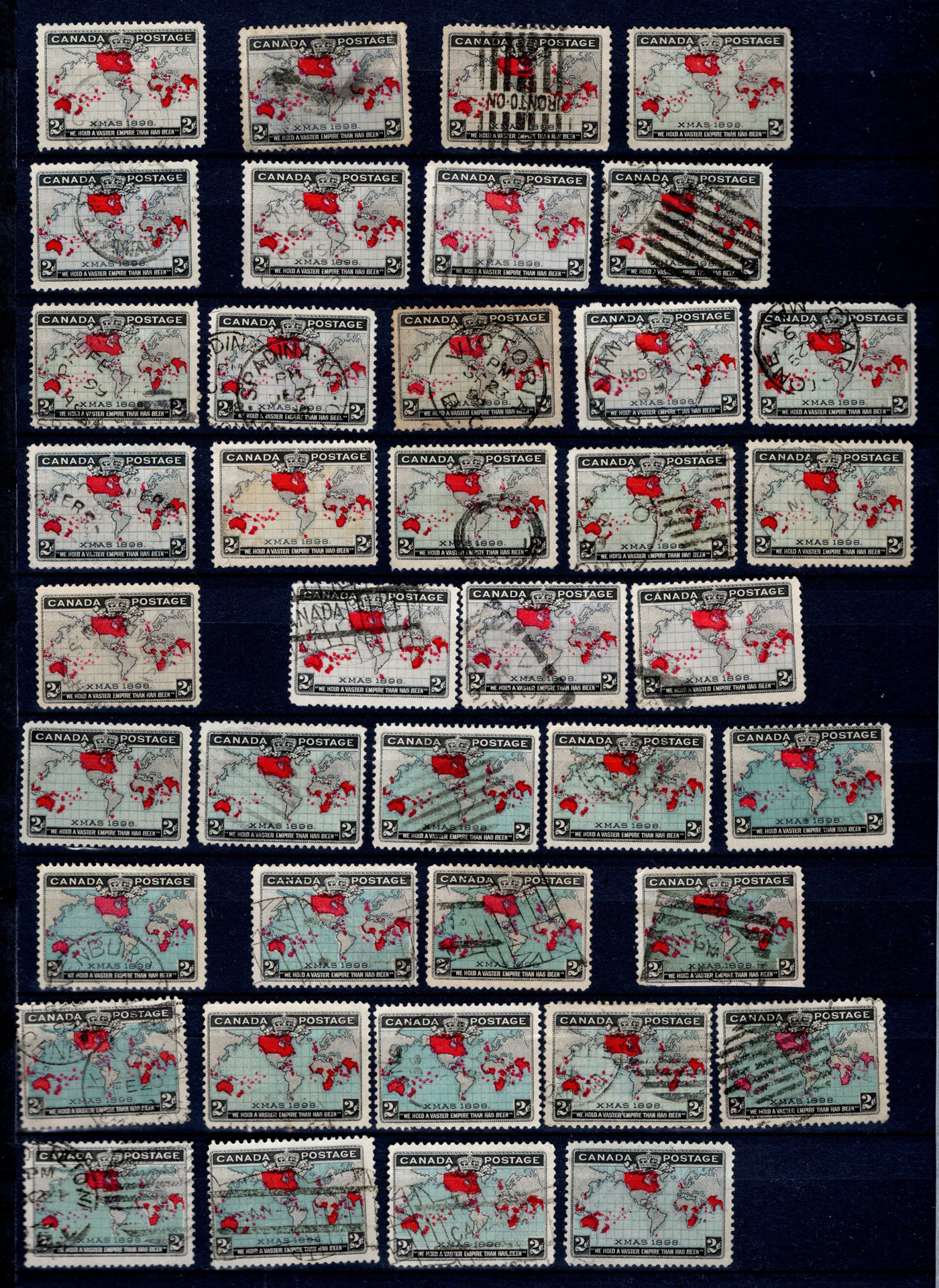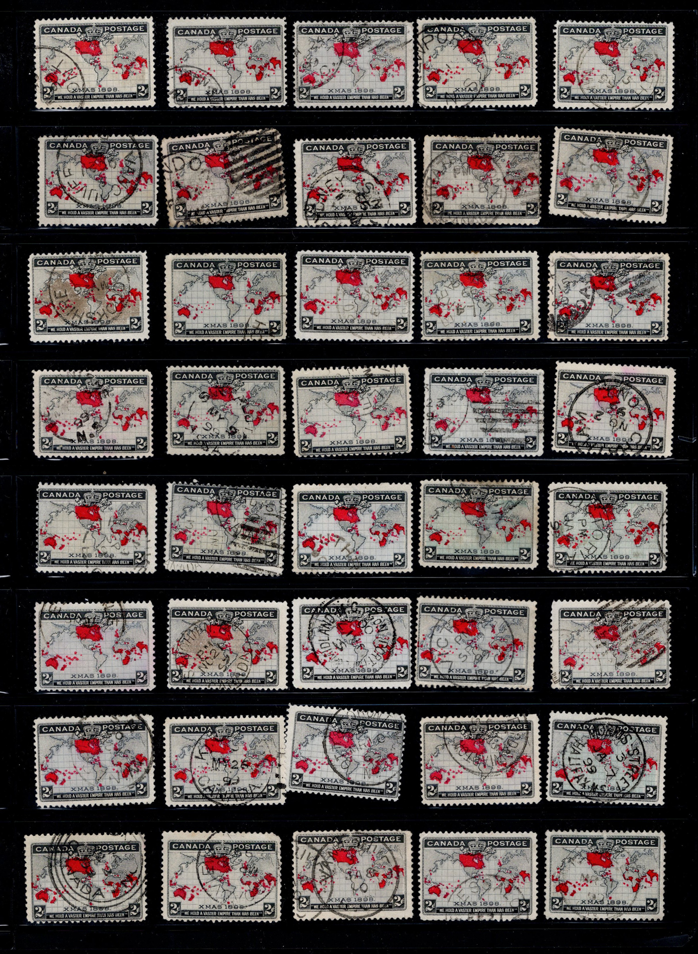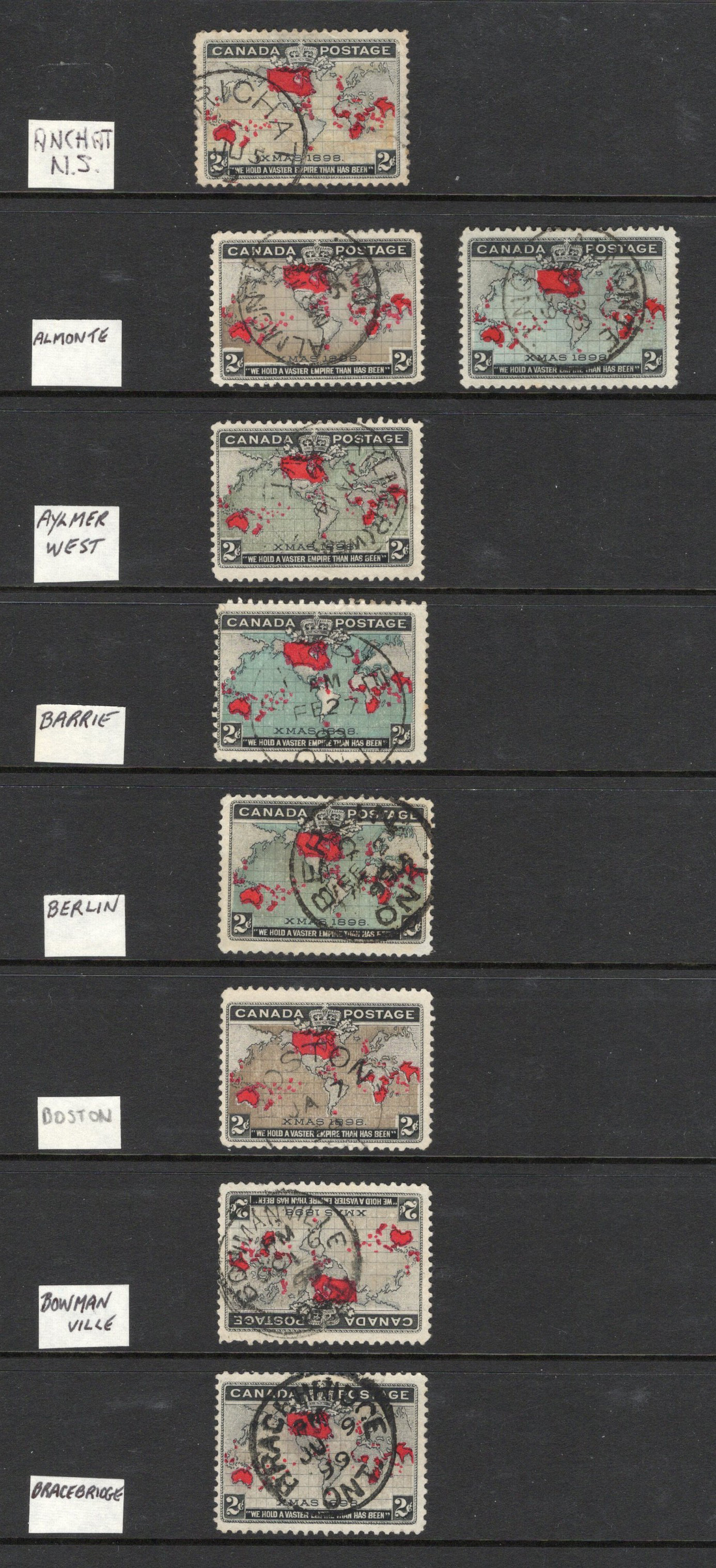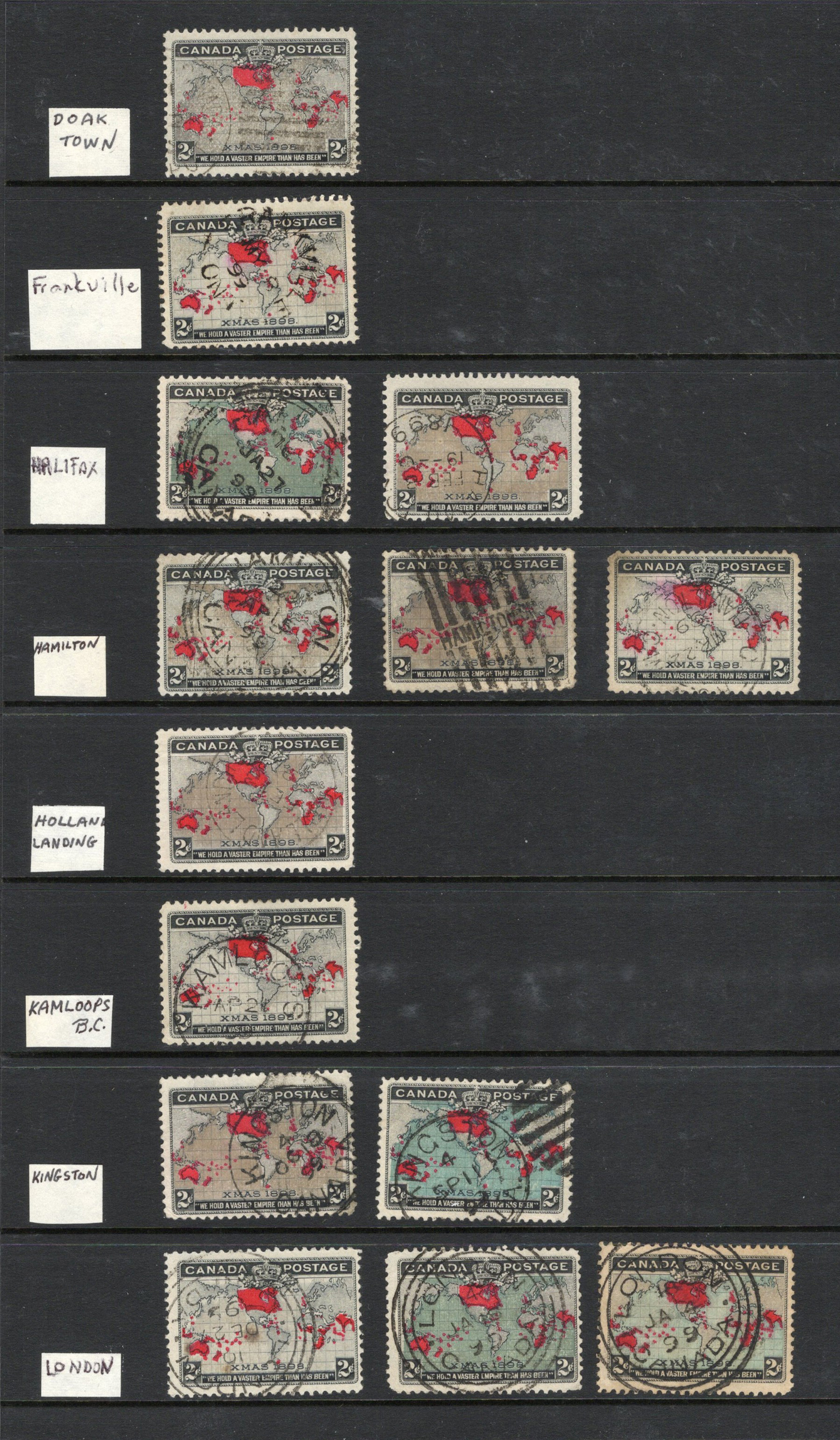 268 O 85, 86 imageCollection of 1898 2c Maps with C.D.S. Town Postmarks, with 114 stamps, all neatly displayed on 8 black stock pages, sorted alphabetically by town name from across the country, and includes some R.P.O. strikes. About 75 of the stamps are socked on the nose and fully dated, so a great lot for the postmark collector or Map student as well. Overall fine to very fine. (Scan 1) (Scan 2) (Scan 3) (Scan 4) (Scan 5) (Scan 6) (Scan 7) (Scan 8) (All Scans)