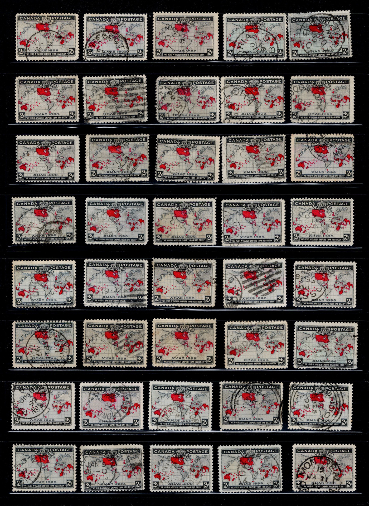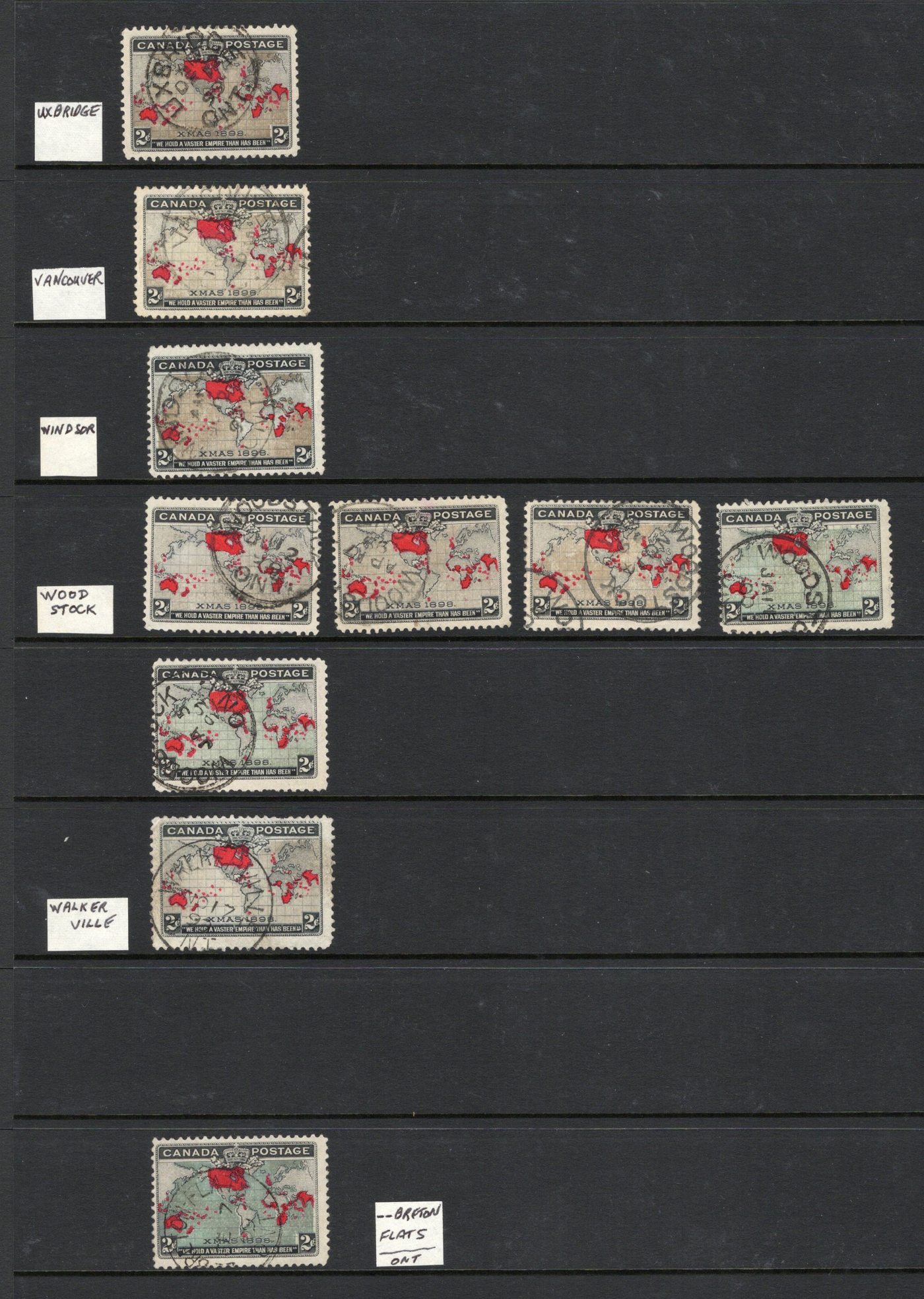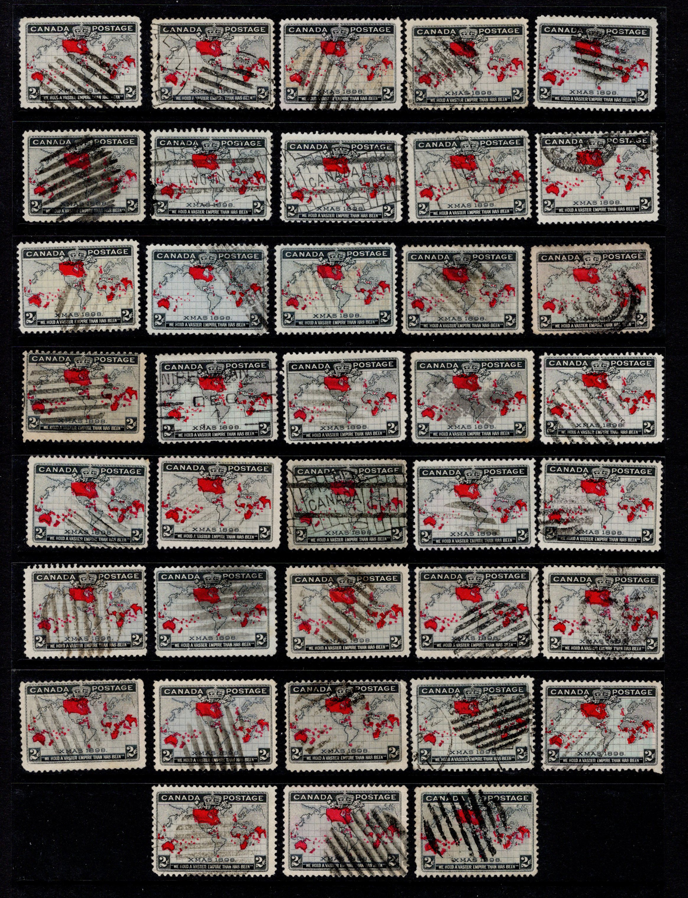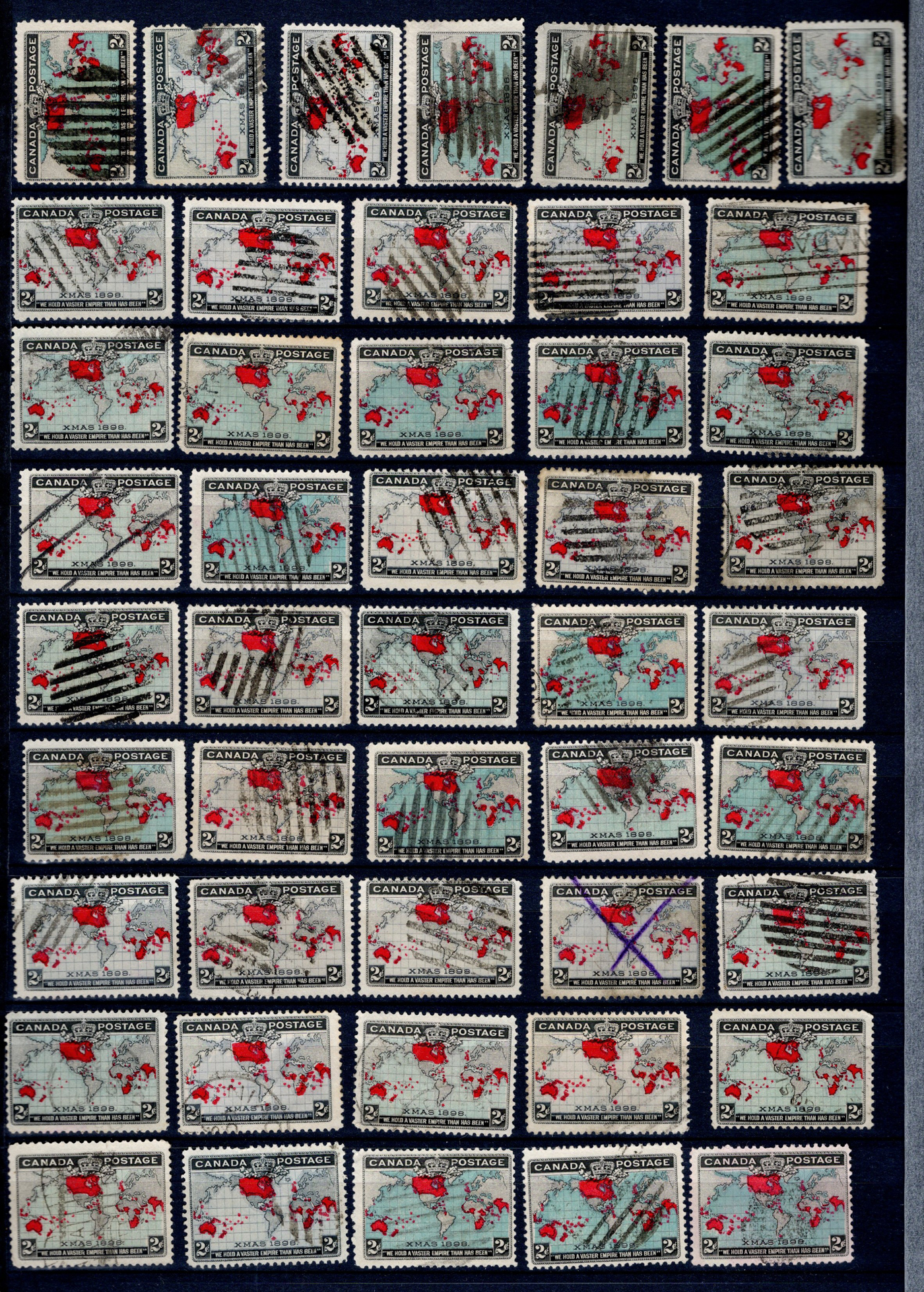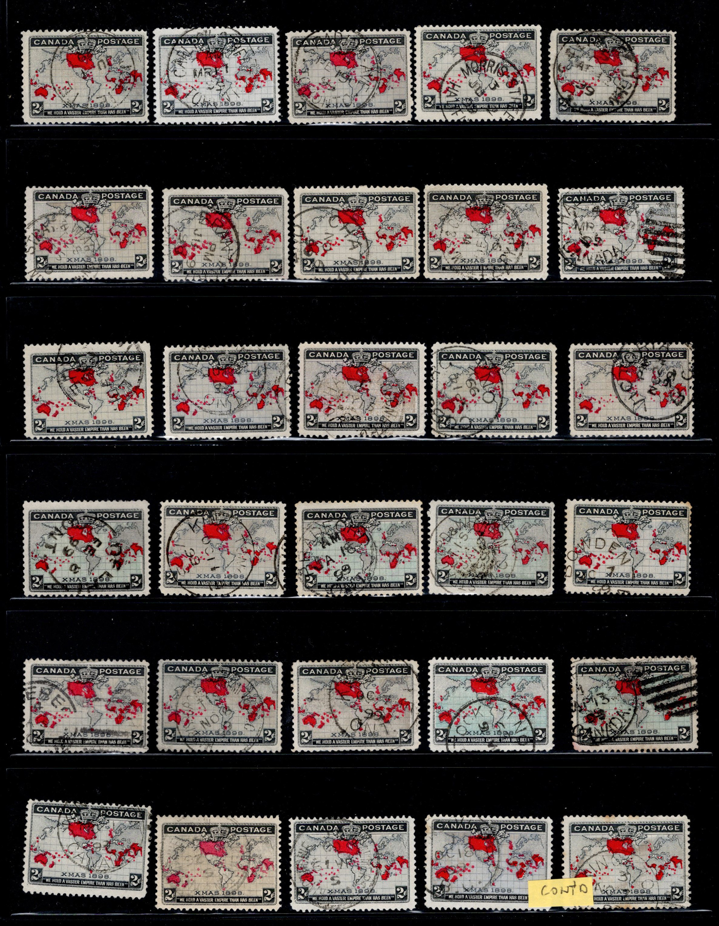 268 O 85, 86 imageCollection of 1898 2c Maps with C.D.S. Town Postmarks, with 114 stamps, all neatly displayed on 8 black stock pages, sorted alphabetically by town name from across the country, and includes some R.P.O. strikes. About 75 of the stamps are socked on the nose and fully dated, so a great lot for the postmark collector or Map student as well. Overall fine to very fine. (Scan 1) (Scan 2) (Scan 3) (Scan 4) (Scan 5) (Scan 6) (Scan 7) (Scan 8) (All Scans)