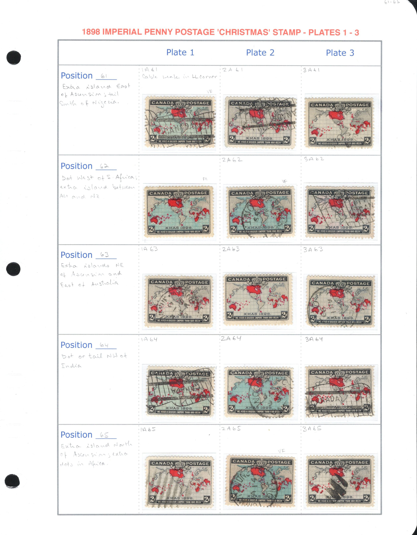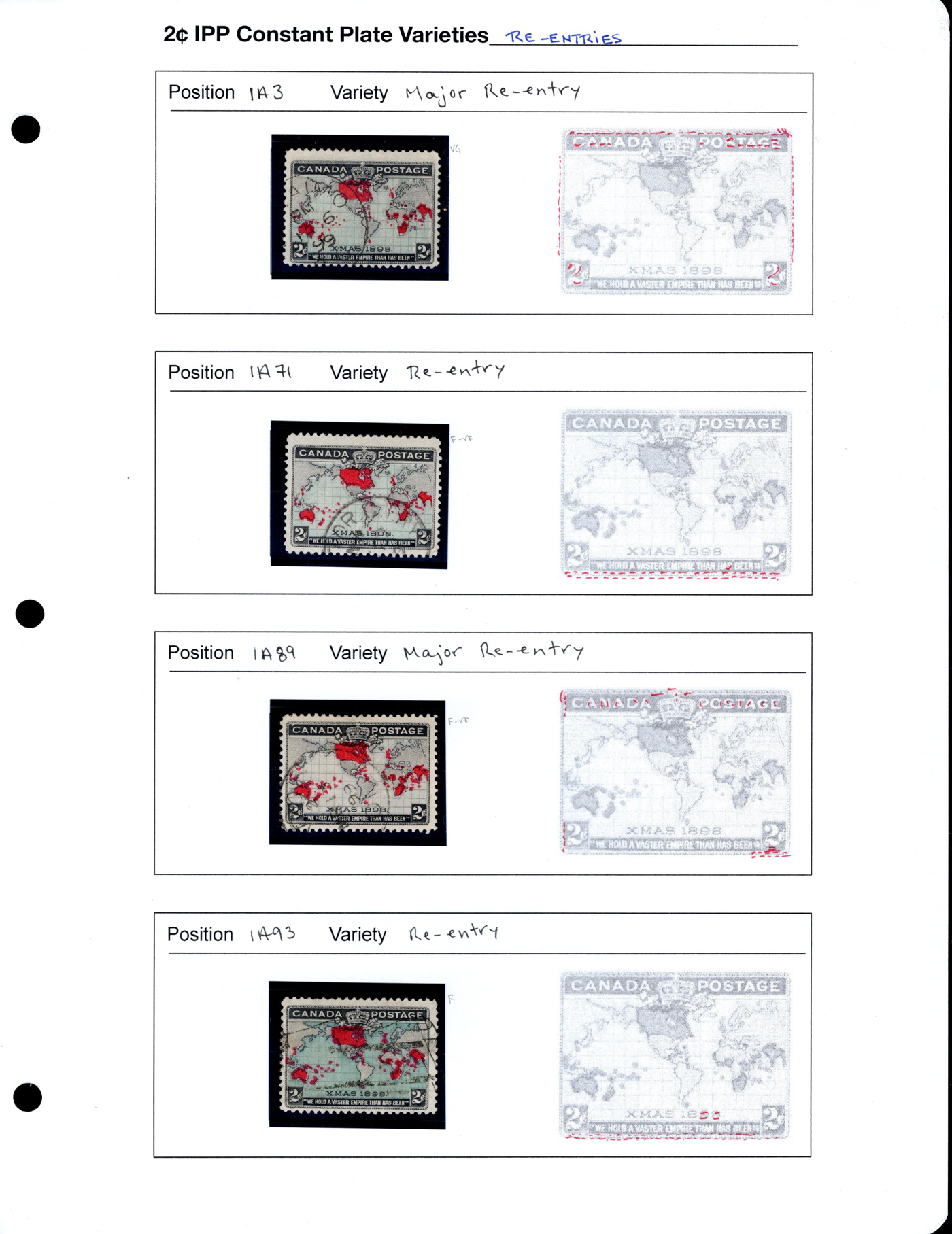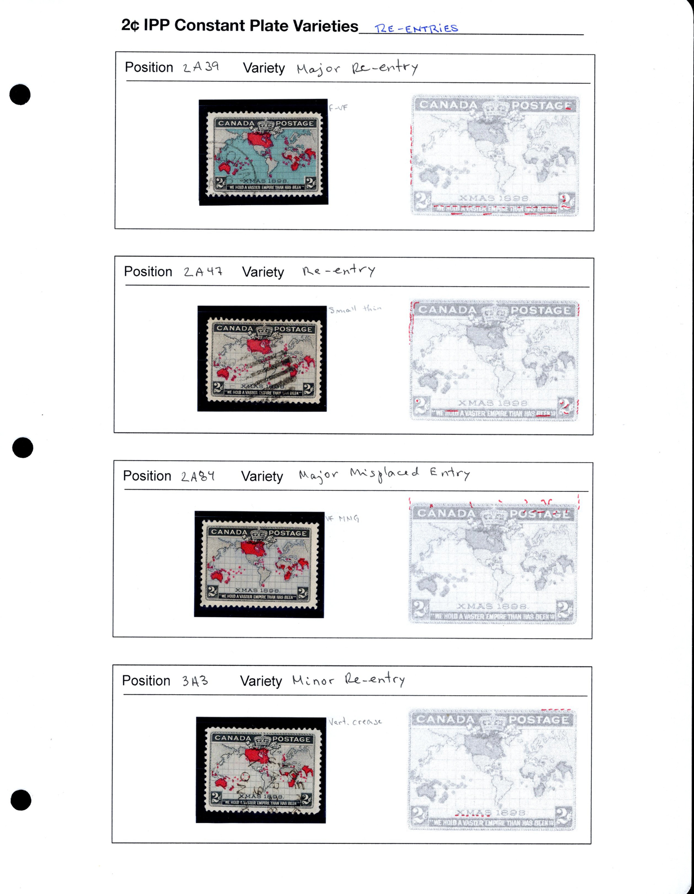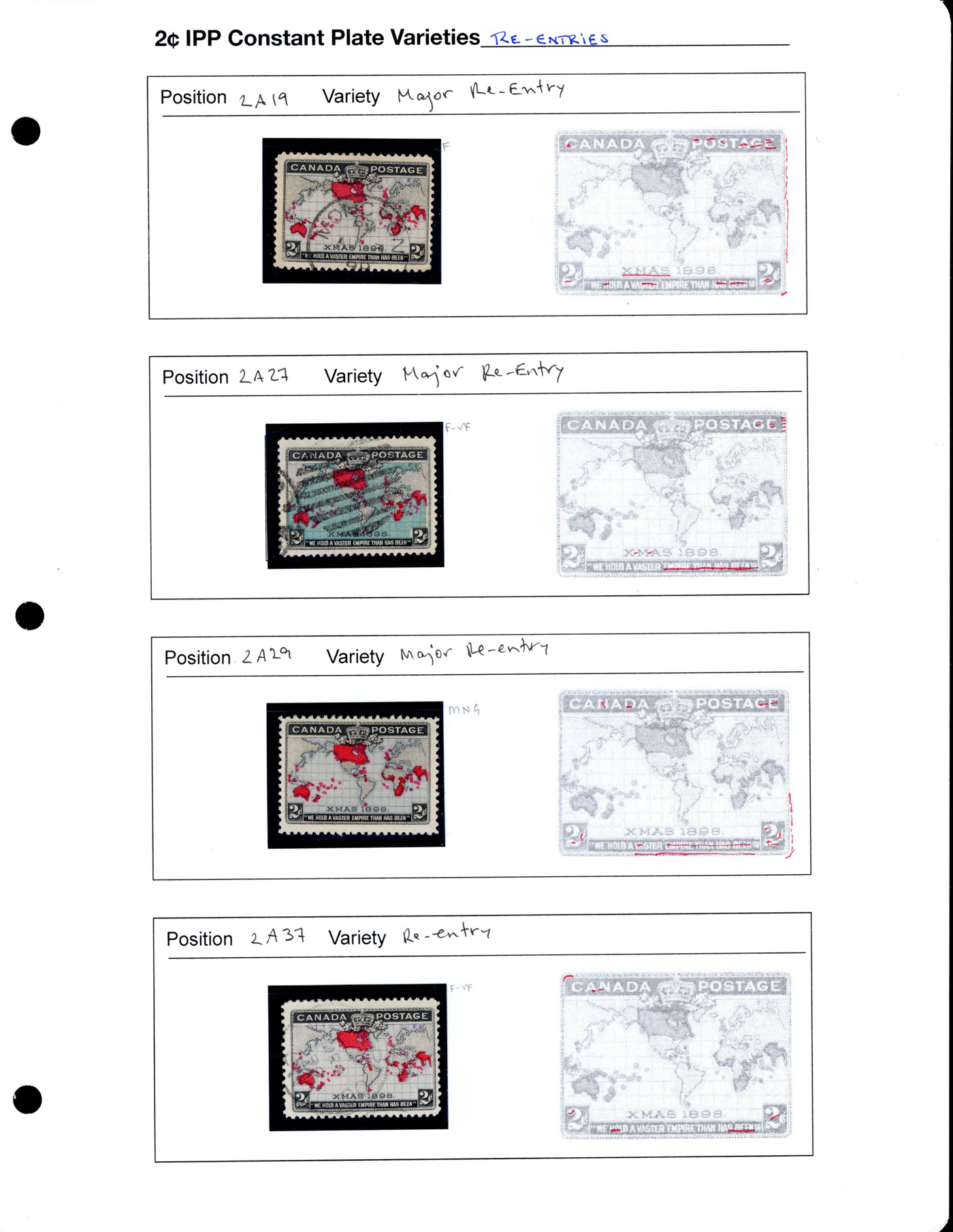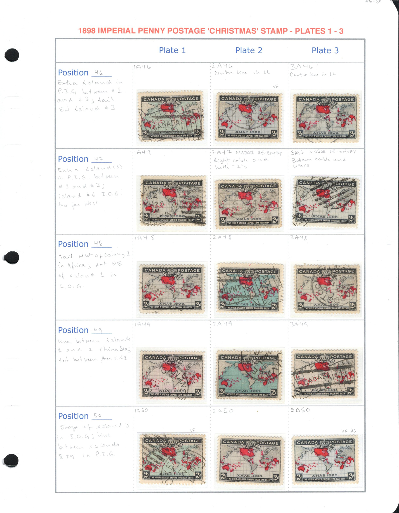 270 O 85, 86 imageReconstruction of the 2c Map Stamp Plates 1 to 3, with 300 stamps (100 positions per plate) neatly laid out on specialized pages. We note descriptions throughout of extra colonies, retouched cables, shape of islands, dots, re-entries, misplaced re-entries and major re-entries, plus more. Most of the stamps are used (noting some nice town postmarks, dated copies) and unused (no gum), some of which have sheet margins to add to the plating. A clean and mostly fine to very fine collection. A great lot for the specialist, we show just a few representative pages. (Scan 1) (Scan 2) (Scan 3) (Scan 4) (Scan 5) (All Scans)