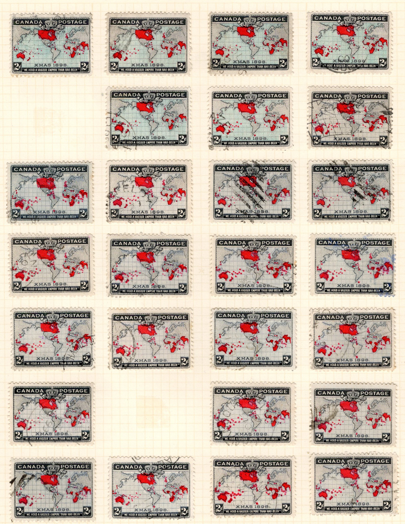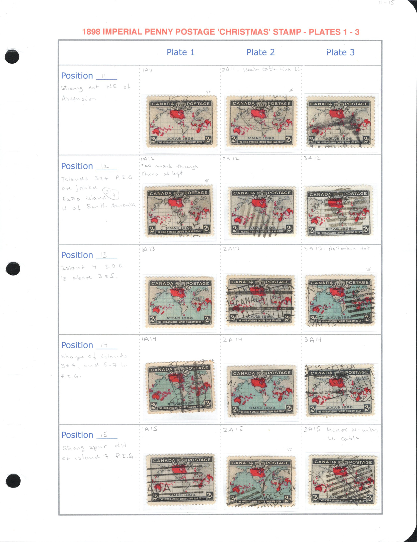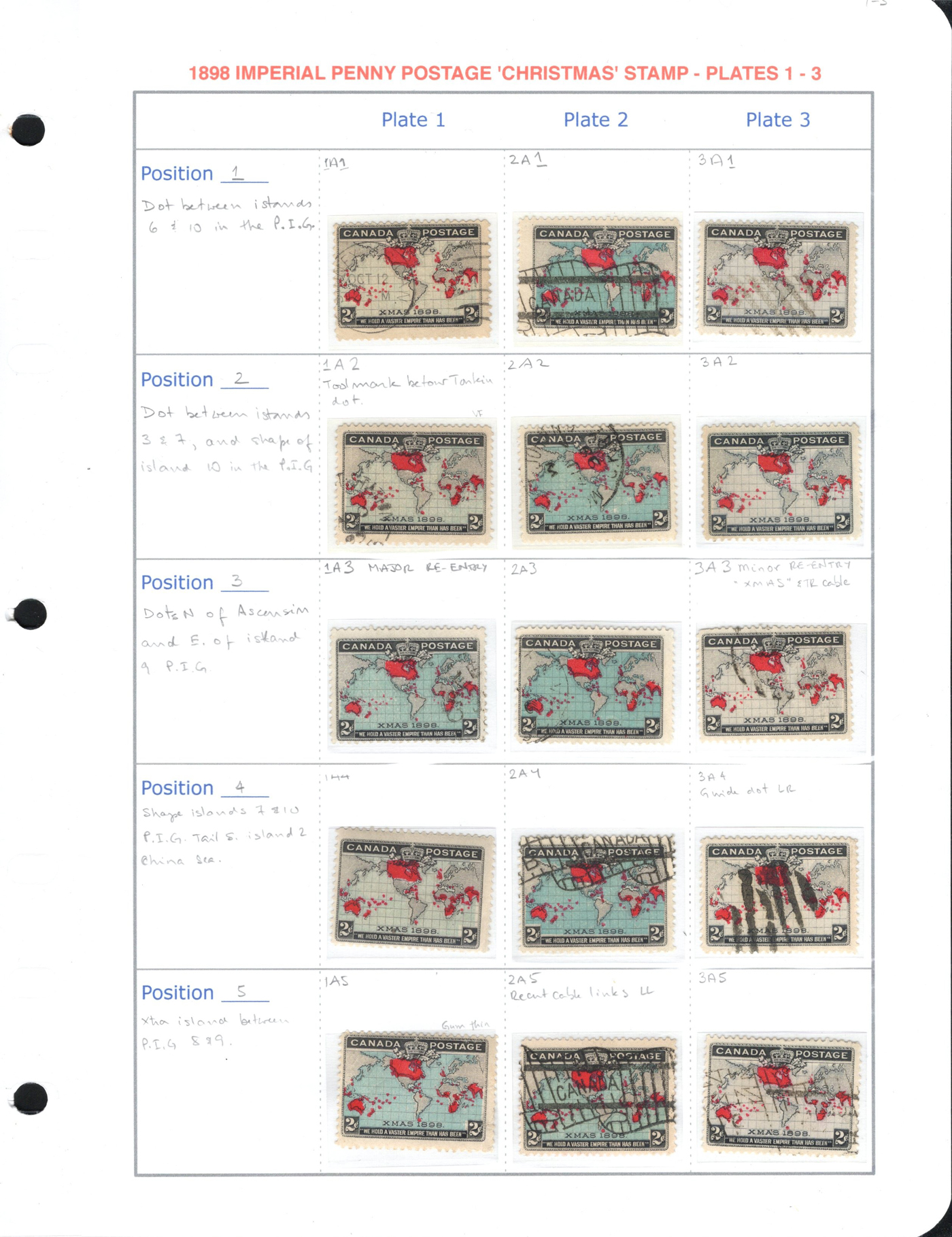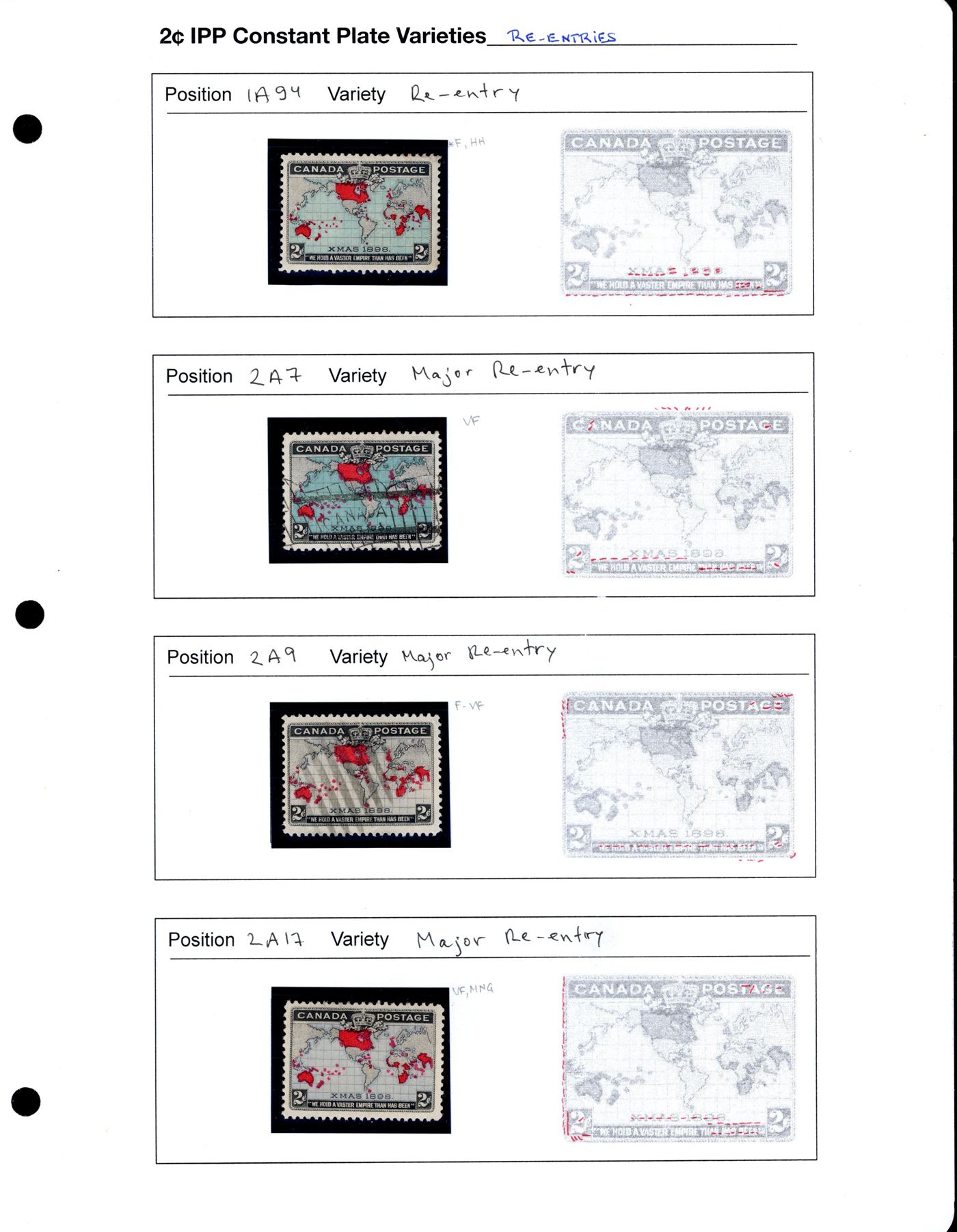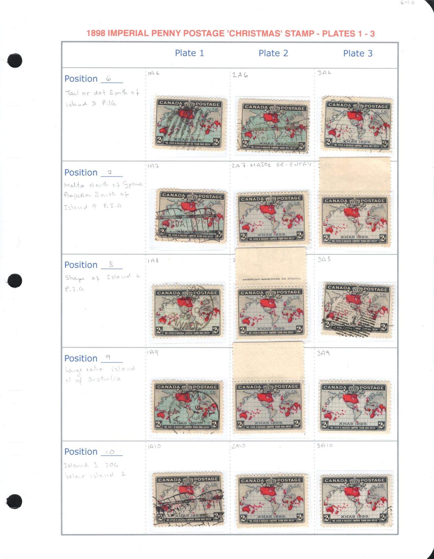 270 O 85, 86 imageReconstruction of the 2c Map Stamp Plates 1 to 3, with 300 stamps (100 positions per plate) neatly laid out on specialized pages. We note descriptions throughout of extra colonies, retouched cables, shape of islands, dots, re-entries, misplaced re-entries and major re-entries, plus more. Most of the stamps are used (noting some nice town postmarks, dated copies) and unused (no gum), some of which have sheet margins to add to the plating. A clean and mostly fine to very fine collection. A great lot for the specialist, we show just a few representative pages. (Scan 1) (Scan 2) (Scan 3) (Scan 4) (Scan 5) (All Scans)