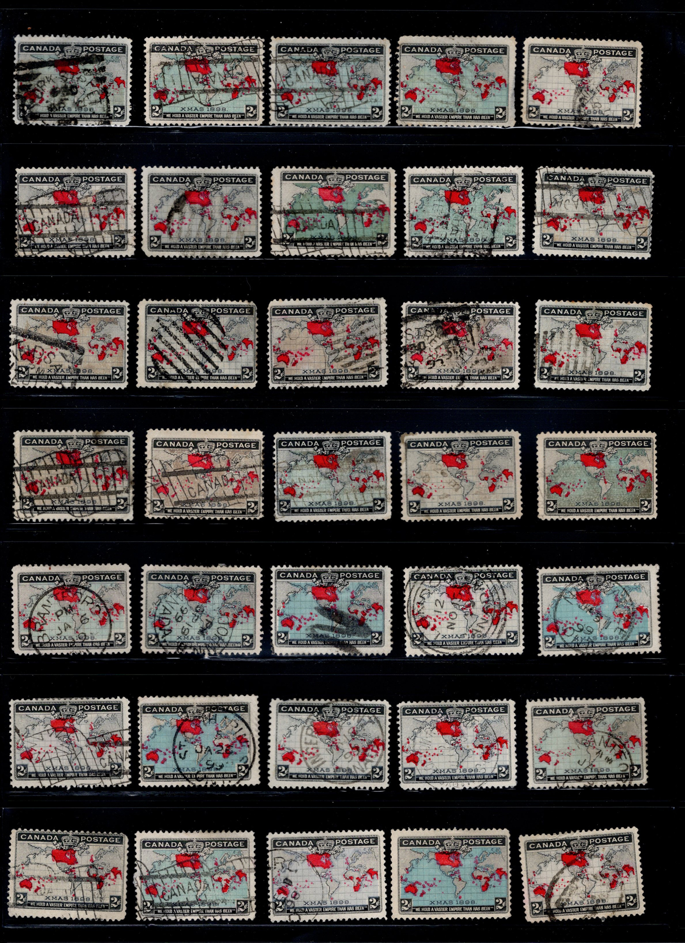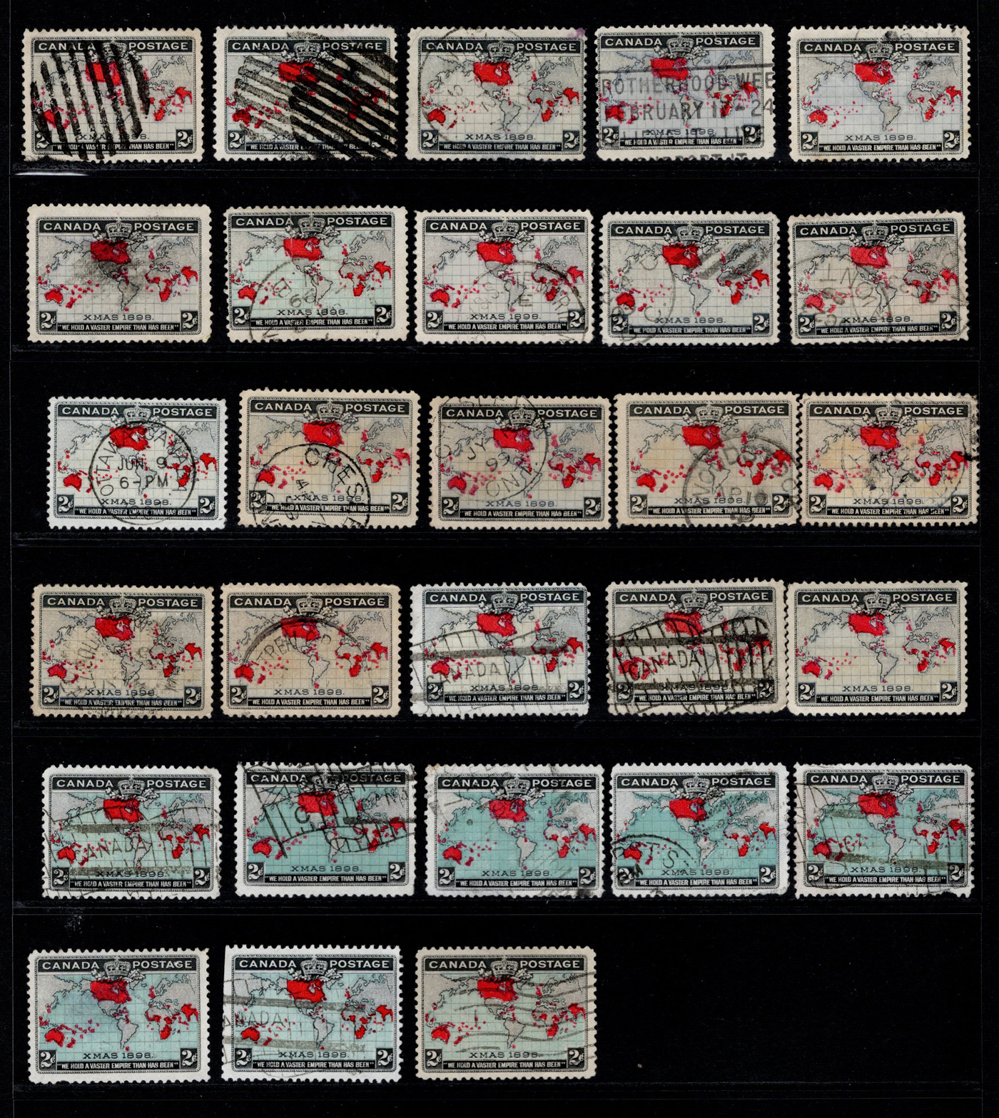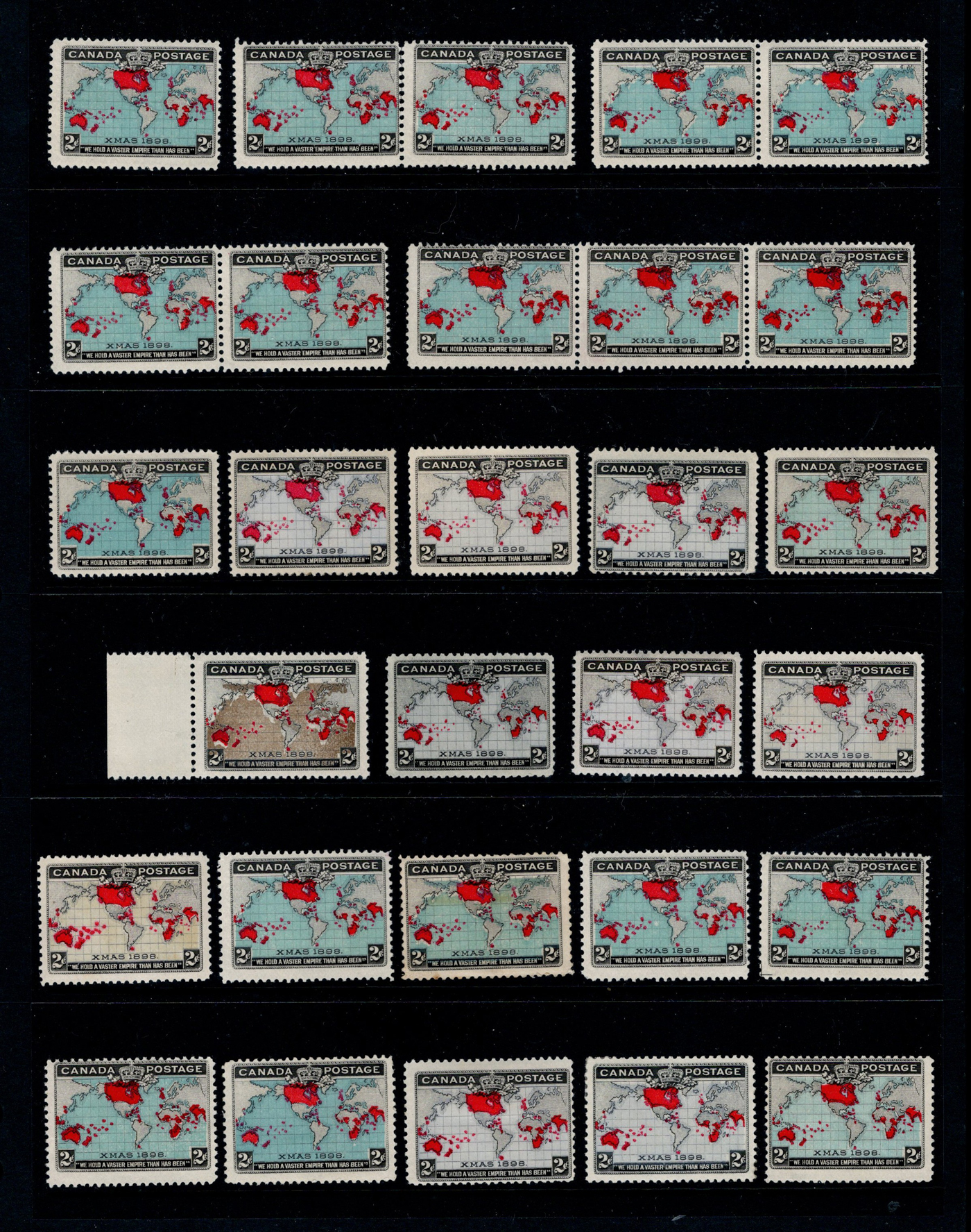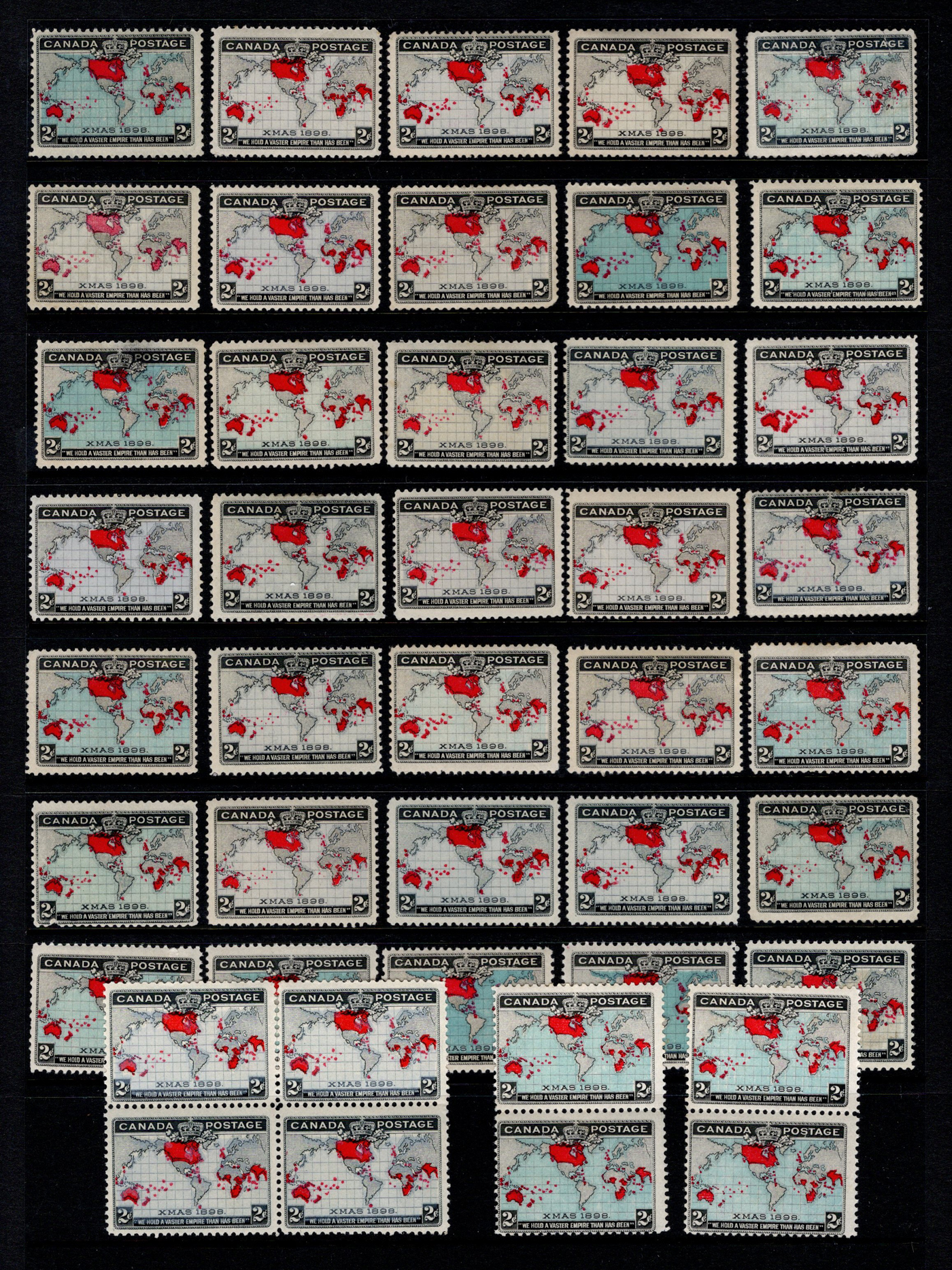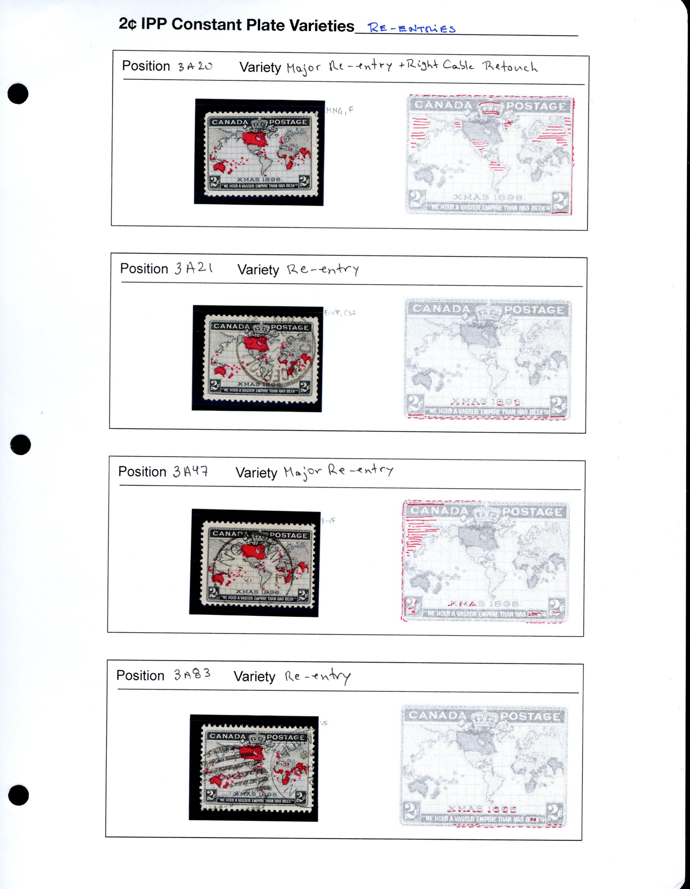 269 O 85, 86 imageCollection of 70 Map Stamp Varieties, all neatly displayed on 21 specialized pages, with each stamp having its own blow up, indicating the variety or re-entry in red. Includes 19 major re-entries (incl. 5B91, #86iii), 13 other significant re-entries, 9 cable retouches (from plates 2, 3 and 5), 4 recut links in lower left, 4 centre lines in corners (positions 45, 45, 55, 56) and 4 other constant plate varieties. A lovely collection, ideal for the specialist. See scans for a small sampling. (Scan 1) (Scan 2) (Scan 3) (Scan 4) (Scan 5) (Scan 6) (All Scans)