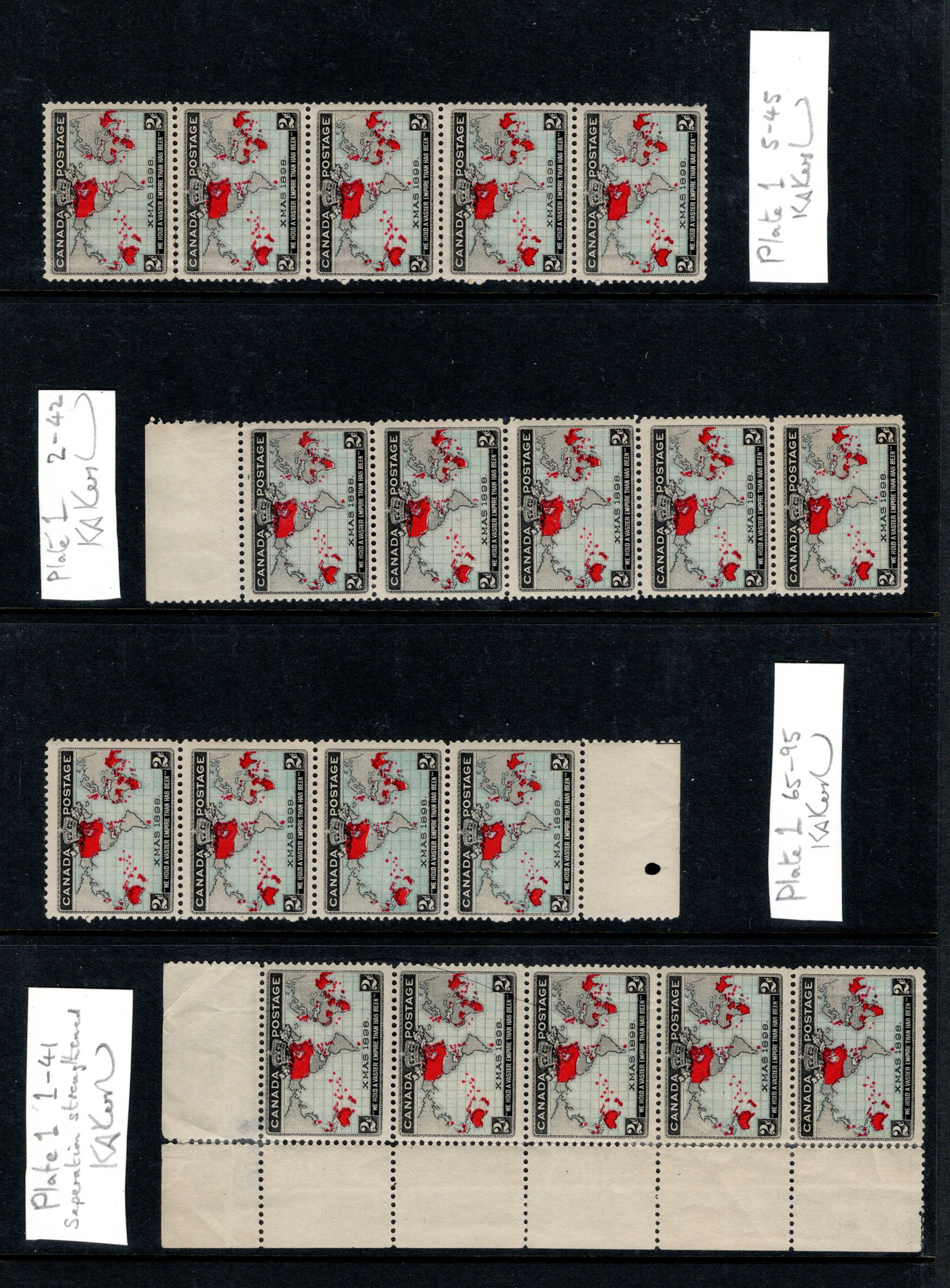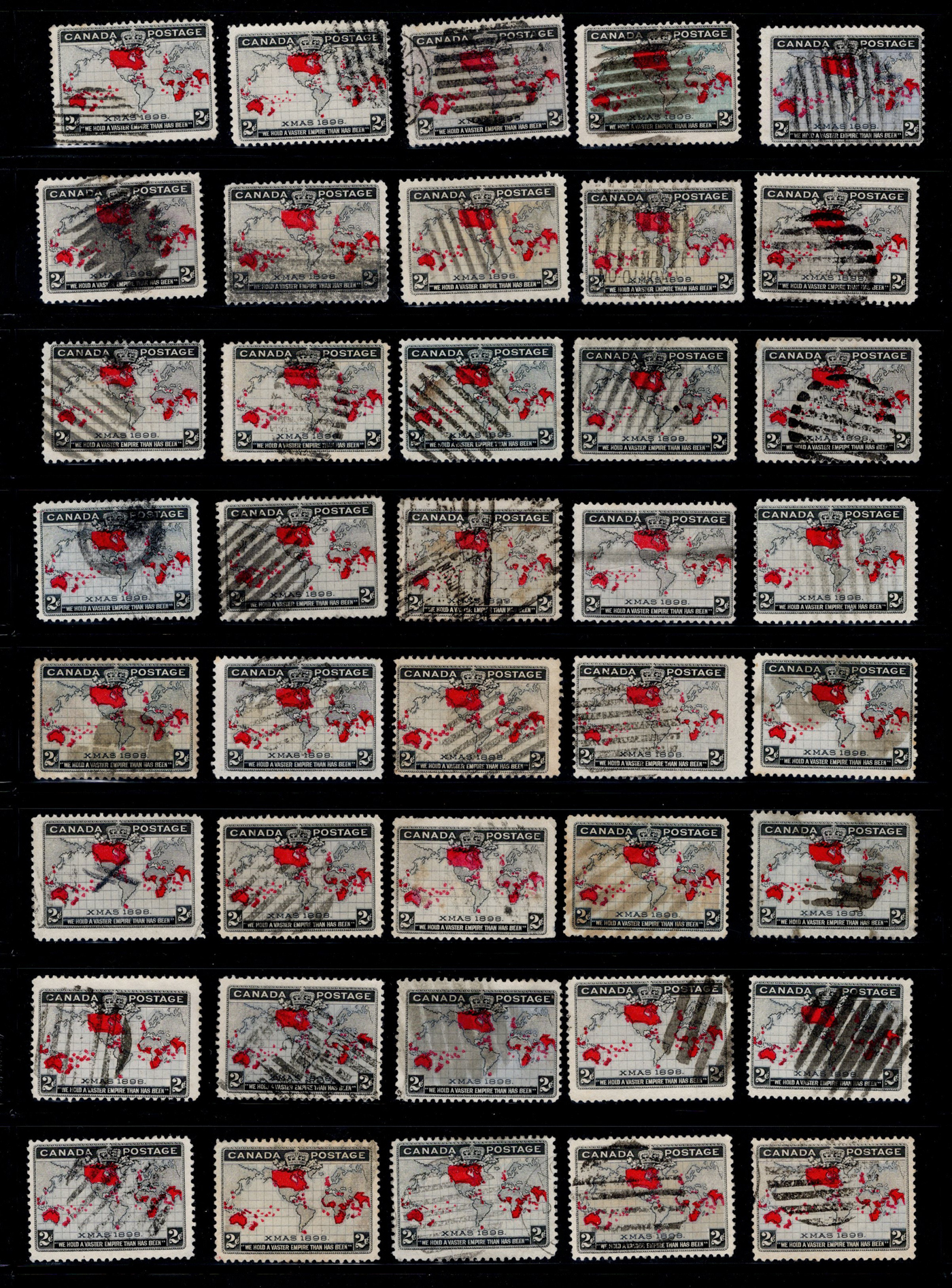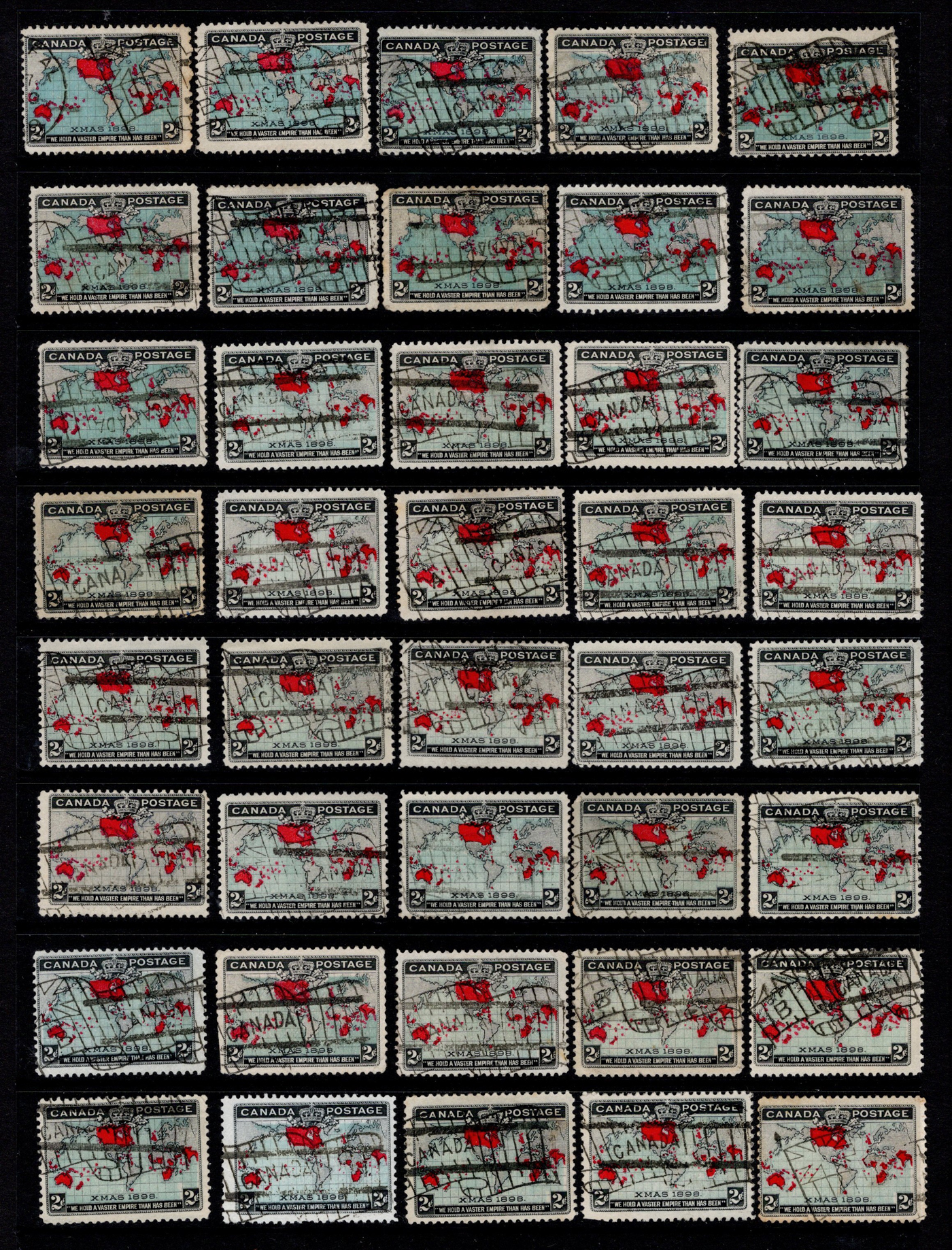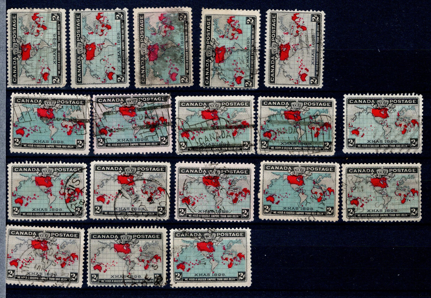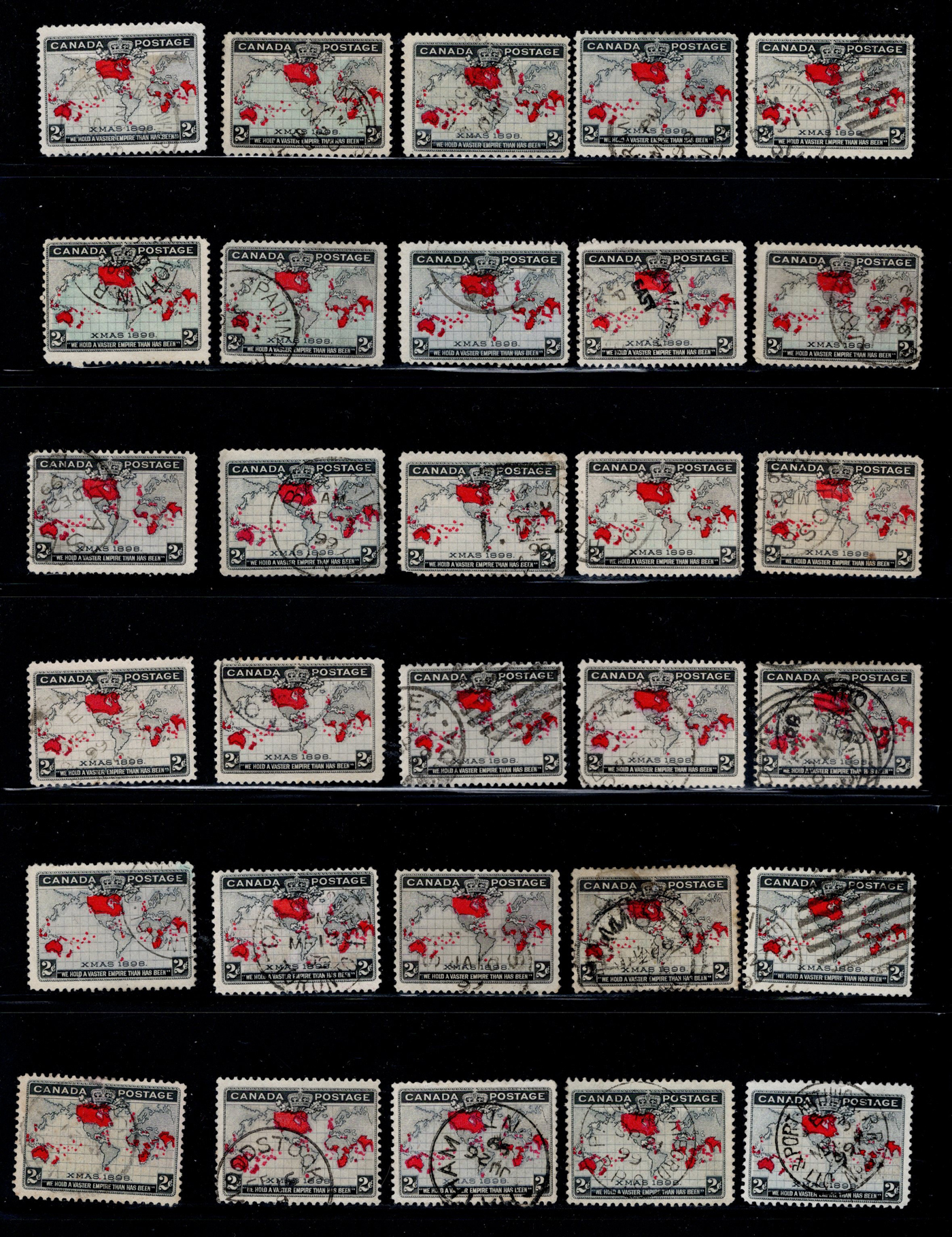 269 O 85, 86 imageCollection of 70 Map Stamp Varieties, all neatly displayed on 21 specialized pages, with each stamp having its own blow up, indicating the variety or re-entry in red. Includes 19 major re-entries (incl. 5B91, #86iii), 13 other significant re-entries, 9 cable retouches (from plates 2, 3 and 5), 4 recut links in lower left, 4 centre lines in corners (positions 45, 45, 55, 56) and 4 other constant plate varieties. A lovely collection, ideal for the specialist. See scans for a small sampling. (Scan 1) (Scan 2) (Scan 3) (Scan 4) (Scan 5) (Scan 6) (All Scans)