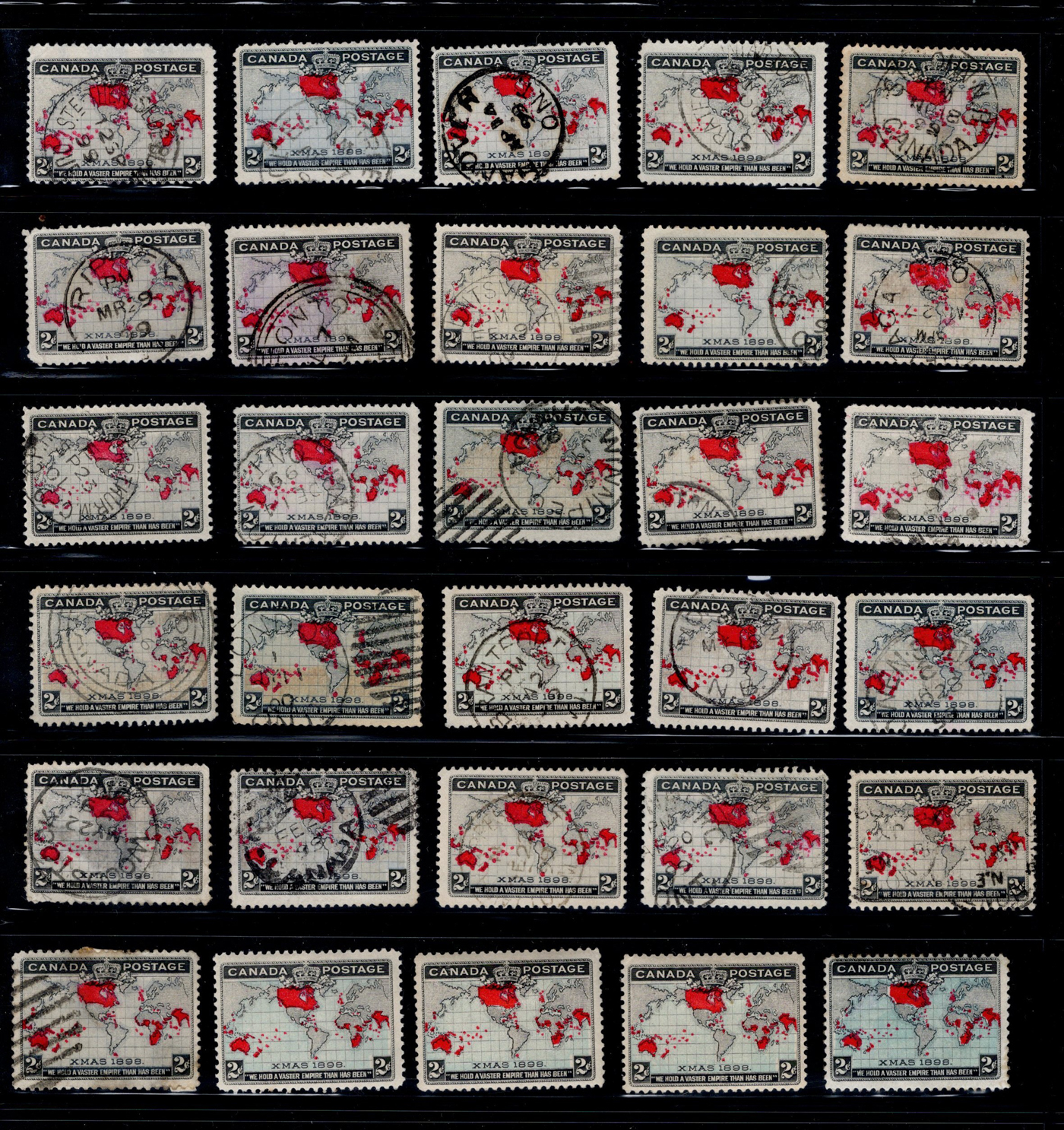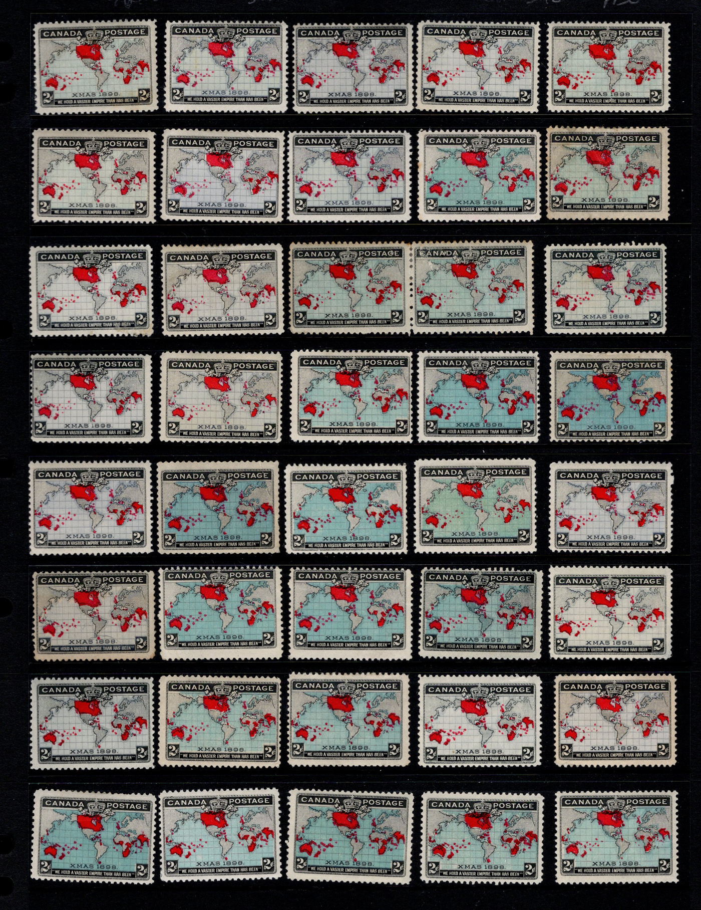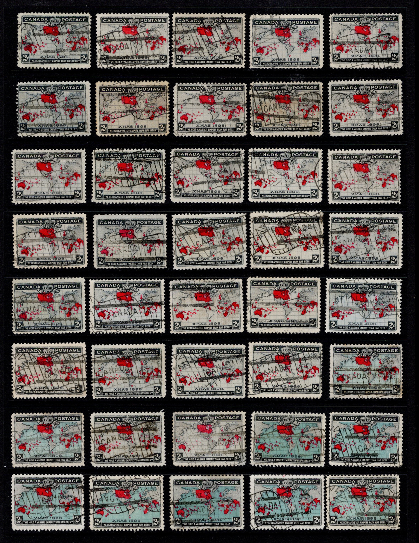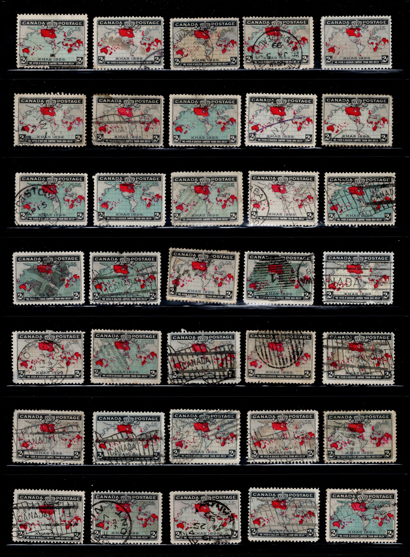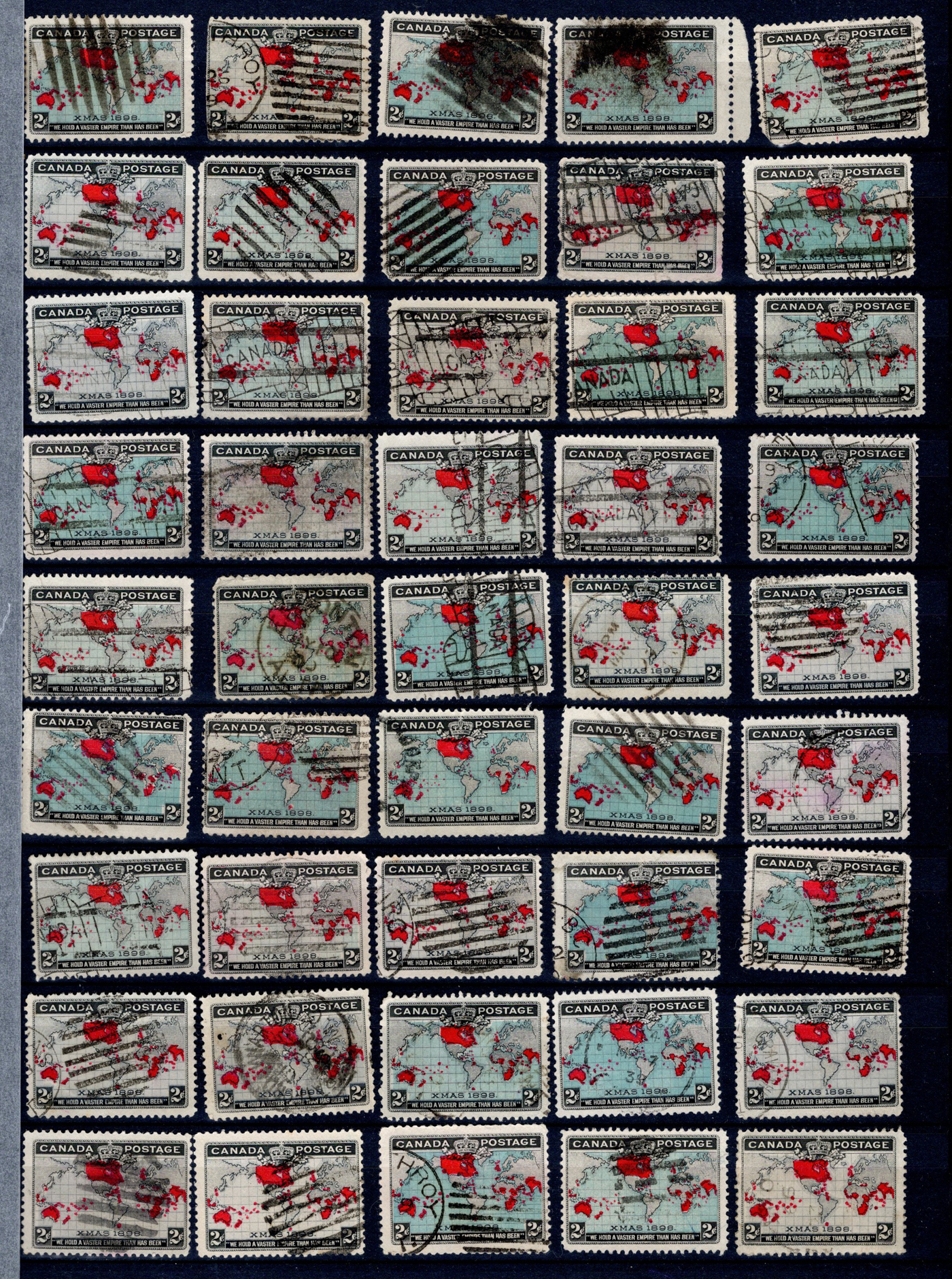 269 O 85, 86 imageCollection of 70 Map Stamp Varieties, all neatly displayed on 21 specialized pages, with each stamp having its own blow up, indicating the variety or re-entry in red. Includes 19 major re-entries (incl. 5B91, #86iii), 13 other significant re-entries, 9 cable retouches (from plates 2, 3 and 5), 4 recut links in lower left, 4 centre lines in corners (positions 45, 45, 55, 56) and 4 other constant plate varieties. A lovely collection, ideal for the specialist. See scans for a small sampling. (Scan 1) (Scan 2) (Scan 3) (Scan 4) (Scan 5) (Scan 6) (All Scans)