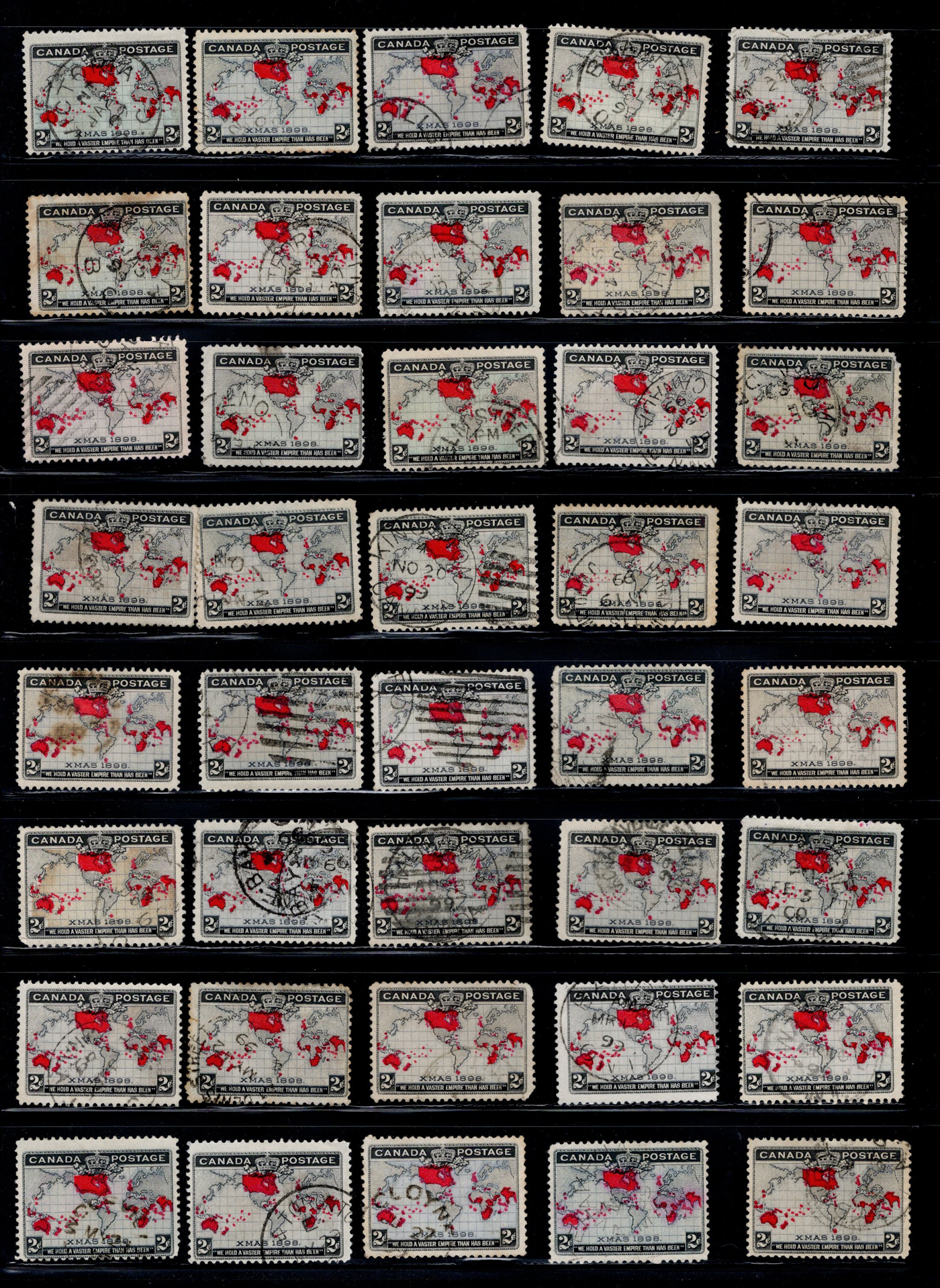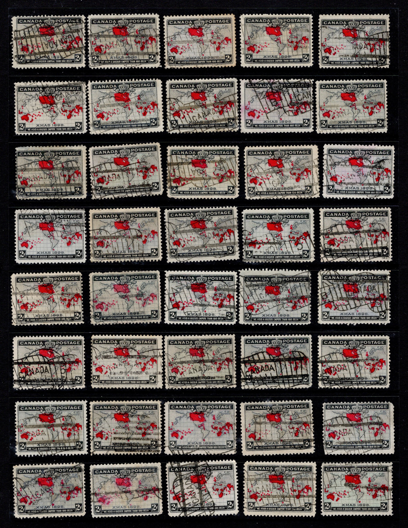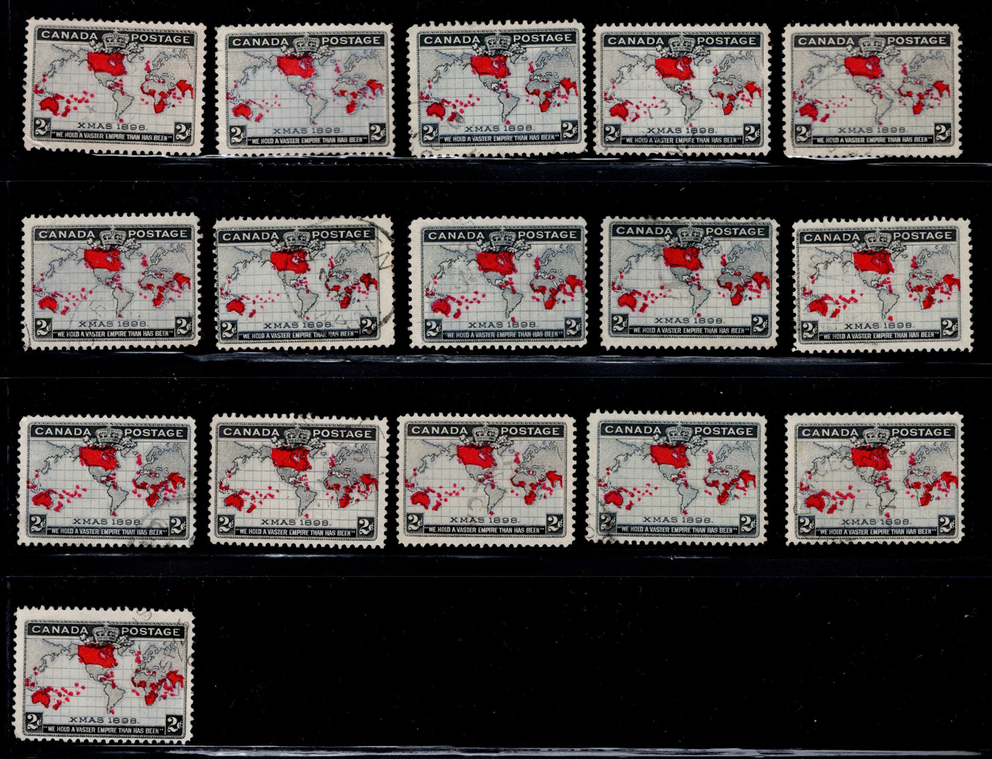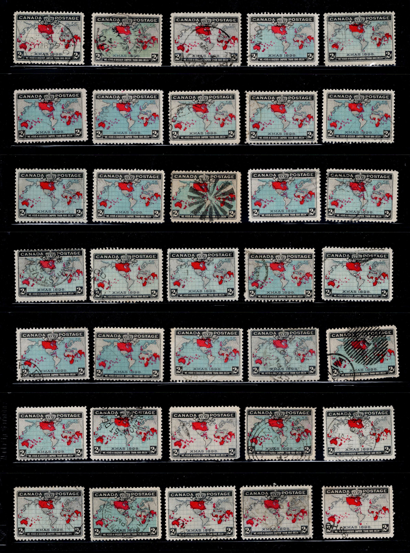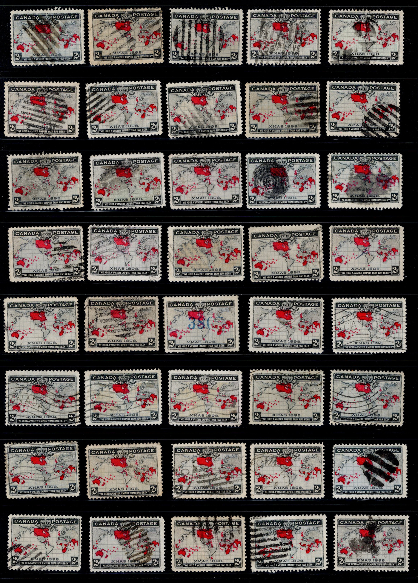 269 O 85, 86 imageCollection of 70 Map Stamp Varieties, all neatly displayed on 21 specialized pages, with each stamp having its own blow up, indicating the variety or re-entry in red. Includes 19 major re-entries (incl. 5B91, #86iii), 13 other significant re-entries, 9 cable retouches (from plates 2, 3 and 5), 4 recut links in lower left, 4 centre lines in corners (positions 45, 45, 55, 56) and 4 other constant plate varieties. A lovely collection, ideal for the specialist. See scans for a small sampling. (Scan 1) (Scan 2) (Scan 3) (Scan 4) (Scan 5) (Scan 6) (All Scans)