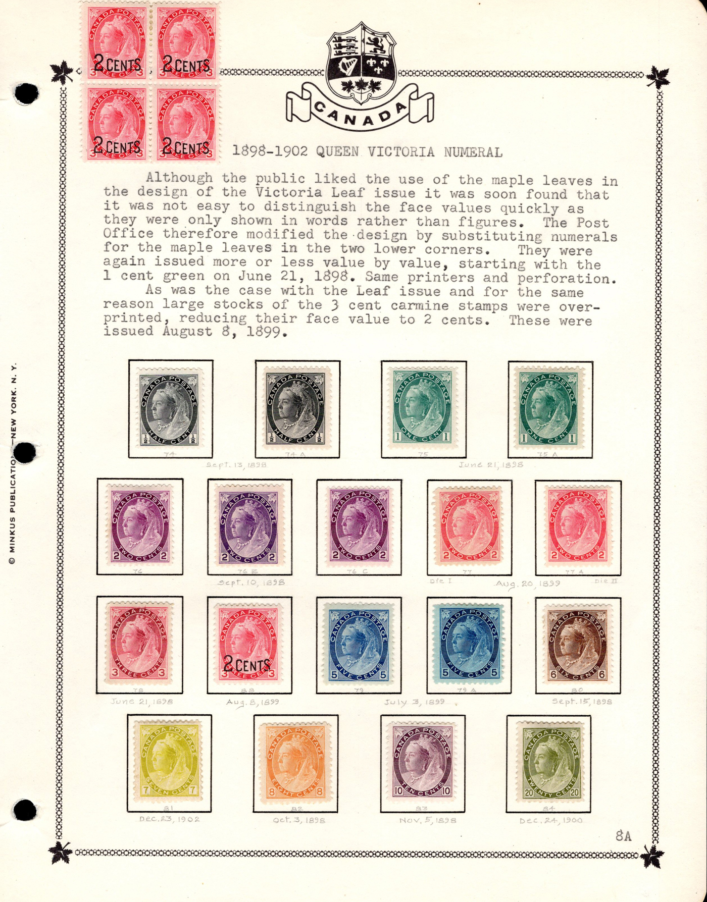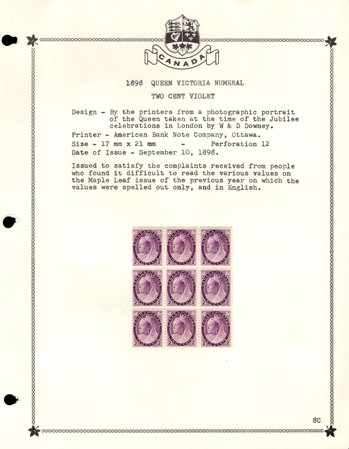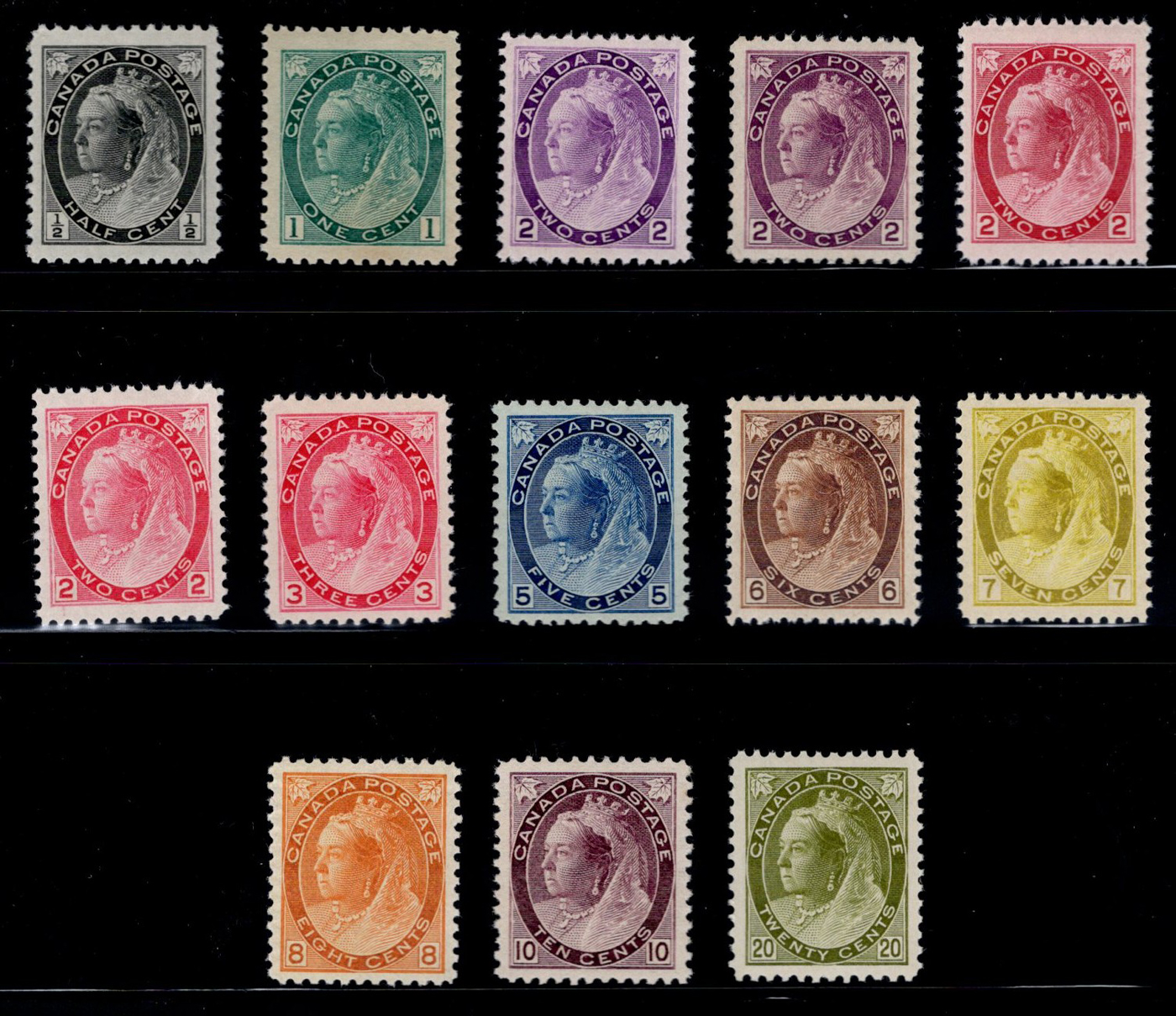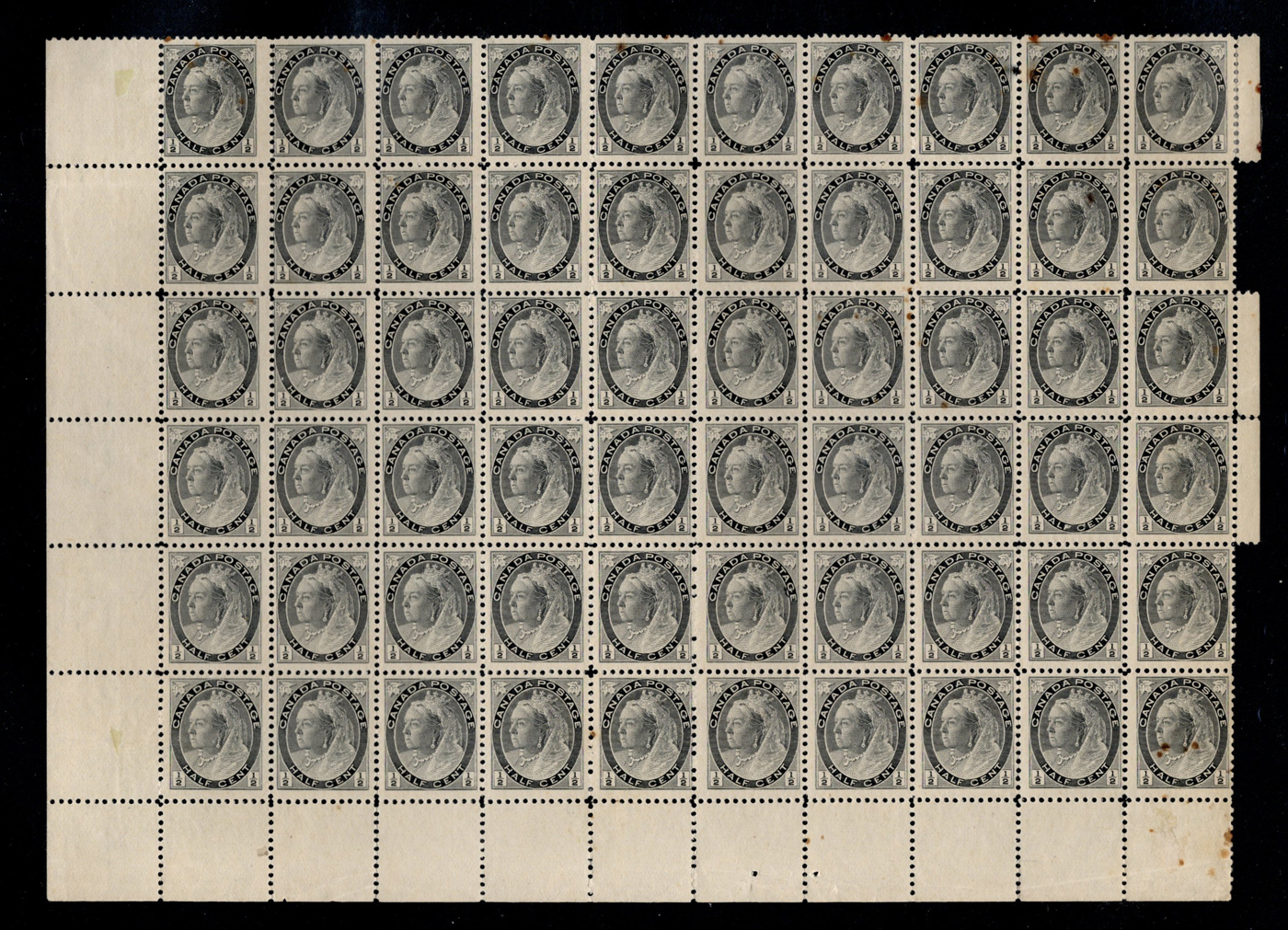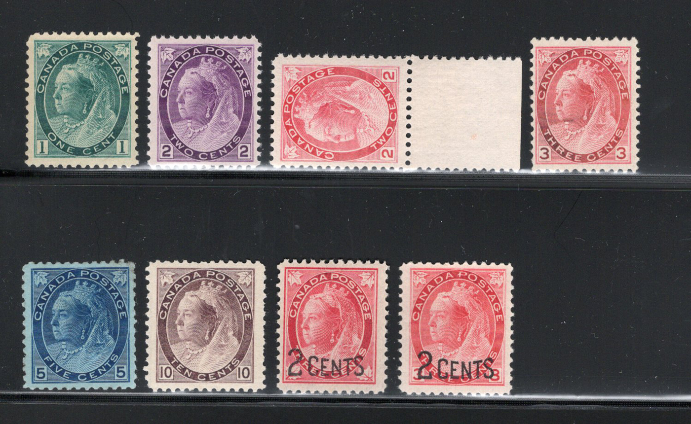 262 og/nh 74-84, 88 image1898-1902 ½c to 20c Queen Victoria Numeral Extended Set, all mint, with a hinged basic set of 18 stamps, including two shades each of the ½c, 1c, 2c carmine (one without gum), 5c, and three shades of the 2c purple, plus a #88. Also includes a mint block of 4 of #88 (lower two stamps are NH), a block of 9 of the 3c purple (4 stamps are NH) and a block of 60 of the ½c with selvedge at bottom and left (foxing on several stamps, some separation and overall light gum adhesion, otherwise fine and NH). A mostly fine or better group, catalogue value is for all the least valuable shades or papers. (Scan 1) (Scan 2) (Scan 3) (All Scans)