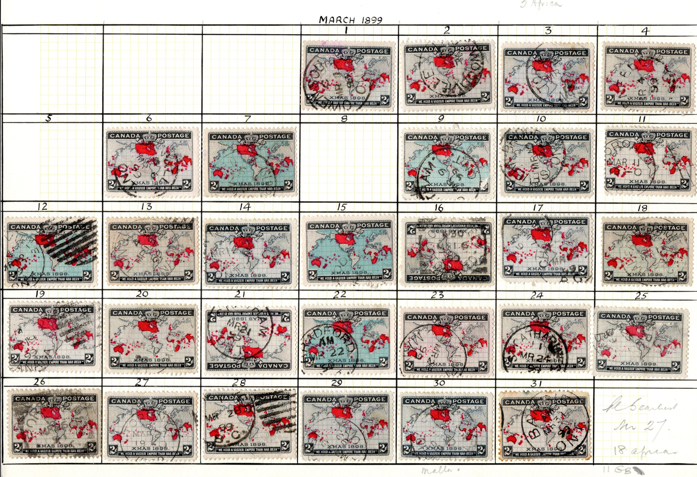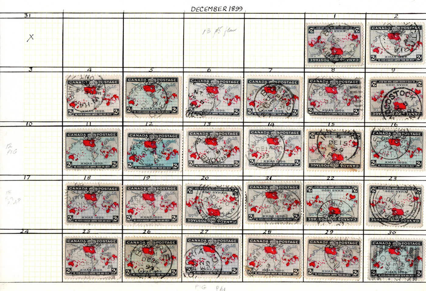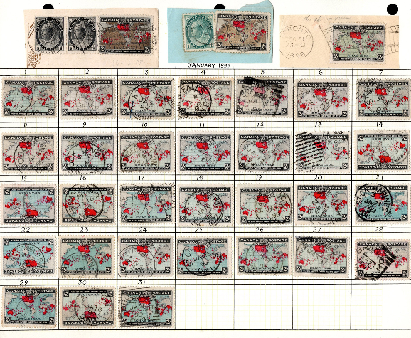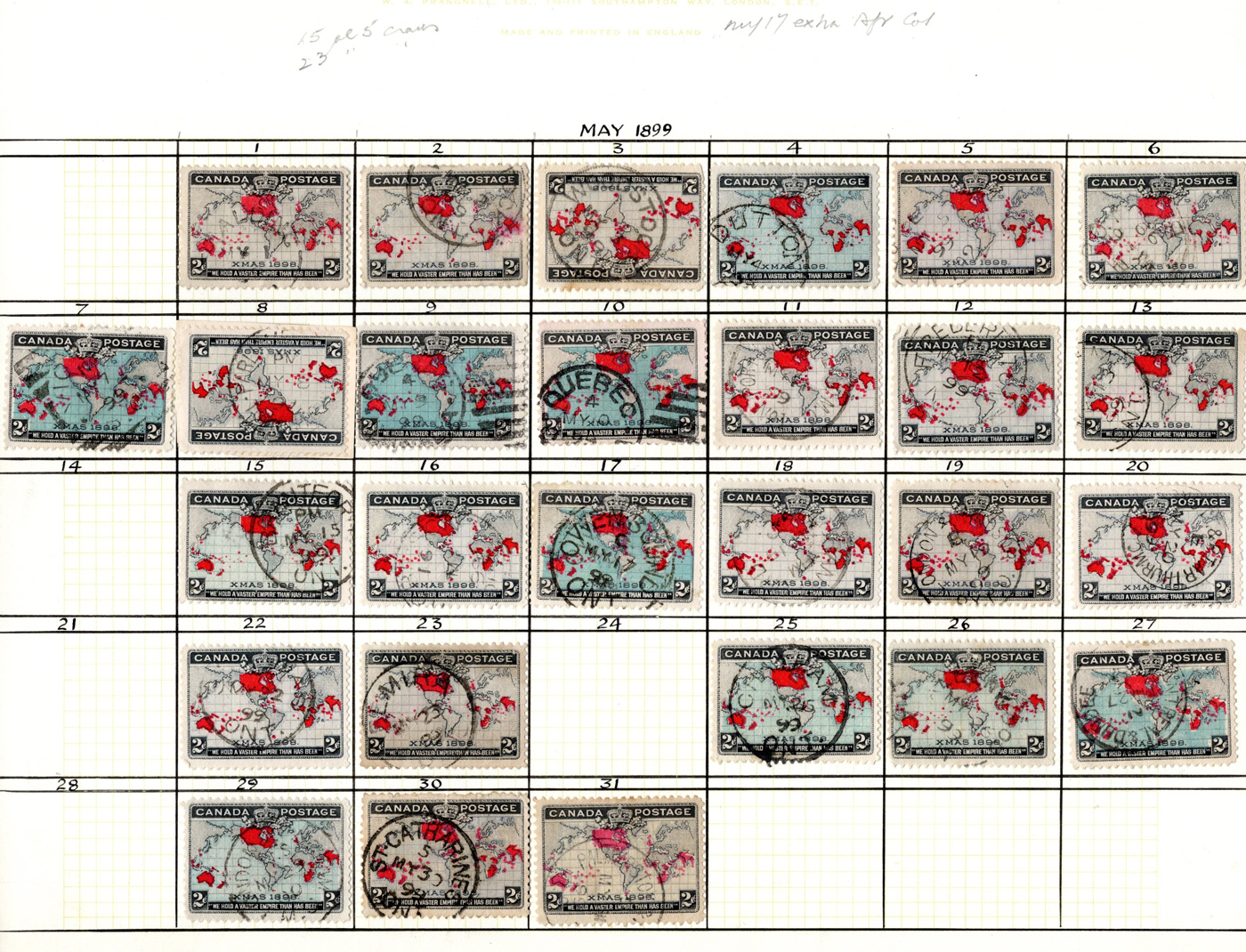 271 O 85, 86 image1899 Calendar Collection of the 2c Map Issue, neatly mounted on 12 calendar-like pages by 1899 date (each page is a different month), with 313 different dates. We note a variety of postmarks, including duplex, c.d.s., squared circle, RPO and more. Includes three pieces, one dated DEC.16.1898, one DEC.23.1898 and one DEC.31.1898. Many of the pages have notes by Richard Lamb alluding to plate varieties. A better than usual collection of this sort, because of the legibility of the dates, fine to very fine. (Scan 1) (Scan 2) (Scan 3) (Scan 4) (Scan 5) (Scan 6) (Scan 7) (Scan 8) (Scan 9) (Scan 10) (Scan 11) (Scan 12) (All Scans)