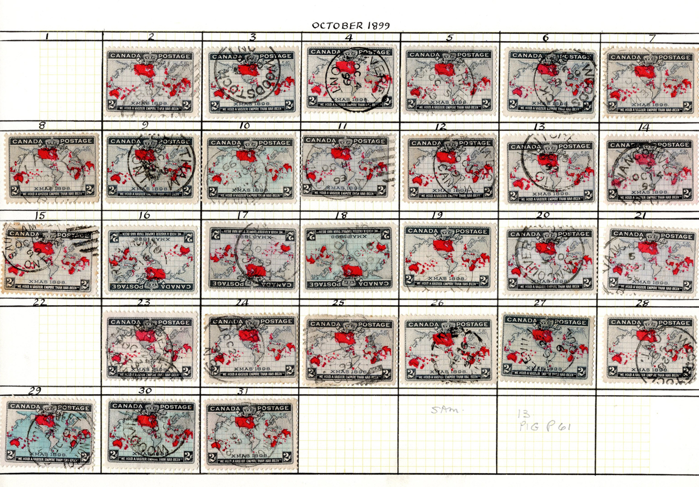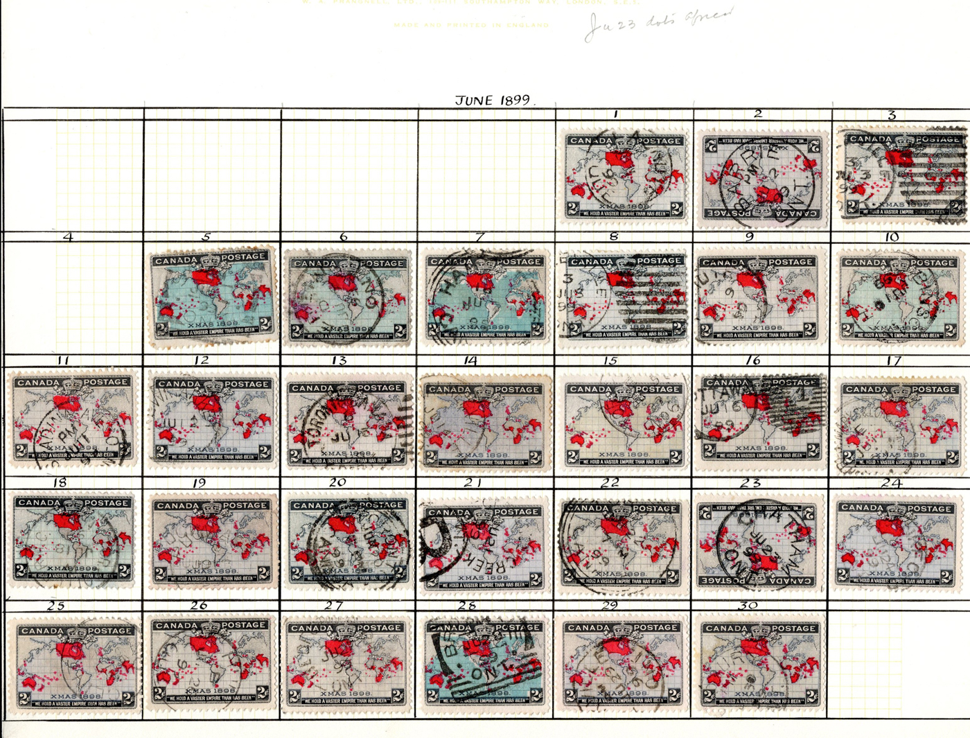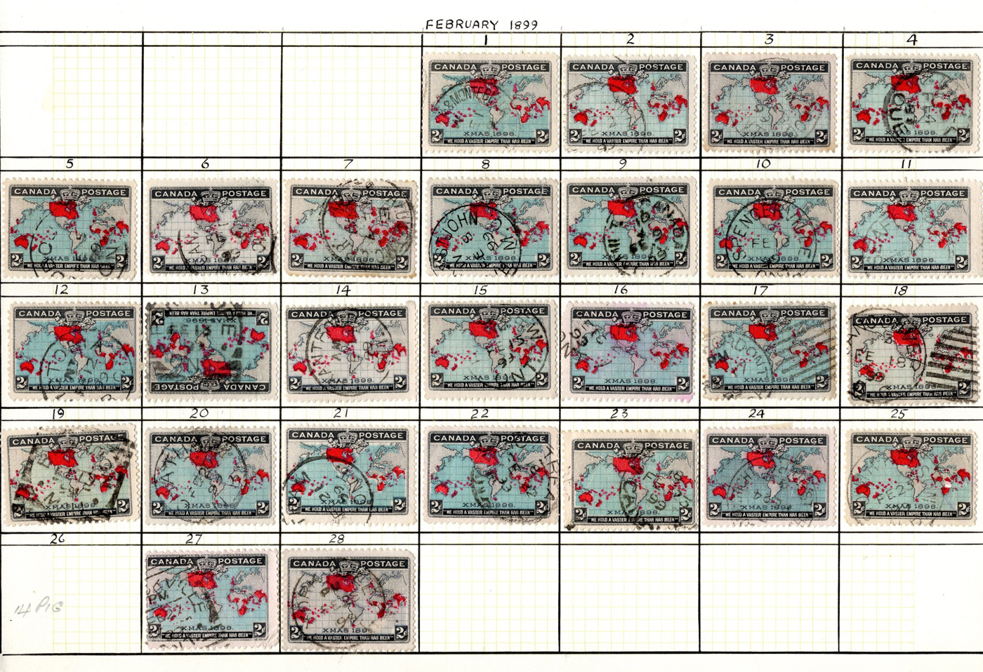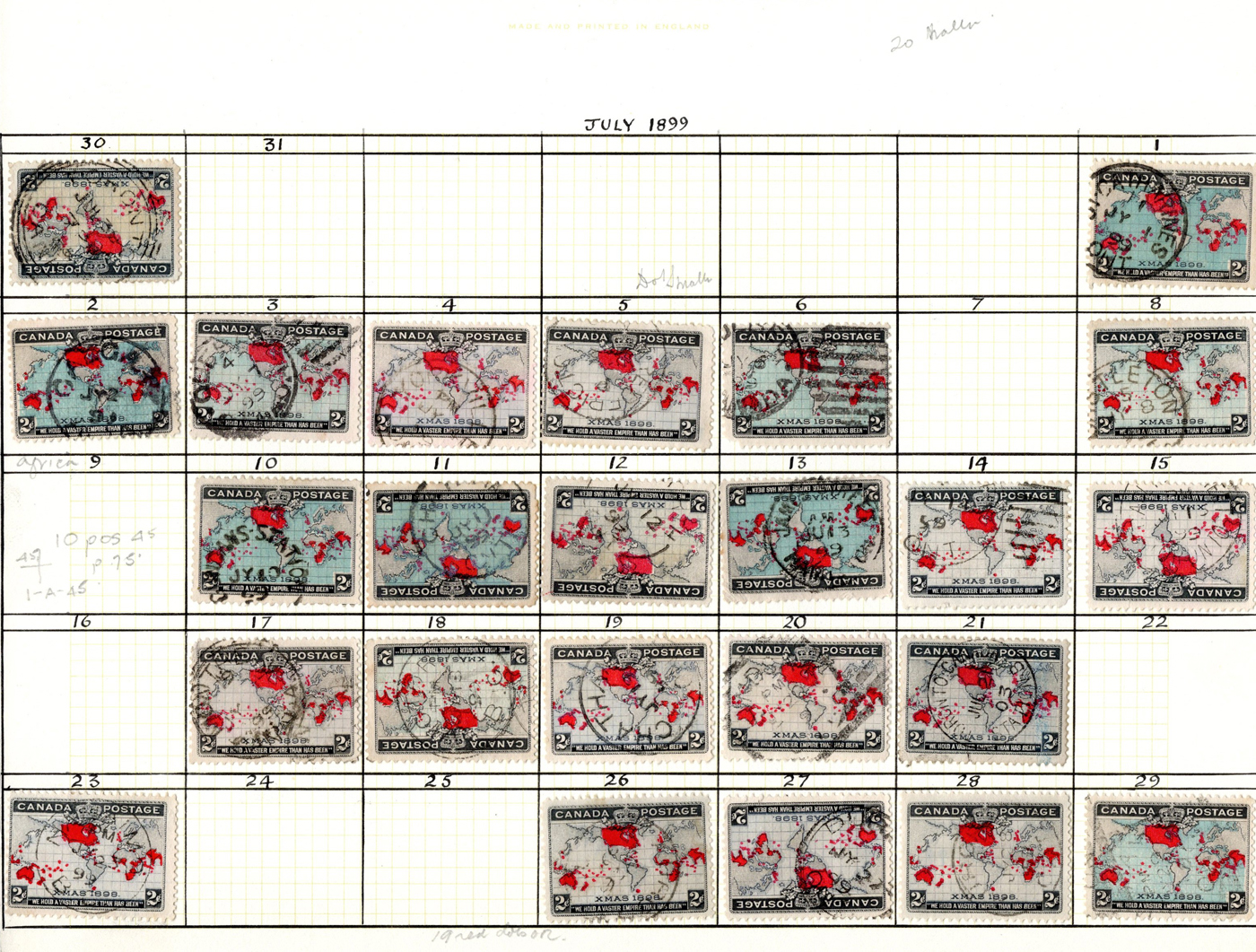271 O 85, 86 image1899 Calendar Collection of the 2c Map Issue, neatly mounted on 12 calendar-like pages by 1899 date (each page is a different month), with 313 different dates. We note a variety of postmarks, including duplex, c.d.s., squared circle, RPO and more. Includes three pieces, one dated DEC.16.1898, one DEC.23.1898 and one DEC.31.1898. Many of the pages have notes by Richard Lamb alluding to plate varieties. A better than usual collection of this sort, because of the legibility of the dates, fine to very fine. (Scan 1) (Scan 2) (Scan 3) (Scan 4) (Scan 5) (Scan 6) (Scan 7) (Scan 8) (Scan 9) (Scan 10) (Scan 11) (Scan 12) (All Scans)