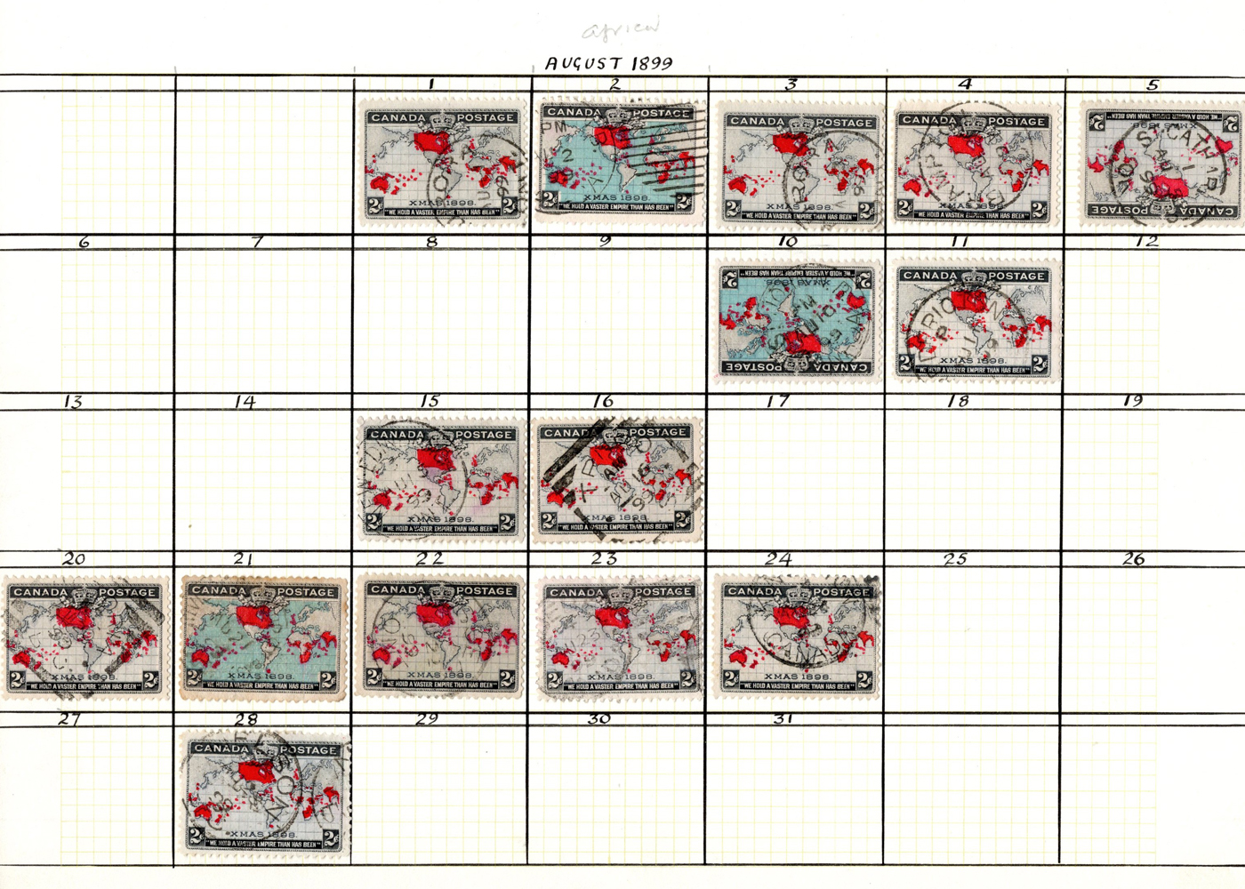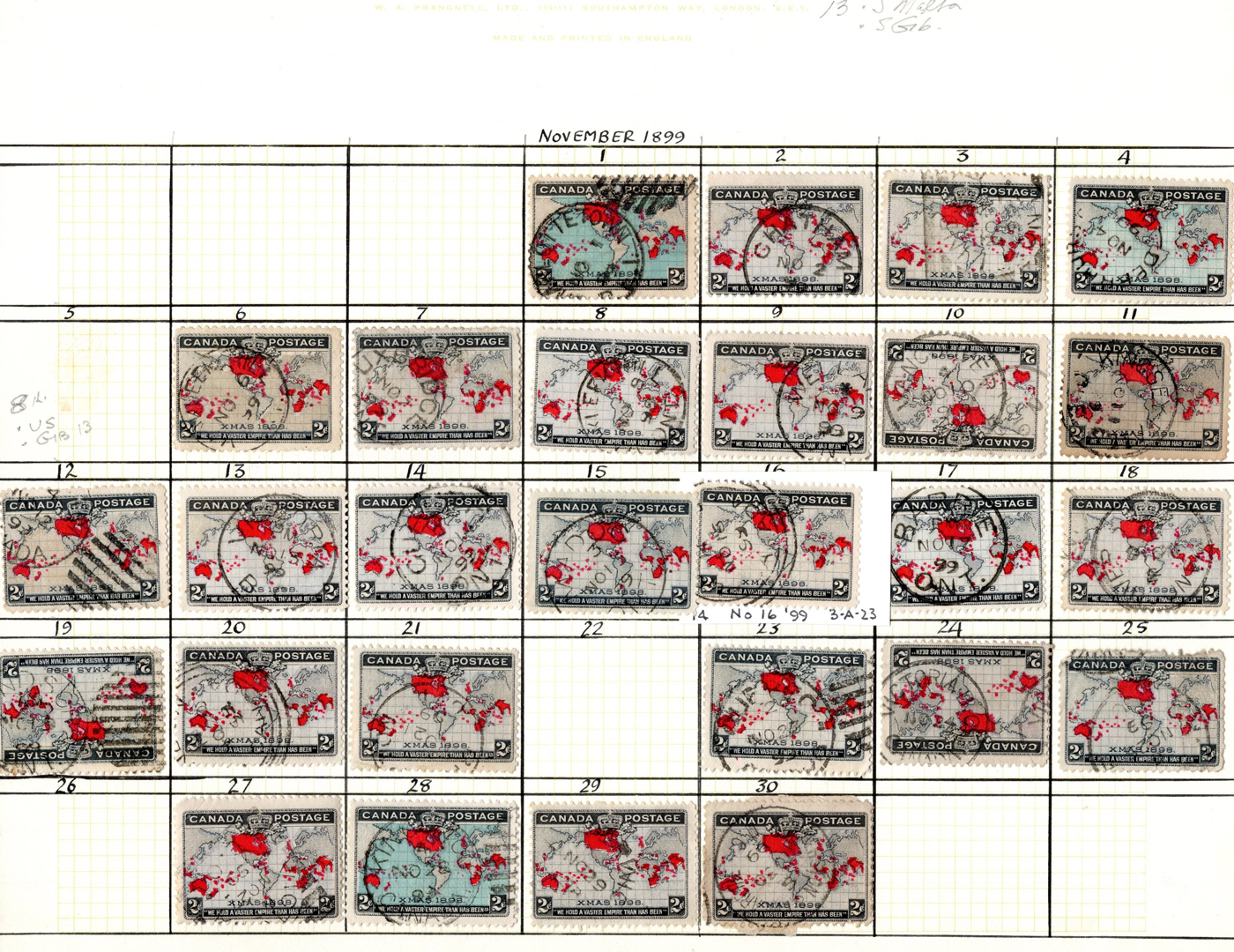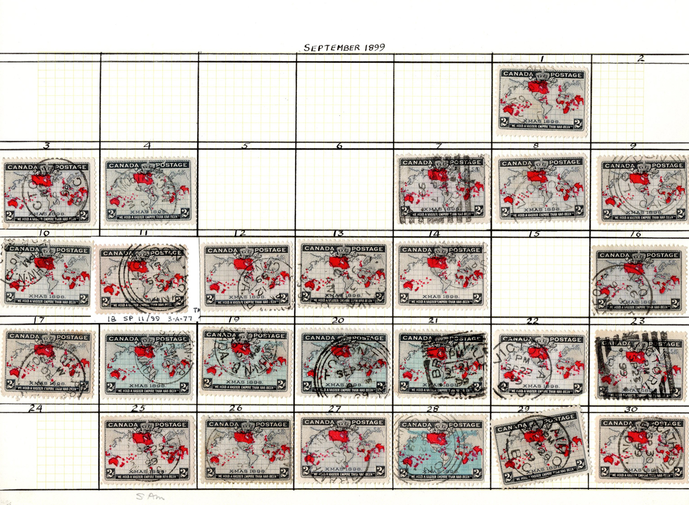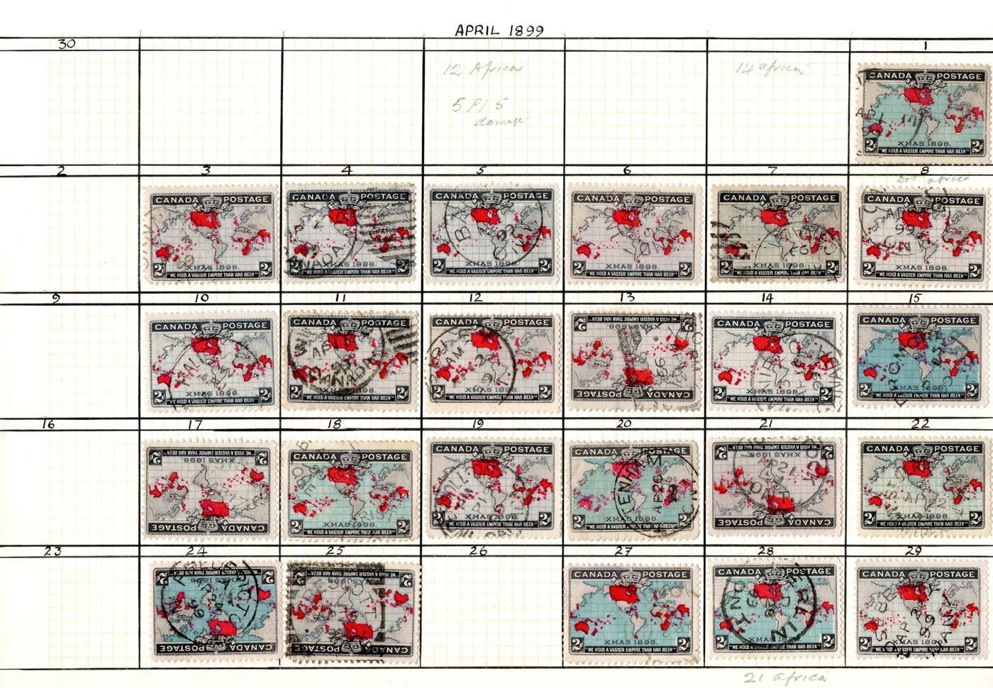 271 O 85, 86 image1899 Calendar Collection of the 2c Map Issue, neatly mounted on 12 calendar-like pages by 1899 date (each page is a different month), with 313 different dates. We note a variety of postmarks, including duplex, c.d.s., squared circle, RPO and more. Includes three pieces, one dated DEC.16.1898, one DEC.23.1898 and one DEC.31.1898. Many of the pages have notes by Richard Lamb alluding to plate varieties. A better than usual collection of this sort, because of the legibility of the dates, fine to very fine. (Scan 1) (Scan 2) (Scan 3) (Scan 4) (Scan 5) (Scan 6) (Scan 7) (Scan 8) (Scan 9) (Scan 10) (Scan 11) (Scan 12) (All Scans)