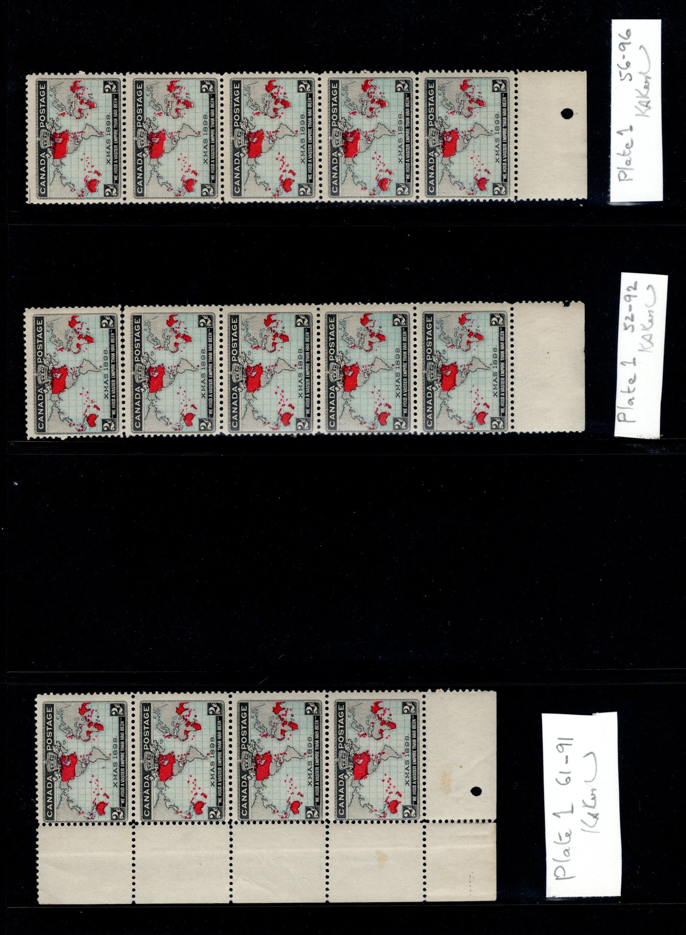 266 og/nh 85 image1898 2c Black, Lavender and Carmine Map, a group of 33 mint stamps (7 vertical strips of 4 or 5, most with sheet margins), all never hinged except 2 that have a small hinge to reinforce between, and all are identified as per their position within plate 1. Overall fine. (Scan 1) (Scan 2) (All Scans)