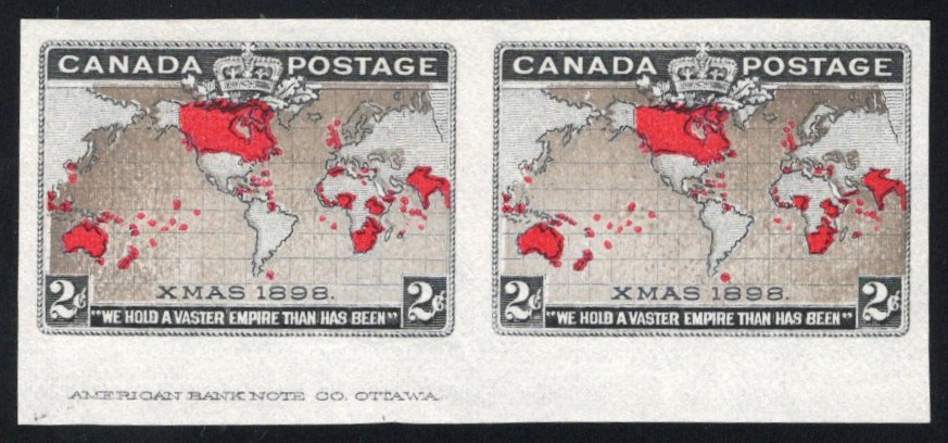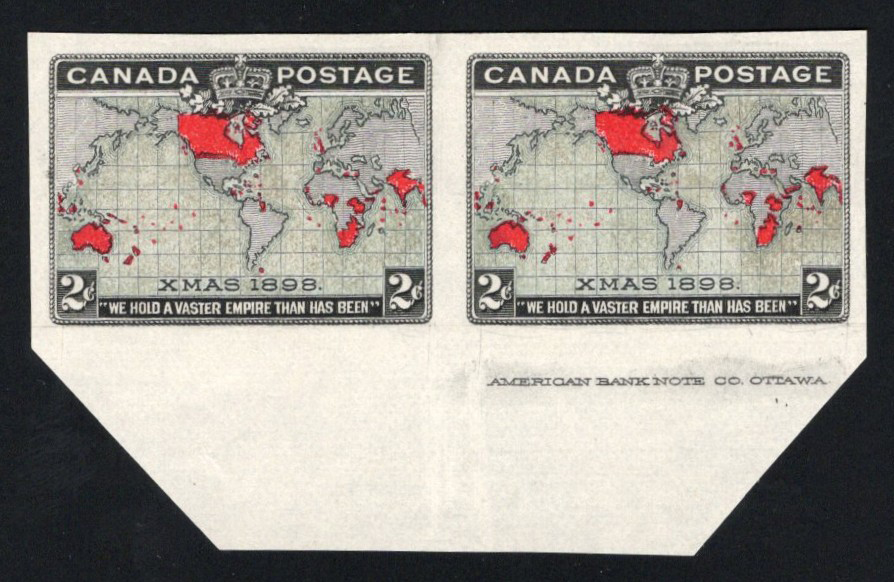 280 ng 86a image1898 2c Blue Map Imperforate, an unused (no gum, as issued) horizontal pair with sheet margin at bottom showing the full plate inscription. The stamp's oceans are slightly "muddied", still very fine. Value given is for a normal pair only, with no premium for plate inscription.