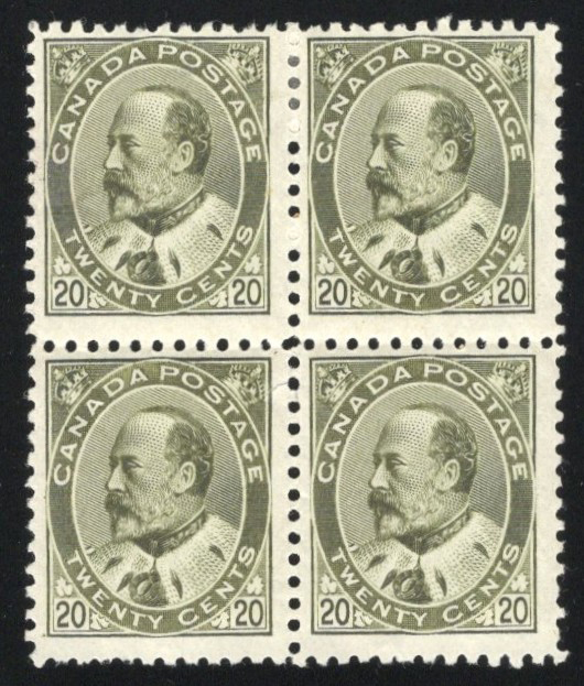 303 og 94i image1904 20c Deep Olive Green King Edward VII, a mint block of four, with top two stamps hinged, bottom two are never hinged but have short gum, so counted as hinged, fine.