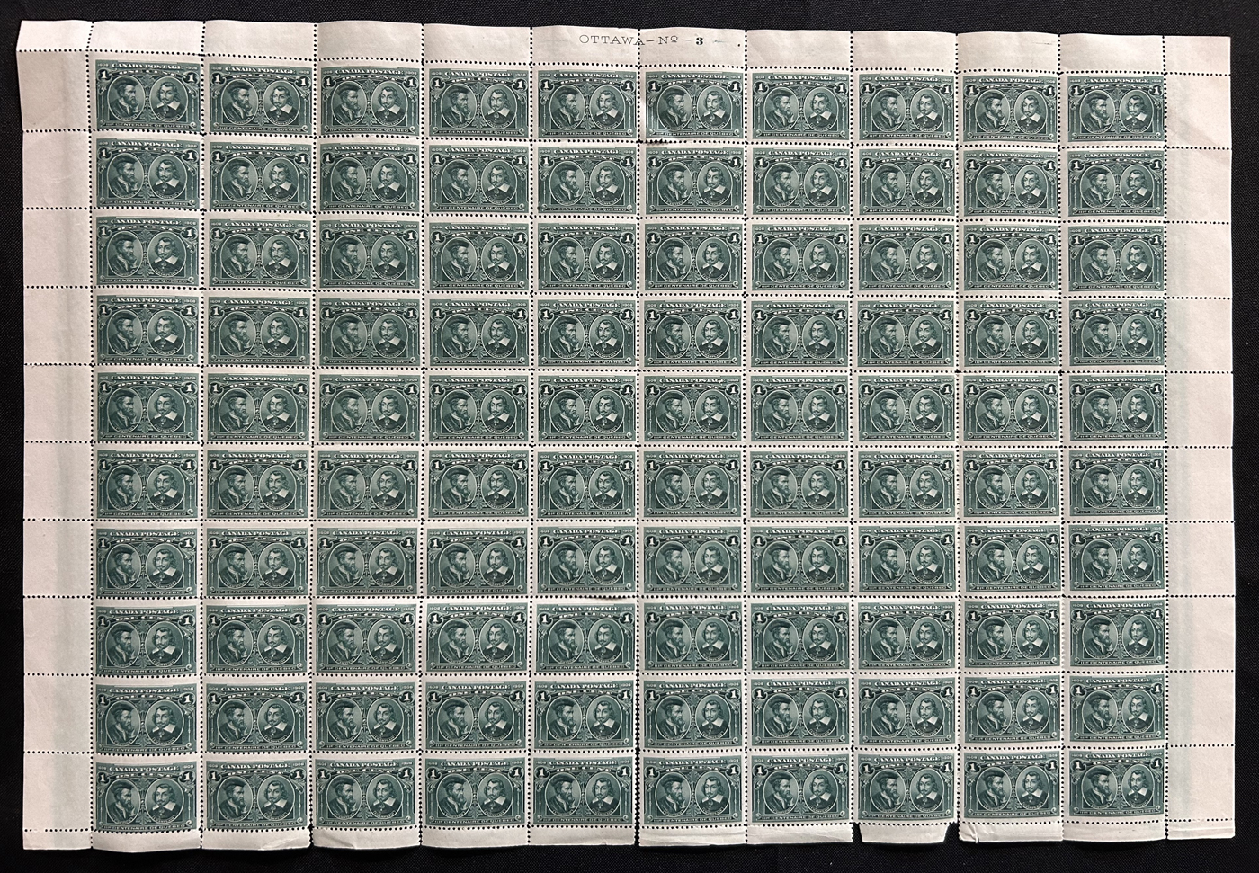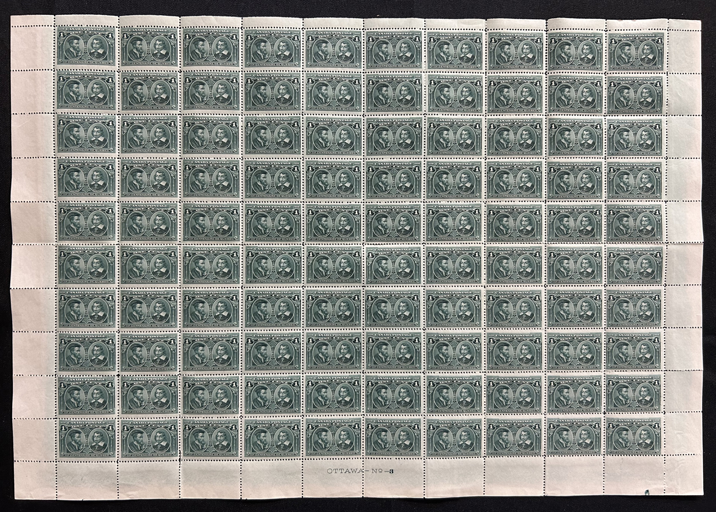312 nh 97 image1908 1c Green Québec Tercentenary, a mint never hinged complete sheet of 100, showing the plate 3 inscription at bottom centre. There is vertical separation at top between stamps 2-3 and 8-9, a fine and scarce sheet.
