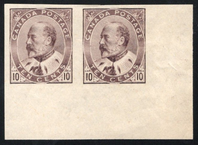302 ng 93a image1903 10c Brown Lilac King Edward VII Imperforate, an unused (no gum, as issued) horizontal pair from the lower right corner of the sheet, very fine and scarce, with only 100 pairs possible. Signed "JNS" (J.N. Sissons) in pencil on back, only two lower right corner pairs can exist.