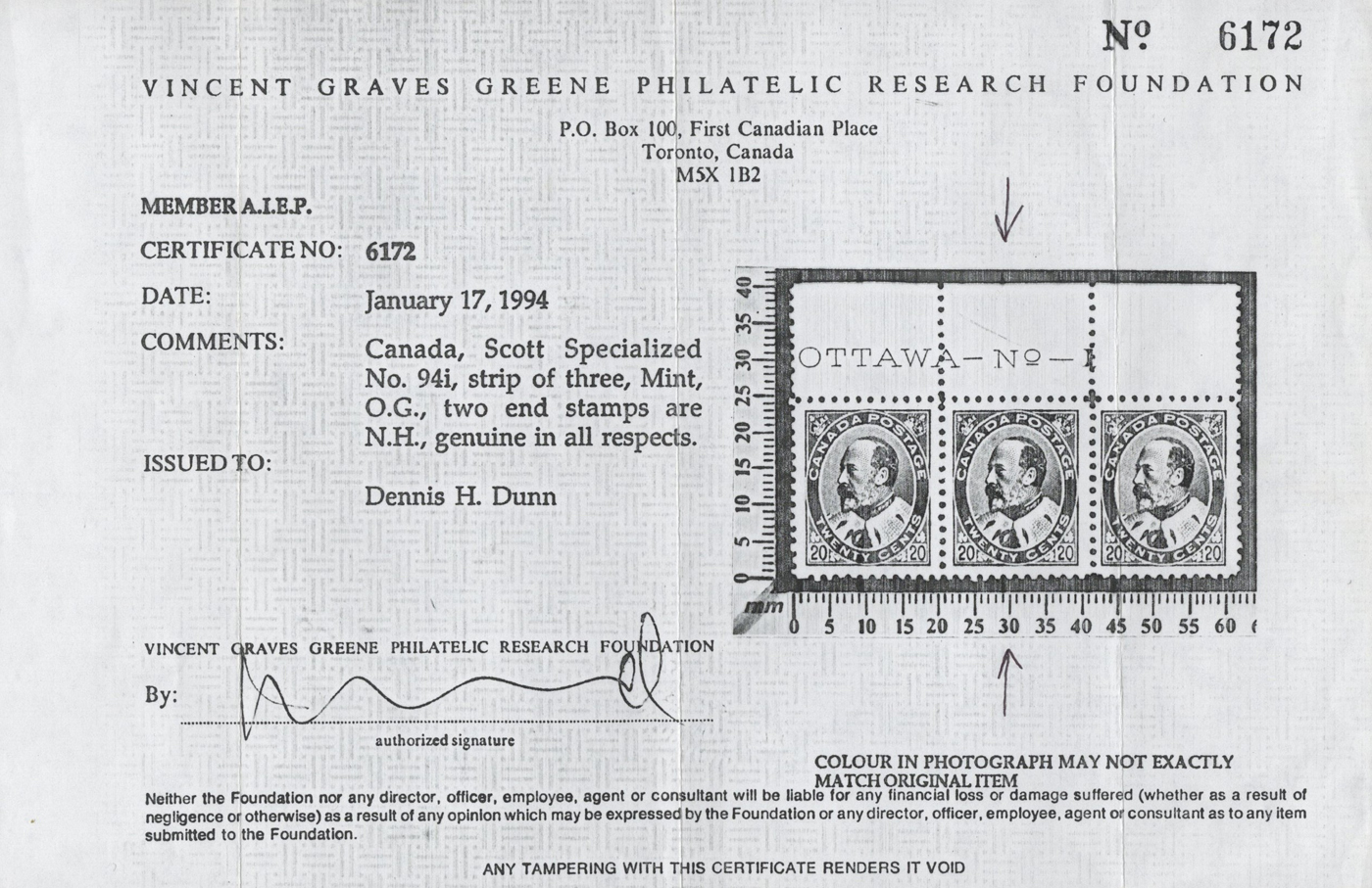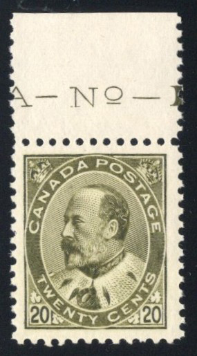 304 og 94i image1904 20c Deep Olive Green King Edward VII, mint lightly hinged, with sheet margin at top showing part of the plate 1 imprint. The stamp has deep rich colour and is very well centered within large margins, very fine. Accompanied by a photocopy of a Greene Foundation certificate for a plate strip of three, which this is the middle stamp, attributed to Dennis H. Dunn. (Scan 1) (Scan 2) (All Scans)