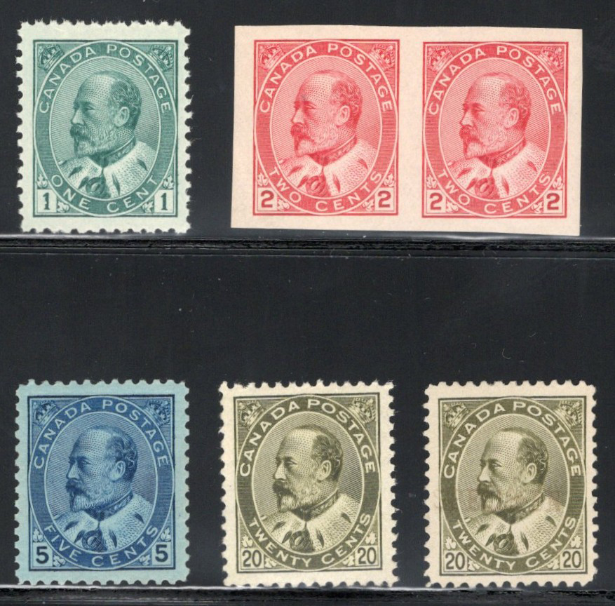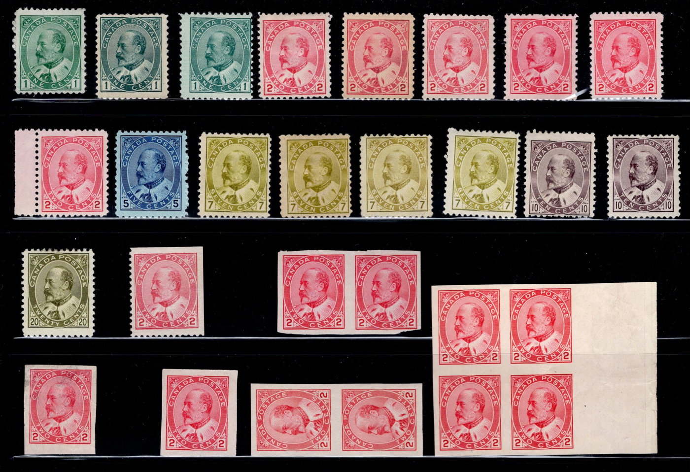 307 og/nh 89-94 imageAccumulation of Mint 1c to 20c King Edward VII Issues, all hinged except where noted otherwise, with the 1c (x3, two of which have no gum), 2c (x6, incl. one NH with small wrinkle), 5c (NH but creased), 7c (x4, one with light crease), 10c (x2, each with somewhat sweated gum), and 20c. Also includes an upper right corner booklet single and some imperforates: two singles, two pairs (one is NH) and a NH block of 4 with sheet margin. A mostly fine or better group.