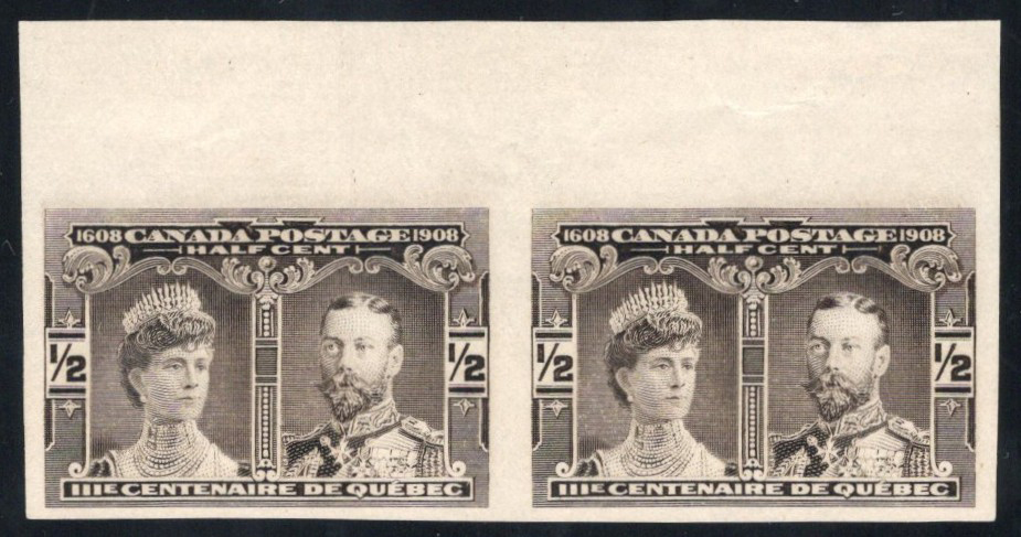 311 og 96a image1908 ½c Black Brown Québec Tercentenary Imperforate, a mint horizontal pair from top of sheet, with original hinged gum, very fine. A rare pair, as only 50 gummed pairs can exist, with even fewer having sheet margins.