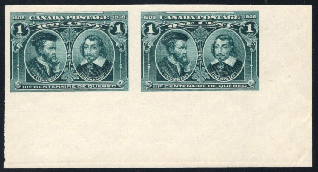314 ng 97ii image1908 1c Green Québec Tercentenary Imperforate, an unused (no gum, as issued) horizontal pair from the lower right corner of the sheet, very fine. A rare pair, as only 50 ungummed pairs can exist, with even fewer having sheet margins, and this is the unique LR corner pair.