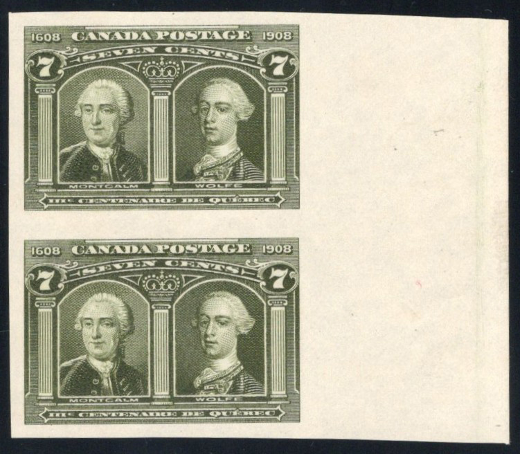 320 ng 100i image1908 7c Olive Green Québec Tercentenary Imperforate, an unused (no gum, as issued) vertical pair with sheet margin at right, very fine. A rare pair, as only 50 ungummed pairs can exist, with even fewer having sheet margins.