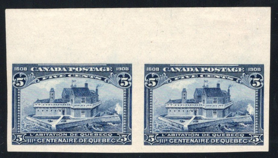 318 og 99a image1908 5c Blue Québec Tercentenary Imperforate, a mint lightly hinged horizontal pair with sheet margin at top, very fine. A rare pair, as only 50 gummed pairs can exist, with even fewer having sheet margins.