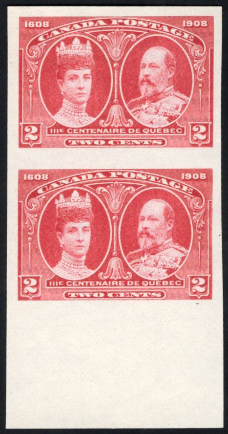 316 ng 98ii image1908 2c Carmine Québec Tercentenary Imperforate, an unused (no gum, as issued) vertical pair with sheet margin at bottom, very fine. A rare pair, as only 50 ungummed pairs can exist, with even fewer having sheet margins.