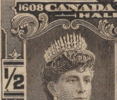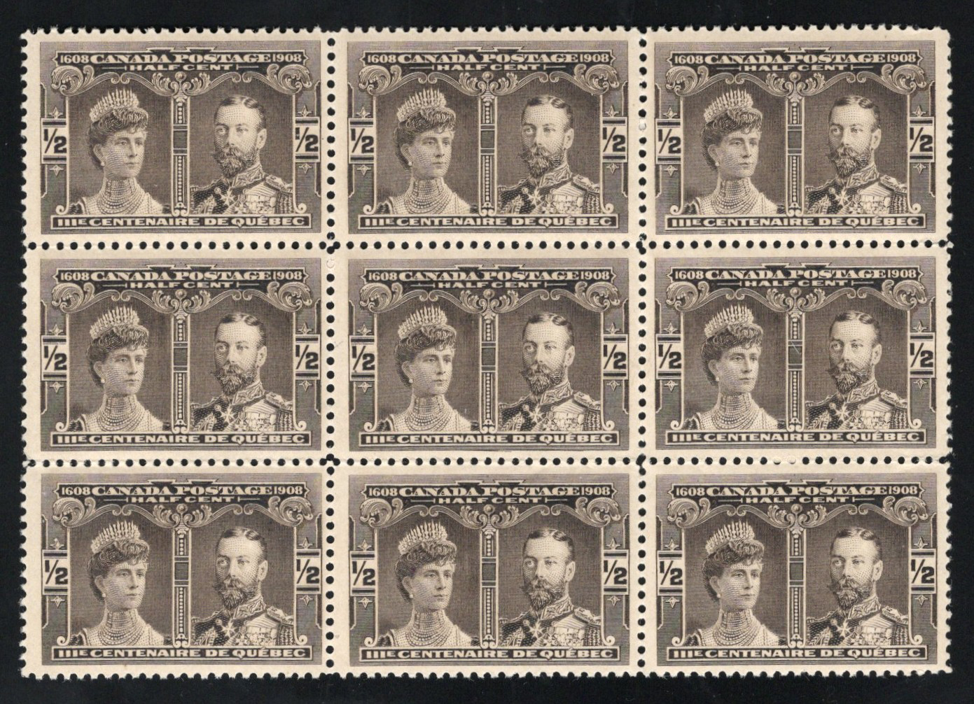 310 og/nh 96, 96i image1908 ½c Black Brown Québec Tercentenary with Major Re-Entry, the centre stamp in a mint block of 9, clearly showing the re-entry from position 44, being a horizontal line through ANAD of CANADA, plus an interesting large dot below the left value and a small dot below the "2" of the right value, etc. All stamps, including the variety are never hinged, except for the lower left two stamps, which are lightly hinged. A very fine variety block. (Scan 1) (Scan 2) (All Scans)