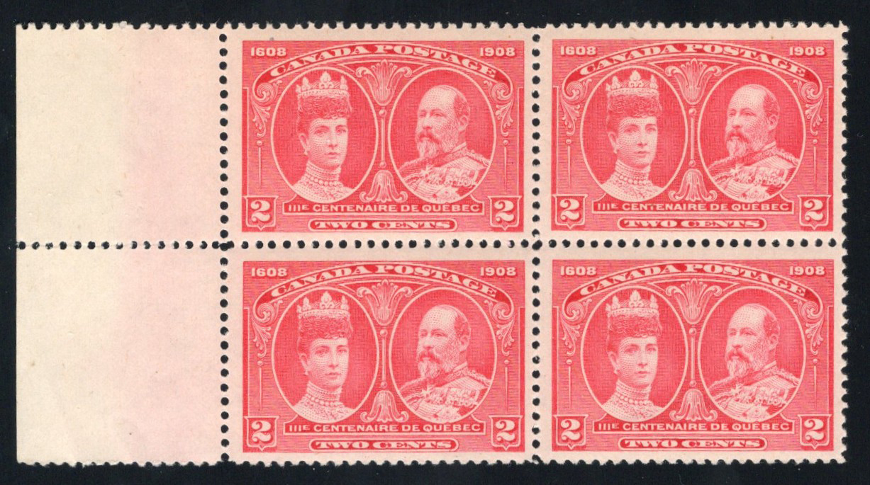 315 nh 98 image1908 2c Carmine Québec Tercentenary, a mint never hinged block of 4 with sheet margin at left, fresh with bright colour, very fine.