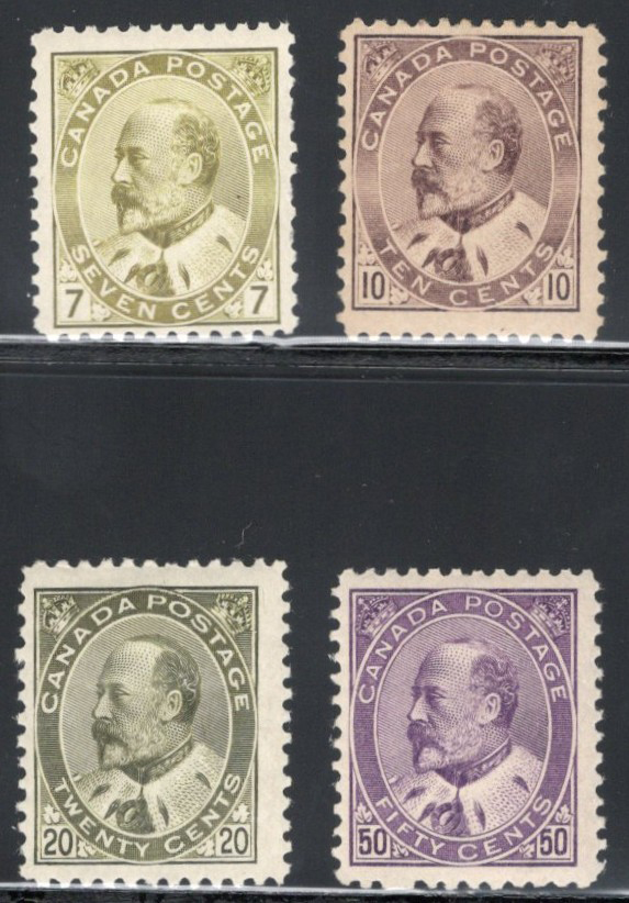 309 og 92-95 imageGroup of Four King Edward VII High Values, with the 7c, 10c, 20c and 50c, each is mint hinged to very lightly hinged (the 50c), overall fine to slightly better (the 50c).
