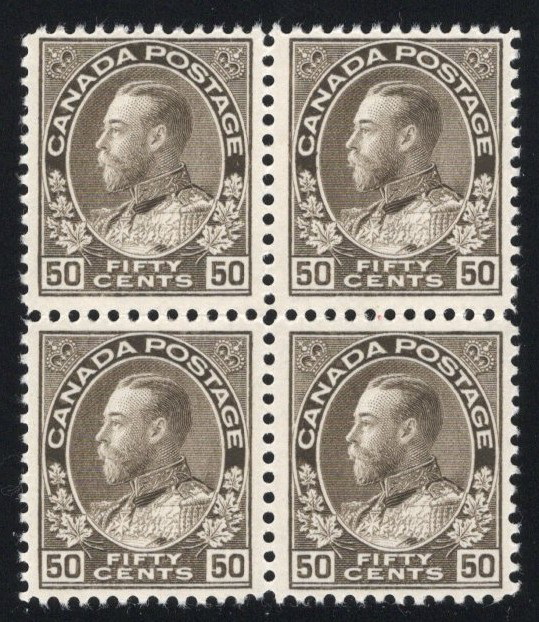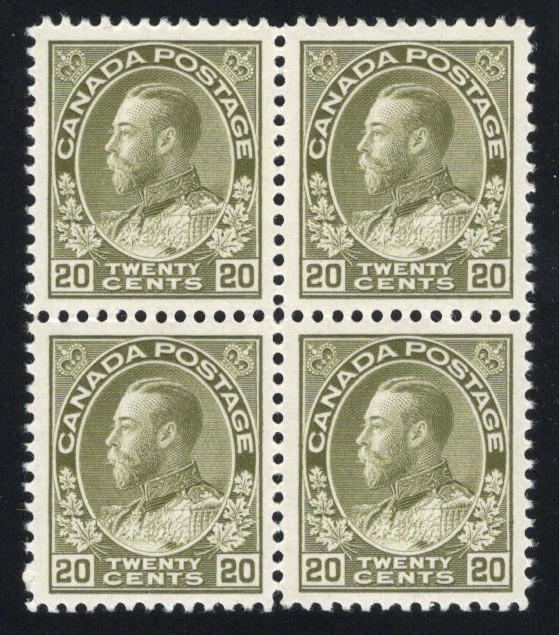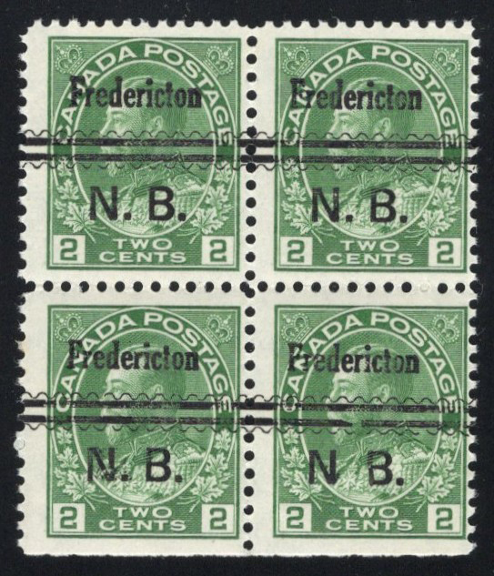 Green Admiral, Dry Printing, with Fredericton N.B. Precancel, a mint never hinged block of four with fresh colour and crisp impression of the precancel, fine. A scarce never hinged Admiral precancel, this nice.