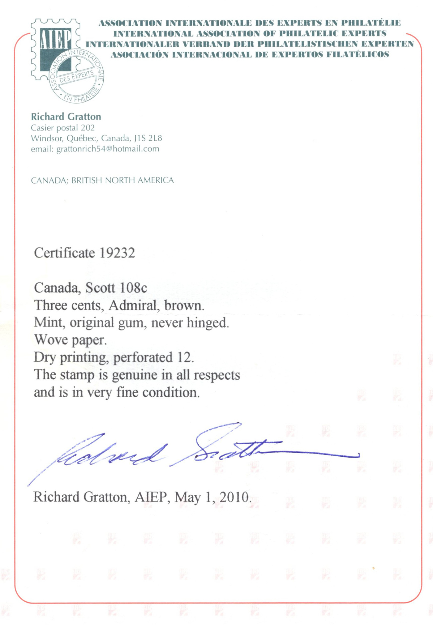 Admiral, Dry Printing, mint never hinged and well centered within four large margins, fresh and extremely fine. Accompanied by a 2010 Richard Gratton AIEP certificate. (Scan