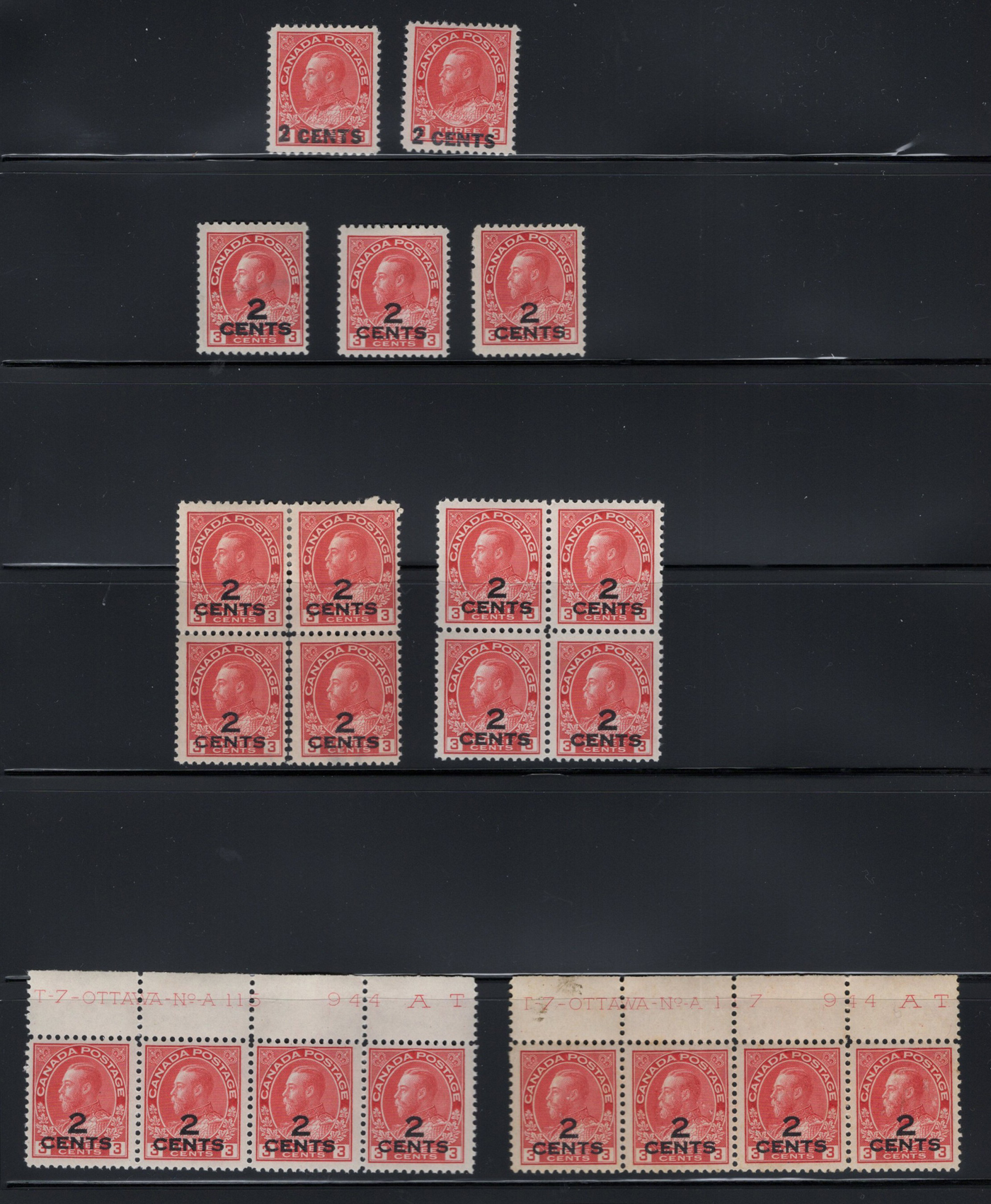 Admiral Provisional Surcharges, all mint hinged except where noted, with #s 139 (x2 singles) and 140 including 3 singles, 2 blocks of four (one is partially separated, both have light overall gum glazing) plus two plate strips of 4 (plate 115 is
