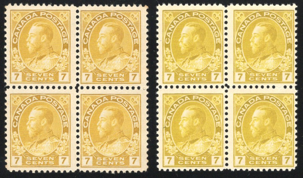 Ochre and Olive Bistre Admiral Issues, both in mint never hinged blocks of four, fine.