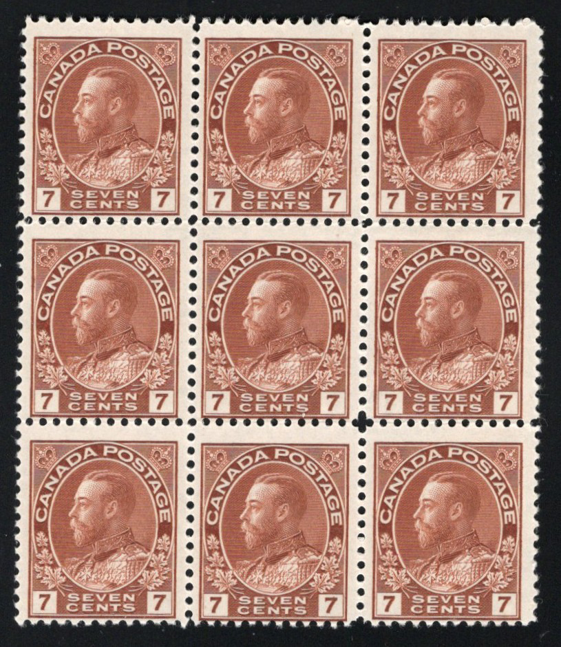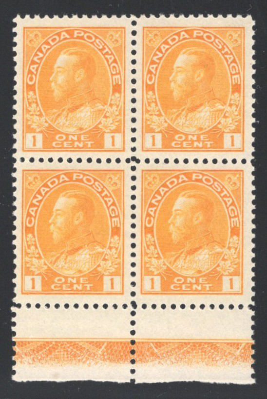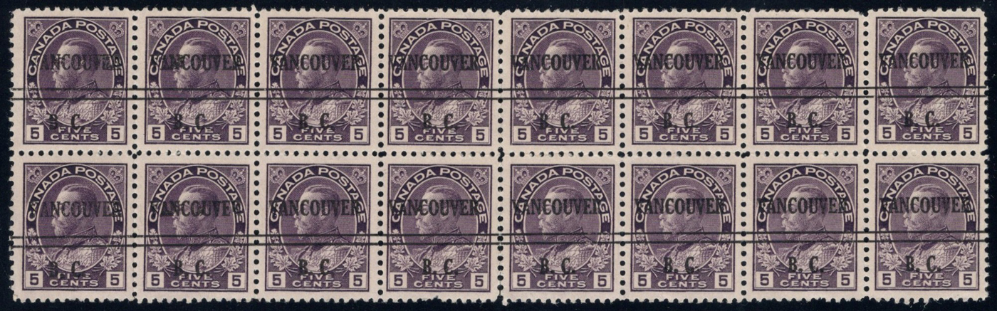Admiral, Wet Printing with Vancouver BC Style 2 Precancel, a mint never hinged block of 16, with each stamp being very nicely centered. We noticed a few broken bars, as listed in the catalogue. A few stamps show a bit of gum disturbance, and the