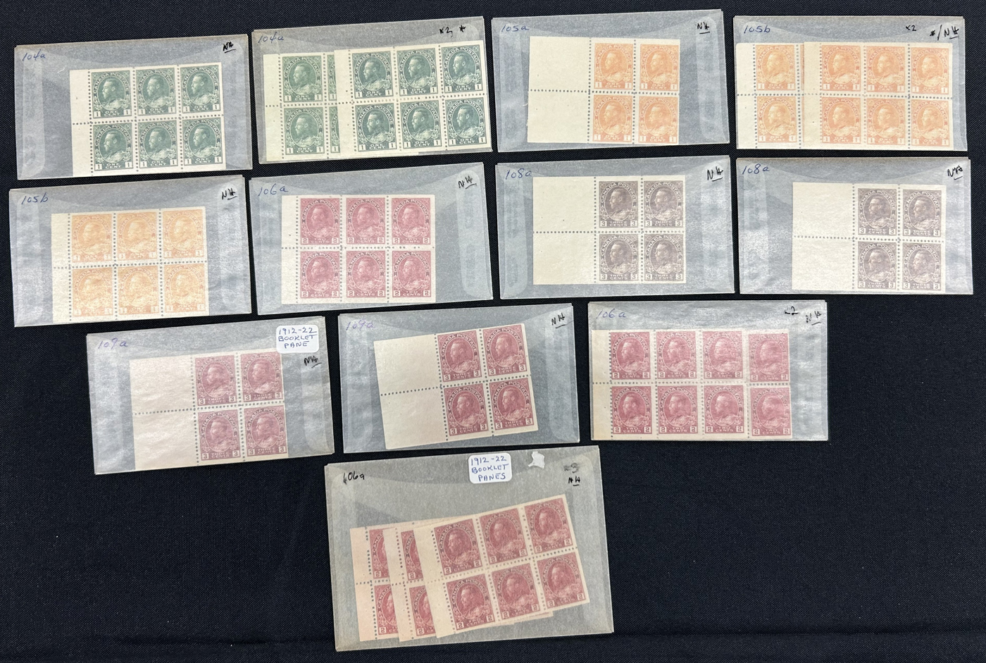 Booklet Panes, with a total of 17 panes, with duplication of some. Three paned are hinged, rest are never hinged. Overall fine or better.