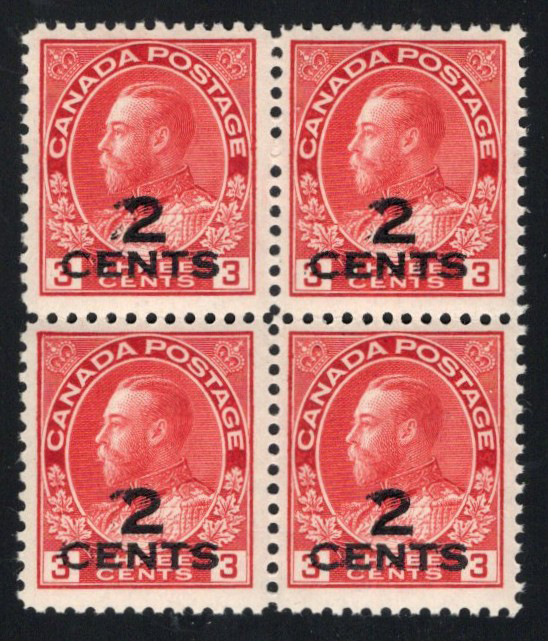 Admiral Provisional with Double Two-Line Surcharge, a mint block of four showing a clear doubling of the "2" and small parts of CENTS on each stamp. The block has gum disturbance on all stamps and was counted as hinged, very fine with bright