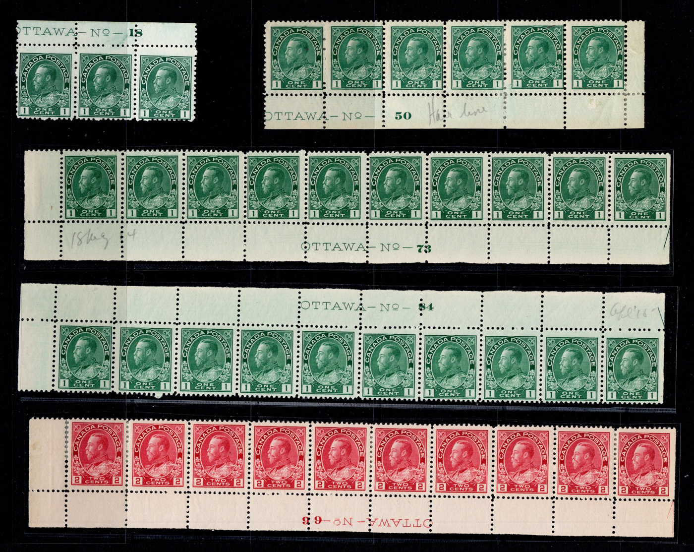 Admiral Plate Inscription Strips, with 1c green (NH lower strip of 10, plate 73), 1c green (upper strip of 10, plate 84, stamps are NH), 1c green (lower right strip of 6, plate 50, showing hairlines), 1c green (upper strip of 3, plate 18, stamps