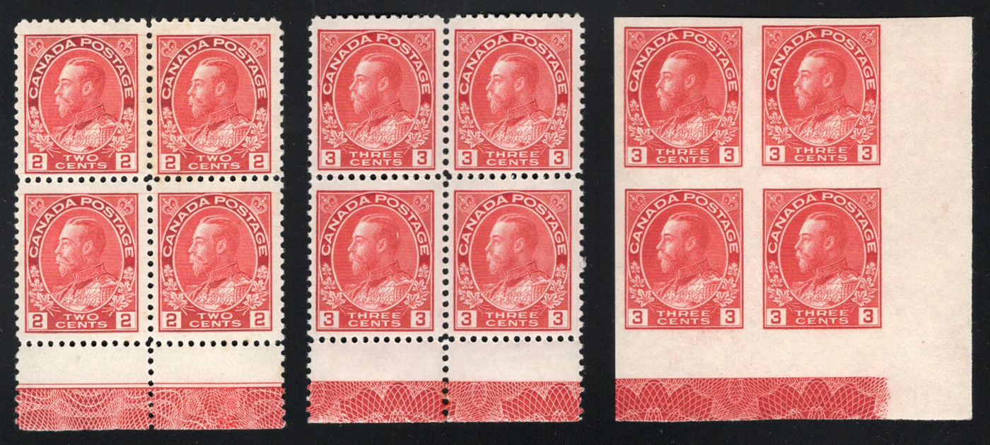 Admiral Blocks with Full Lathework, all mint, with #s 106 (2c carmine block with hairlines (106ix?) with Type B, top are hinged bottom NH), 109 (NH block with fingerprint on one stamp, Type D) and 138 (3c imperforate lower right corner block, top