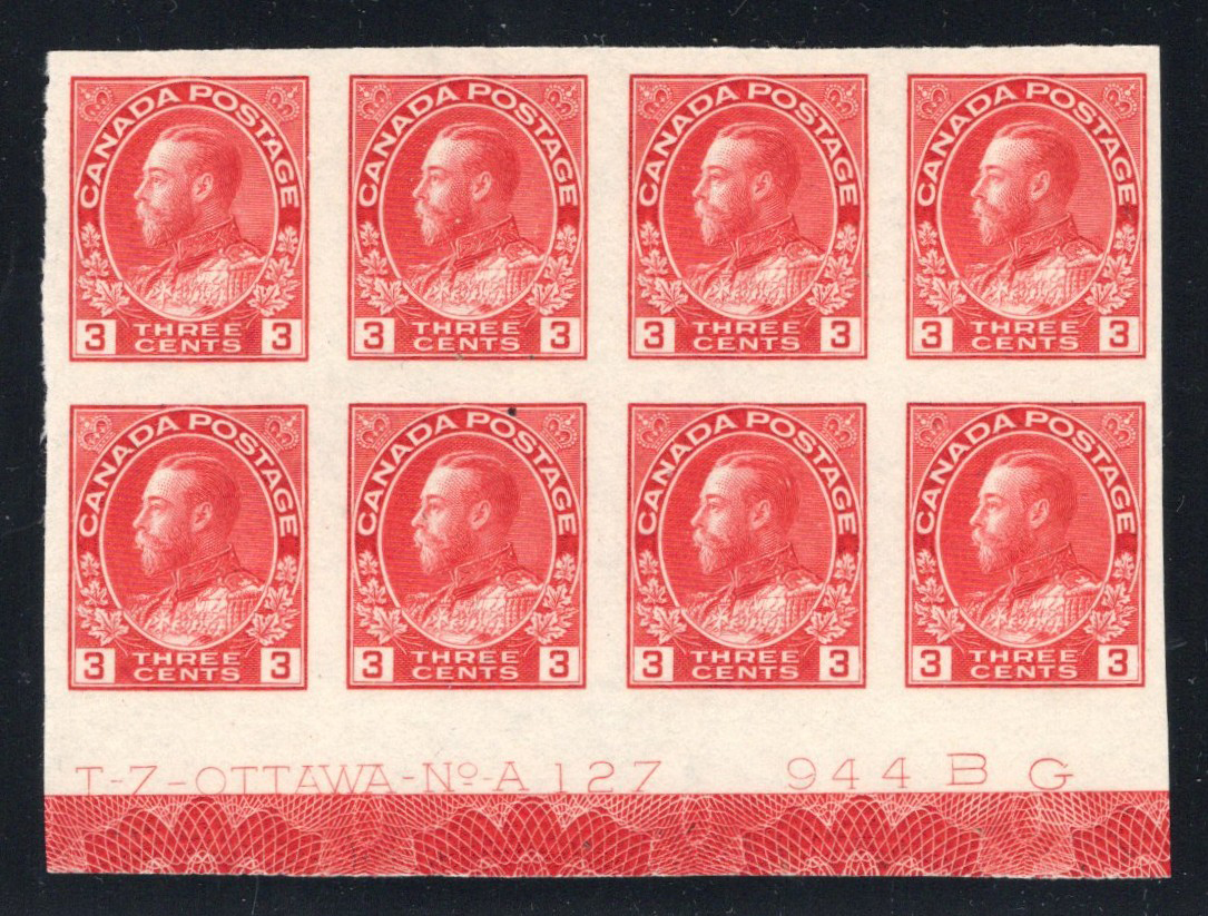 Admiral Imperforate, with Full Type D Lathework, a mint never hinged lower sheet margin block of 8, with full plate 127 inscription just above the full lathework, fresh and very fine.