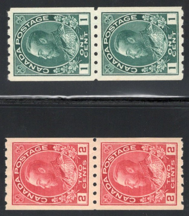 Admiral Coils, Perforated 8 Horizontally, both values are in mint pairs, with the top stamp hinged and the bottom never hinged, both also have exceptional centering and are extremely fine.