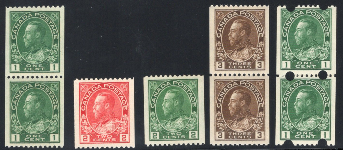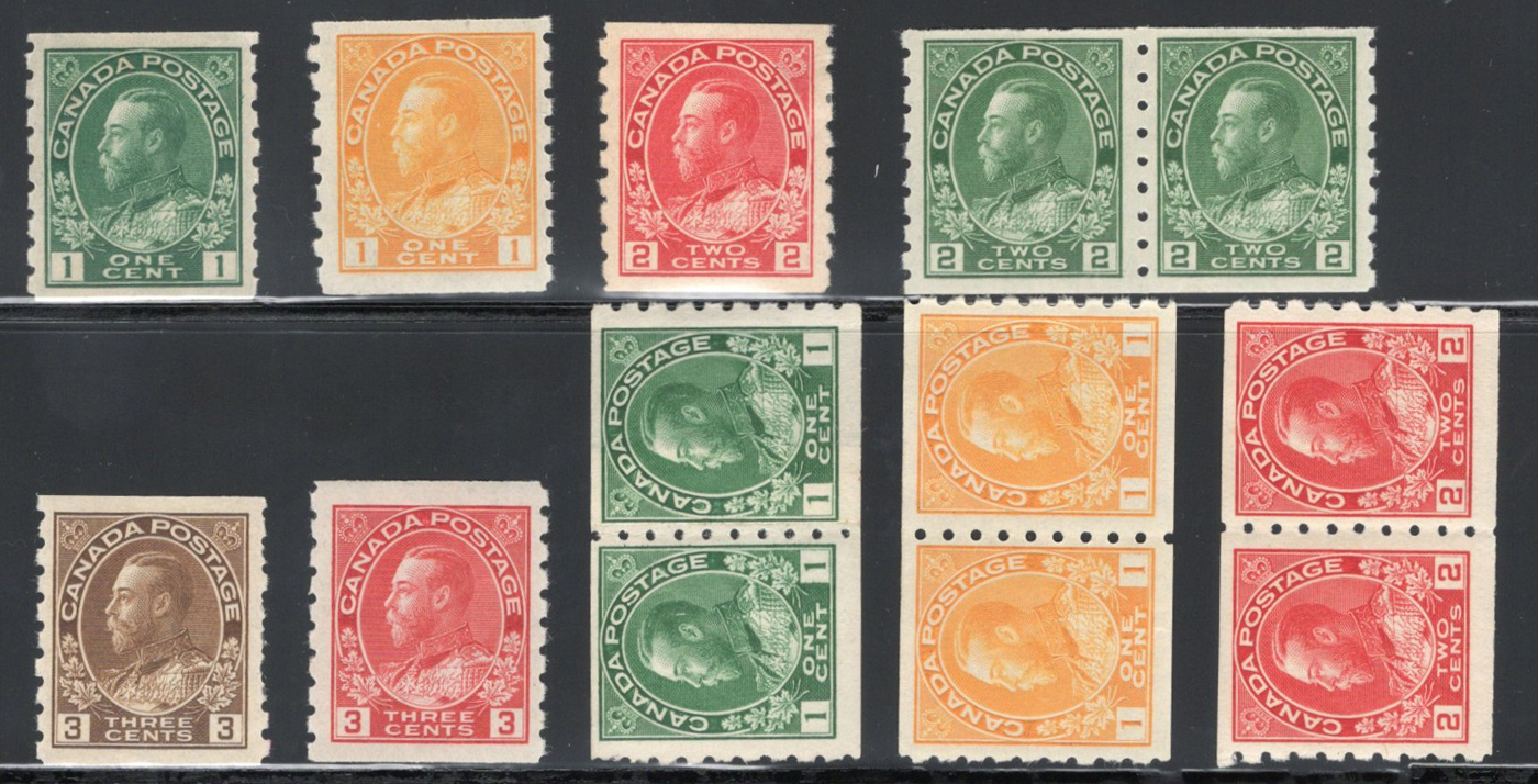 Admiral Coil Set, Perforated 8 Vertically, 1c green (hinged single and hinged paste-up pair), 1c yellow (NH single and NH pair), 2c carmine (hinged single and hinged pair), 2c green (NH), 3c brown (NH, blunt perfs) and 3c carmine (hinged). Mostly