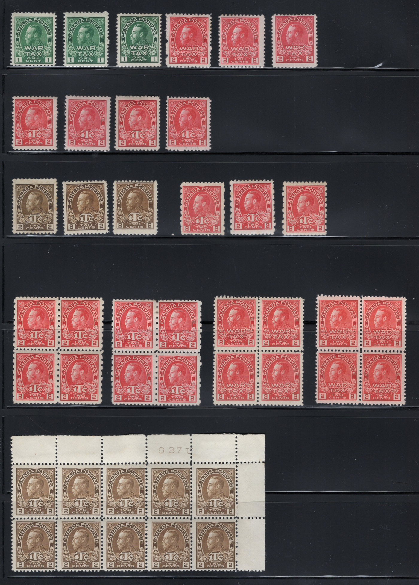 381 og/nh MR1-MR5 imageNice Group of Mint Admiral War Tax Issues, neatly displayed on a stock page. Stamps are hinged except where noted, with MR1 (3 singles), MR2 (3 singles plus a NH block of four), MR2a (block of four with 3 NH stamps), MR3 (4 singles), MR4 (3 singles, one has partial gum, one is NH), MR4 (upper right corner plate block of 10, NH except for one stamp with a gum thin), MR5 (3 singles plus two blocks of 4, one of the blocks with pulled perfs at right). Centering varies from fine to very fine, all stamps pictured online.