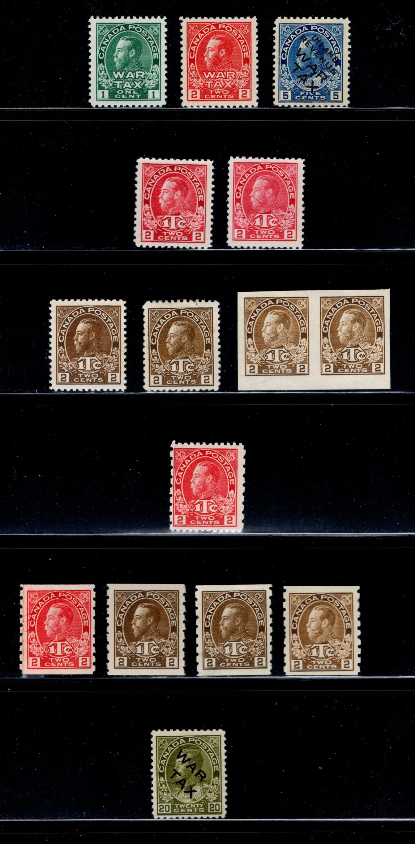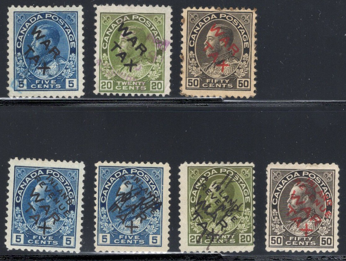 383 O/og MR2B-MR2Di imageGroup of Mostly Used Admiral War Tax Issues, with the three WAR TAX diagonal overprints ((5c and 20c are cancelled, 50c is faulty) and the three INLAND REVENUE WAR TAX diagonal overprints (5c and 20c are cancelled, a second 5c and 50c are mint hinged with gum thins). An overall fine group.