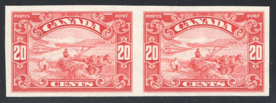 400 nh 157a image1929 20c Dark Carmine Harvesting Wheat Imperforate, a mint never hinged horizontal pair, very fine.